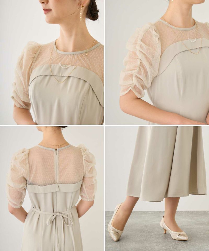 デコルテ、袖部分をシアー素材切り替えにすることでメリハリを持たせ、
