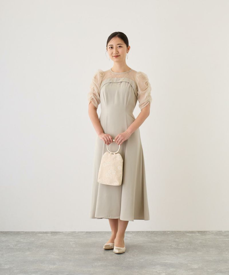 シンプルなデザインに、シアーなダイヤ柄チュールを組み合わせた女性らしさ際立つワンピース