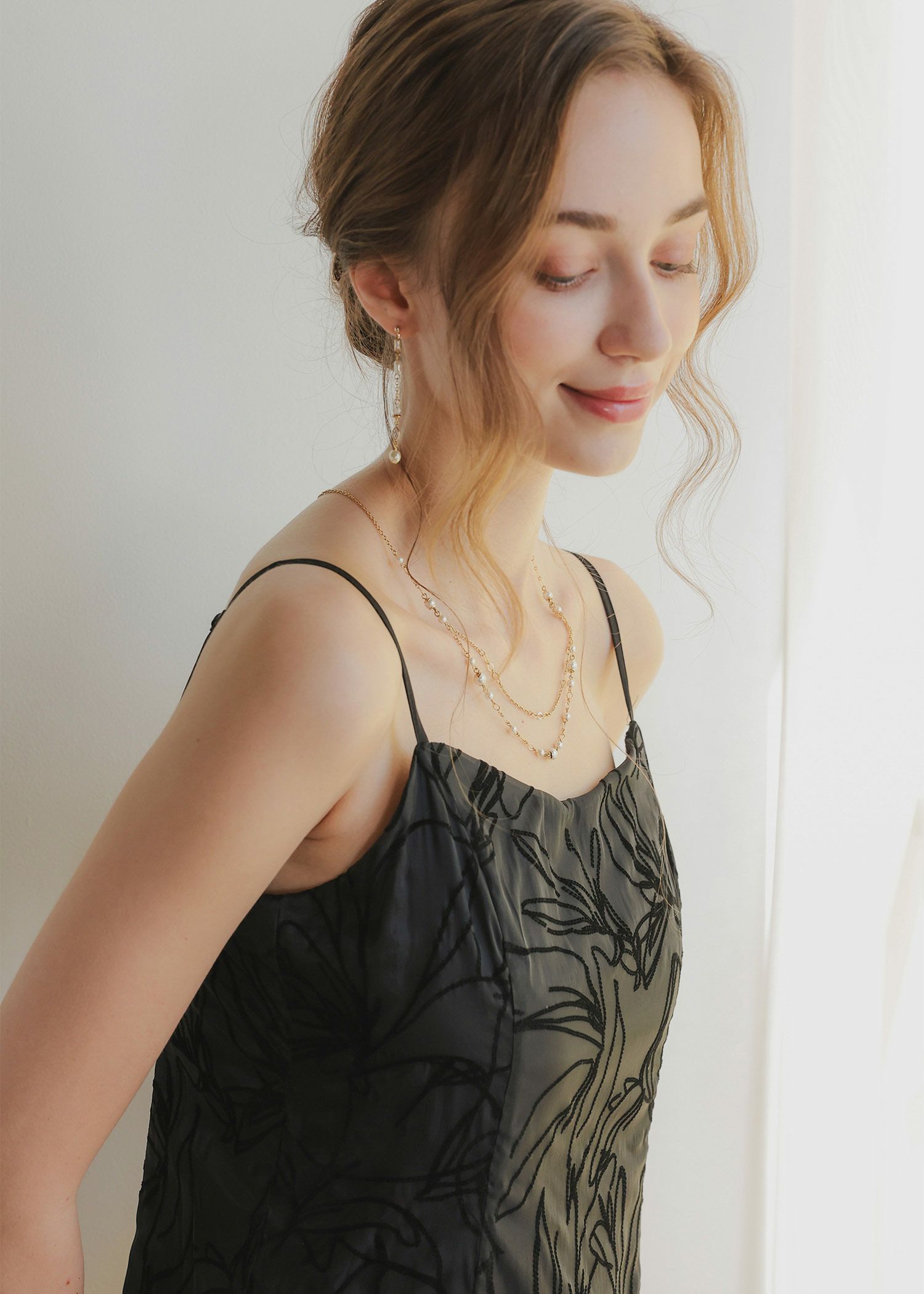 ボリュームのあるボレロに対して、ワンピースはすっきりとしたシルエットでメリハリを持たせ、
