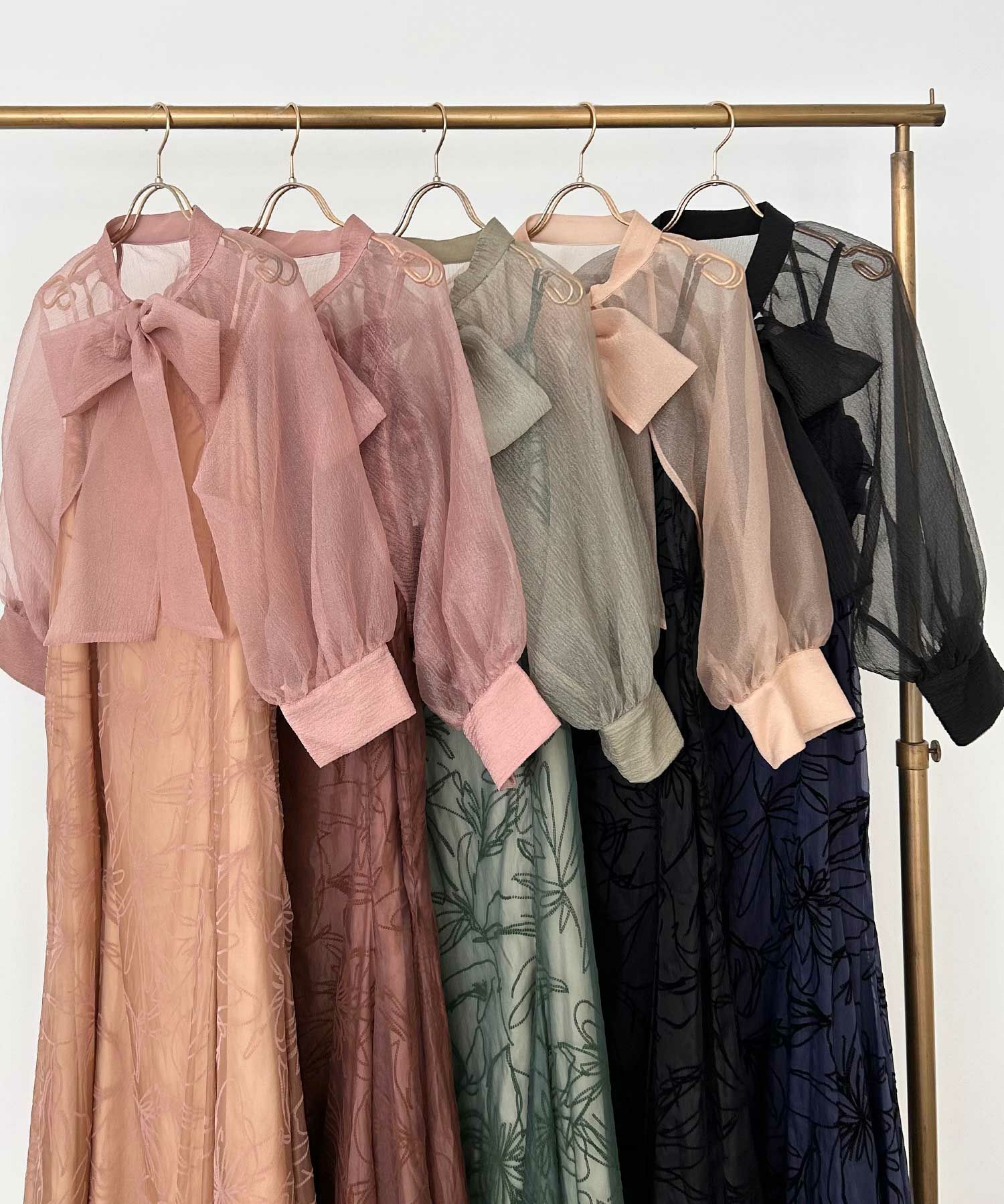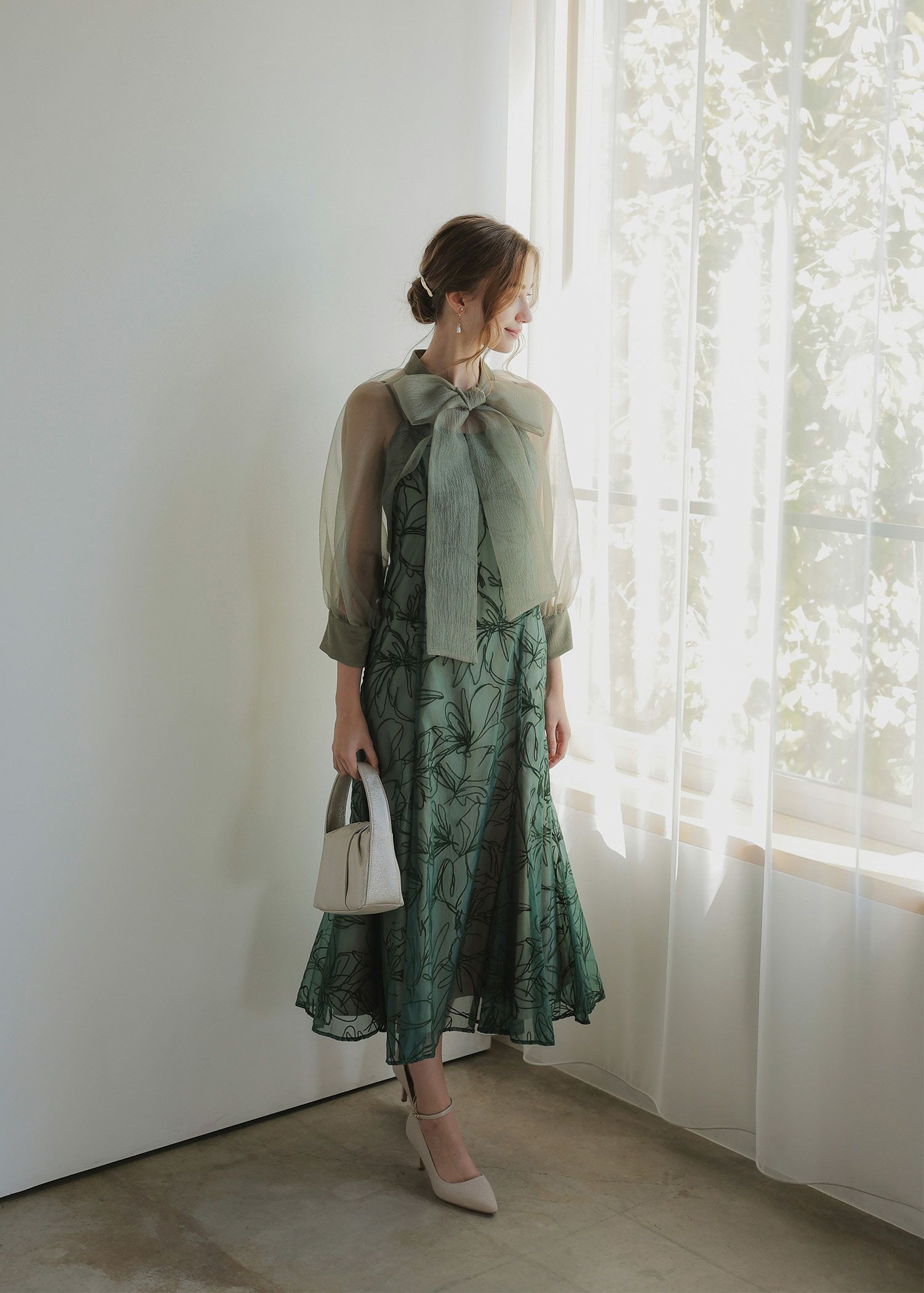 ボリュームのあるボウタイや、キャンディスリーブが、可愛らしさとどこかモードな雰囲気を漂わせる絶妙なデザインです。