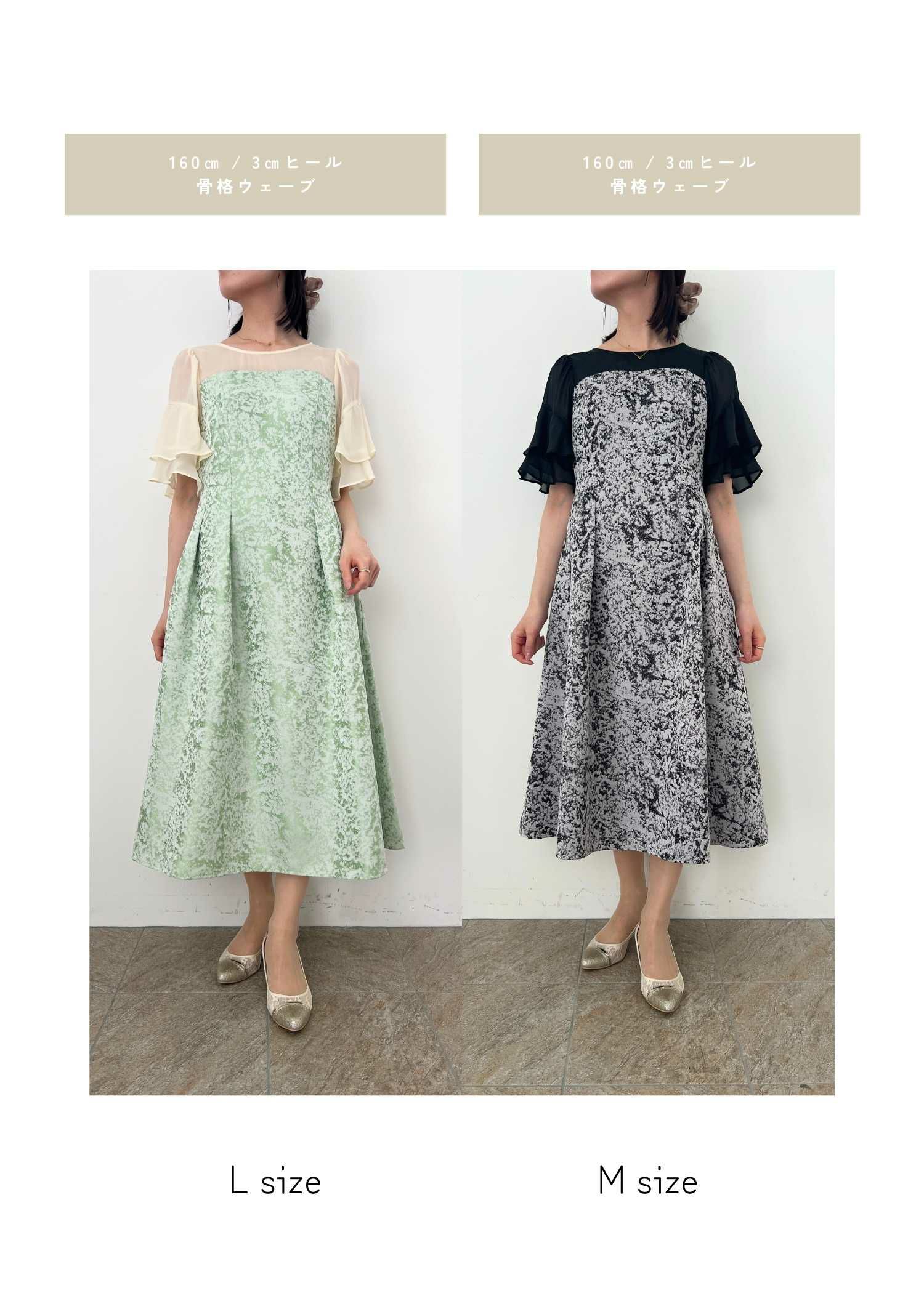 商品説明 モードライクな雰囲気のジャガード生地が目を引くオケージョンドレス。 デコルテと袖部分はシアー素材を使用し抜け感をプラス。 ラッフルスリーブがアクセントになり、肩周りをカバーしつつ 華奢見せさせてくれます。 程よい肌見せと袖のラッフルスリーブで女性らしく。 上半身映えするポイントをぎゅっと詰め込んだ一着。 フィット&フレアのシルエットでメリハリのあるスタイルに仕上がります。 少し短めの着丈なので、低身長の方にもおすすめです。 オケージョンシーンだけでなく、デイリーにも使いやすい大人のドレス。 結婚式や披露宴、二次会、ディナー、パーティー、お出かけなど幅広いシーンで大活躍してくれる一着です。 ※商品画像は、光の当たり具合やパソコンなどの閲覧環境により、 実際の色味と異なって見える場合がございます。予めご了承ください。 おすすめのシーン 結婚式・披露宴・二次会・同窓会・謝恩会など 多様なシーンのコーディネートに使えます。 商品詳細 【備考】 ・裏地あり ・伸縮性なし ・デコルテに透け感あり ・バックファスナー仕様 洗濯方法:クリーニング店にご相談ください。 ※その他お取り扱いに関しましては、商品に付属のアテンションタグをご覧ください。 原産国:中国 着丈バストウエストヒップ肩幅袖丈 M:111.590741033229 L:114.594781063330 単位(cm) ▼着用サイズ modelsize 外国人モデル身長176cm ▼着用サイズ全てMsize staff着用/身長153cm(ブルー・ブラック) staff着用/身長160cm(グリーン) お問い合わせ品番:25608 着丈ガイド REVIEW レビュー