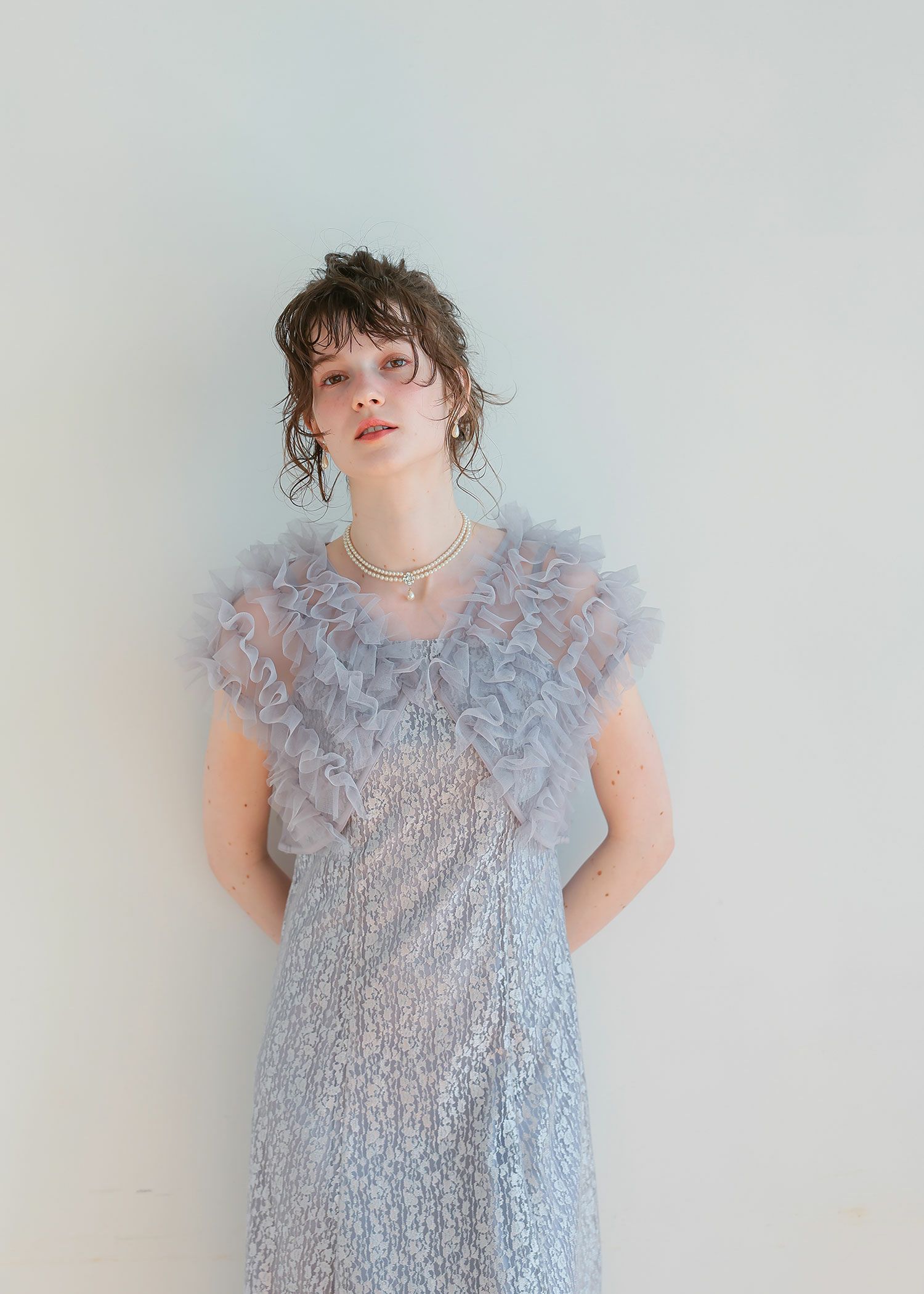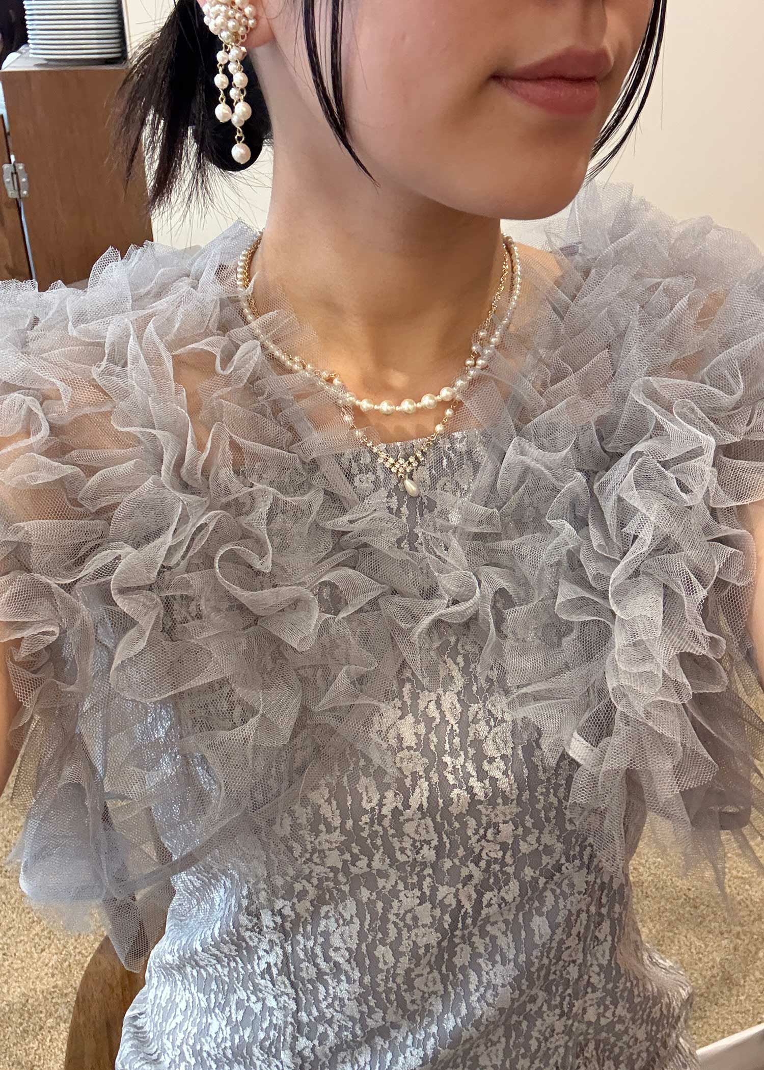 商品説明 ボリュームのあるフリルデザインと繊細なディテールが魅力の ボレロとワンピースがセットになったドレス。 フロントに施された繊細なチュールフリルがふんわりと肩を包み込み 二の腕をさりげなくカバー。 軽やかな透け感が上品な抜け感を与え、エレガントな雰囲気に。 ワンピースは抽象的な珍しい柄がアクセントとなり 光の角度によってラメがさりげなく煌めくため、派手になりすぎないデザインに。 身体のラインを拾いすぎず縦のラインをスッキリ見せてくれるため、脚長効果も期待できます。 ワンピースとボレロは分かれており、それぞれ単体での着用が可能です。 ※商品画像は、光の当たり具合やパソコンなどの閲覧環境により、 実際の色味と異なって見える場合がございます。予めご了承ください。 屋外の写真は通常より明るく見えています。 おすすめのシーン 結婚式・1.5次会・二次会・披露宴・お呼ばれ・成人式・同窓会 女子会・2次会謝恩会・パーティー・デート・演奏会・お食事会・ 発表会など多様なシーンのコーディネートに使えます。 商品詳細 【備考】 〈ボレロ〉 ・裏地なし ・透け感あり 〈ワンピース〉 ・裏地あり ・伸縮性なし ・後ろ背中部分ゴム入り ・背中心ファスナー 原産国:中国 お問い合わせ品番:25628 着用モデル身長176cm