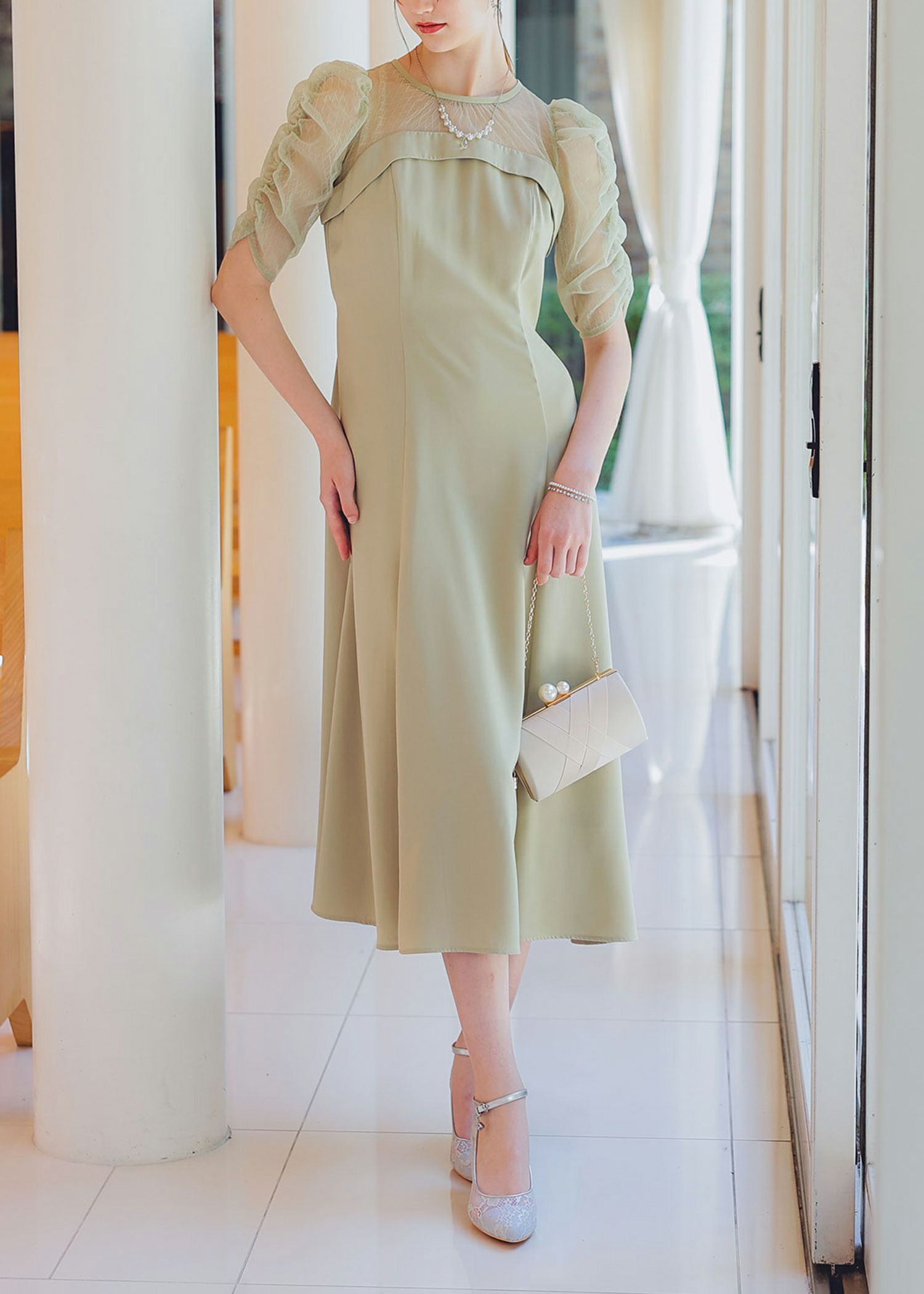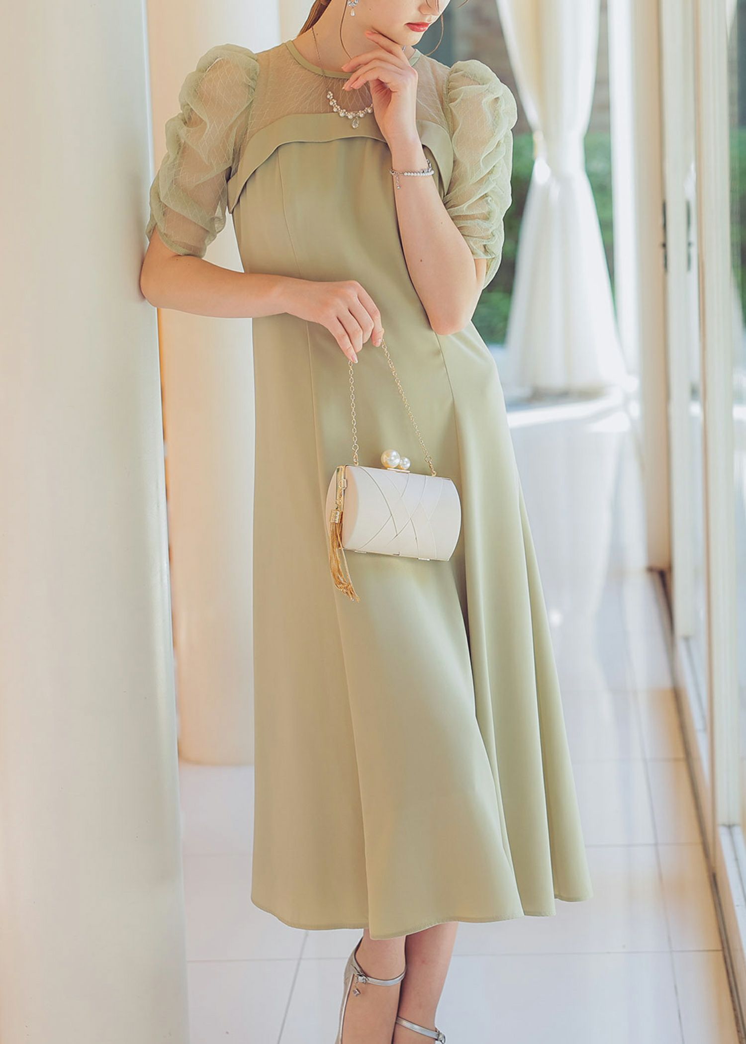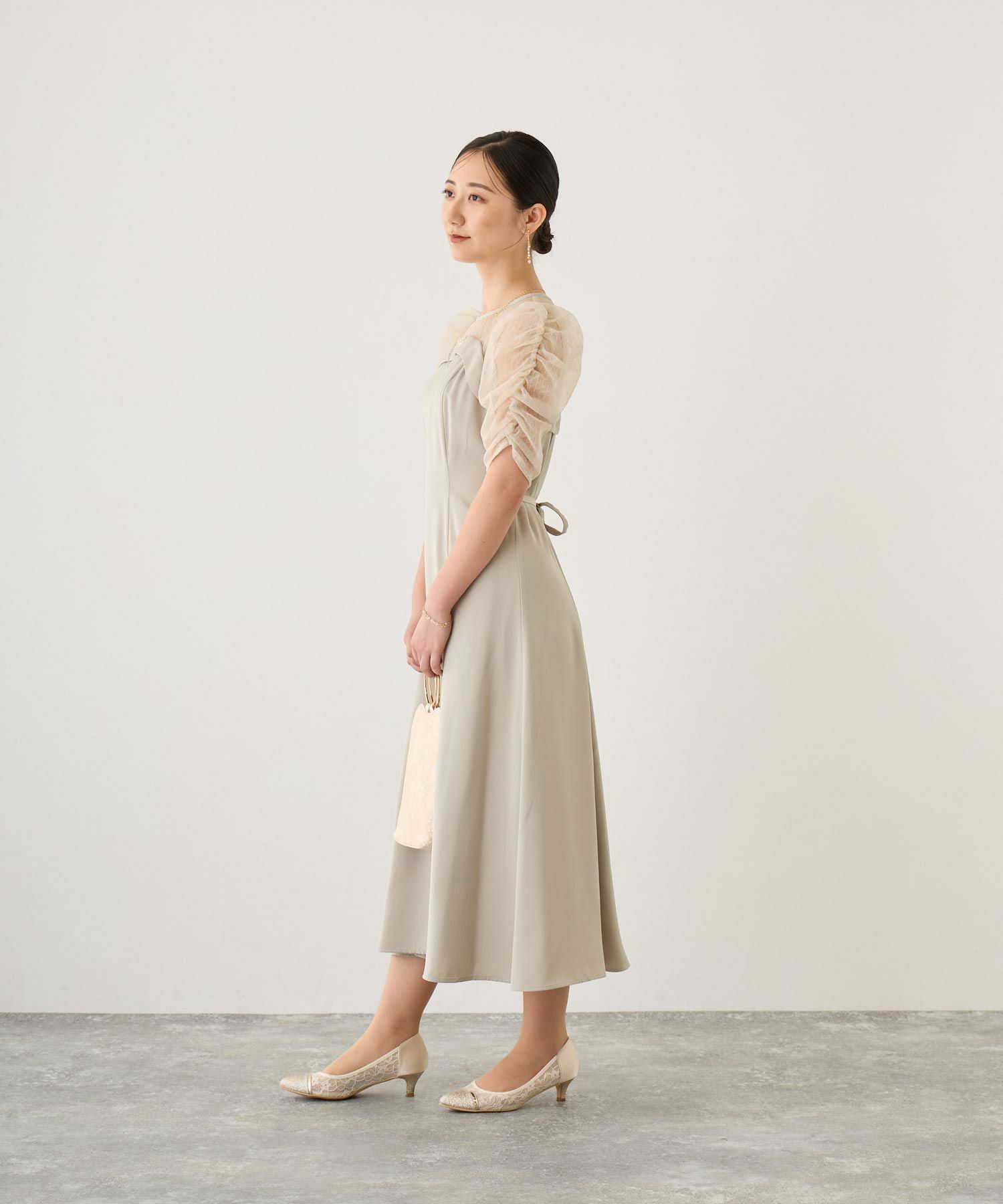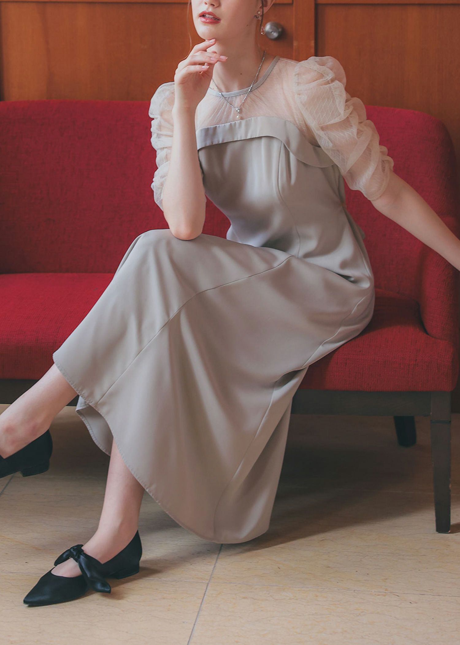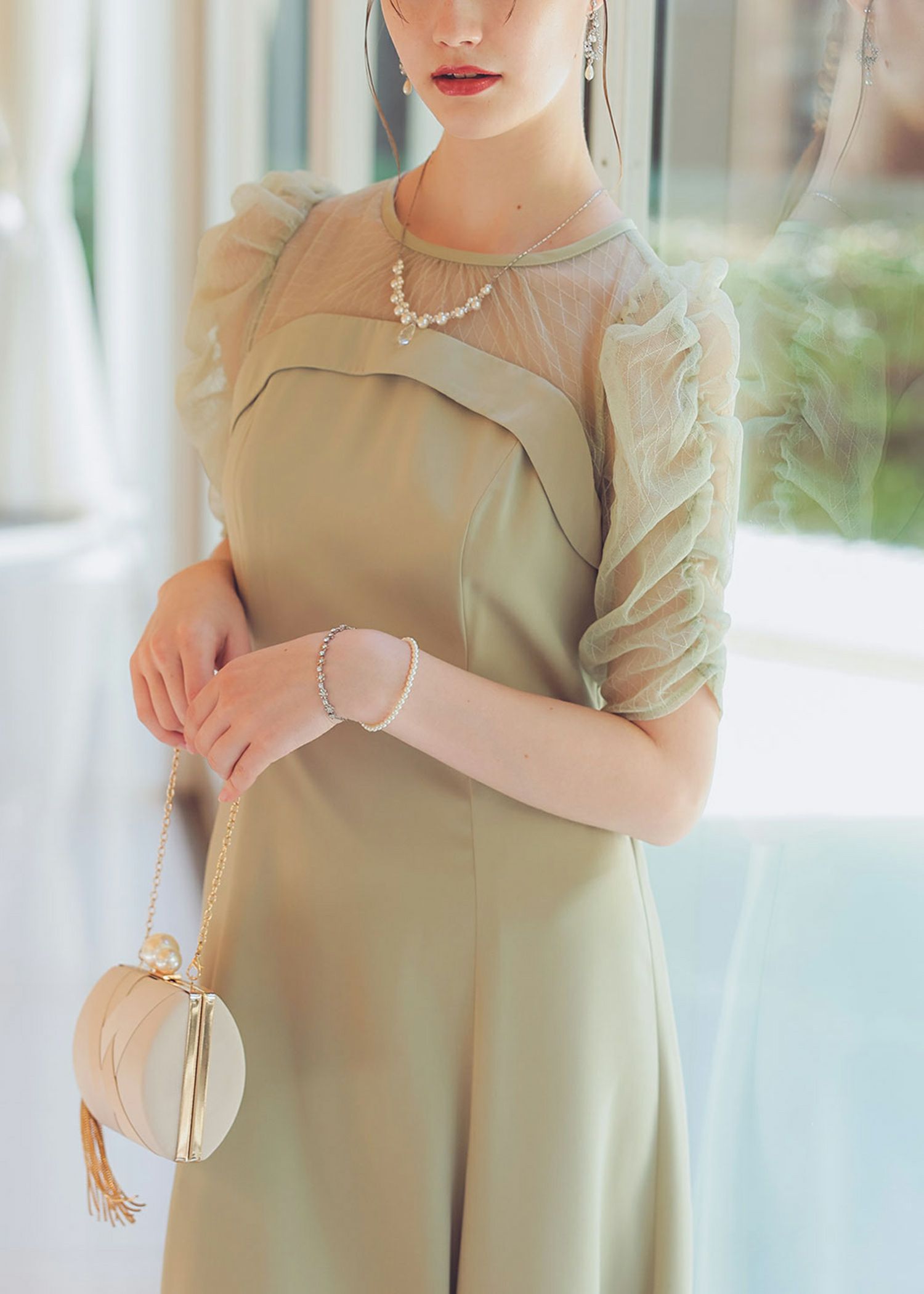 デコルテ、袖部分をシアー素材切り替えにすることでメリハリを持たせ、