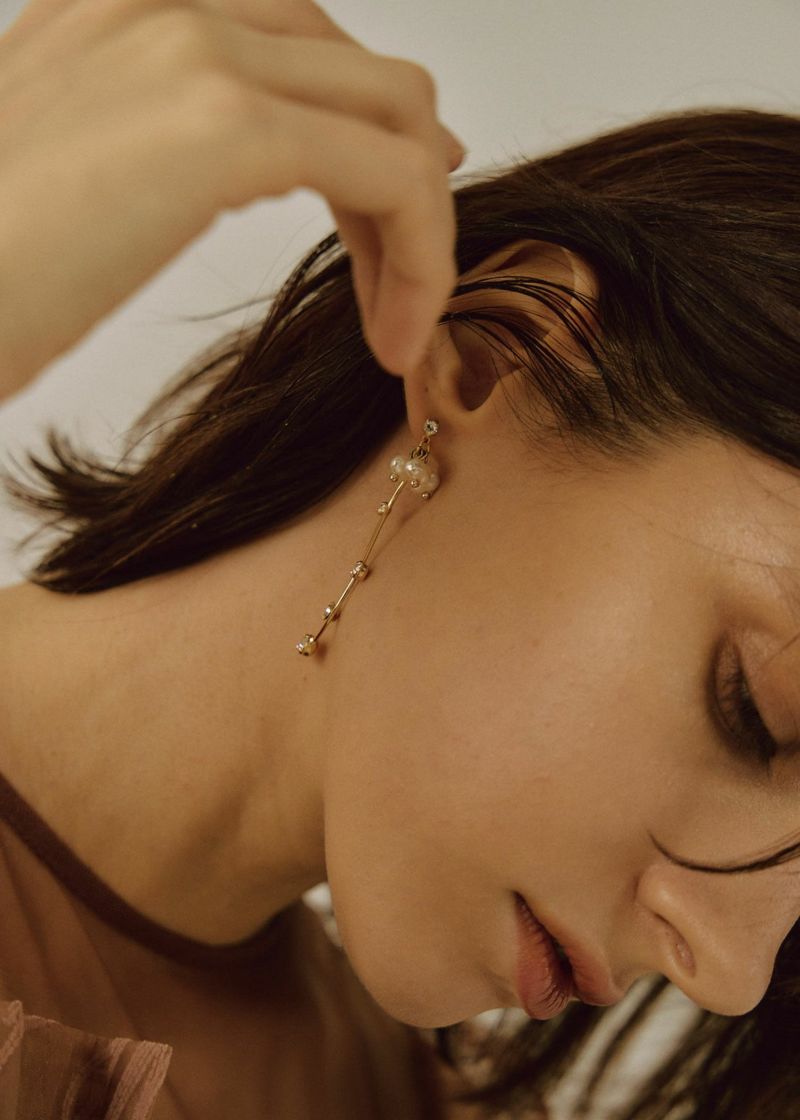 煌めくビジューと揺れるピアスの相性は抜群。 上品で女性らしい雰囲気を醸し出し 顔周りをさりげなく華やかに、演出してくれます。