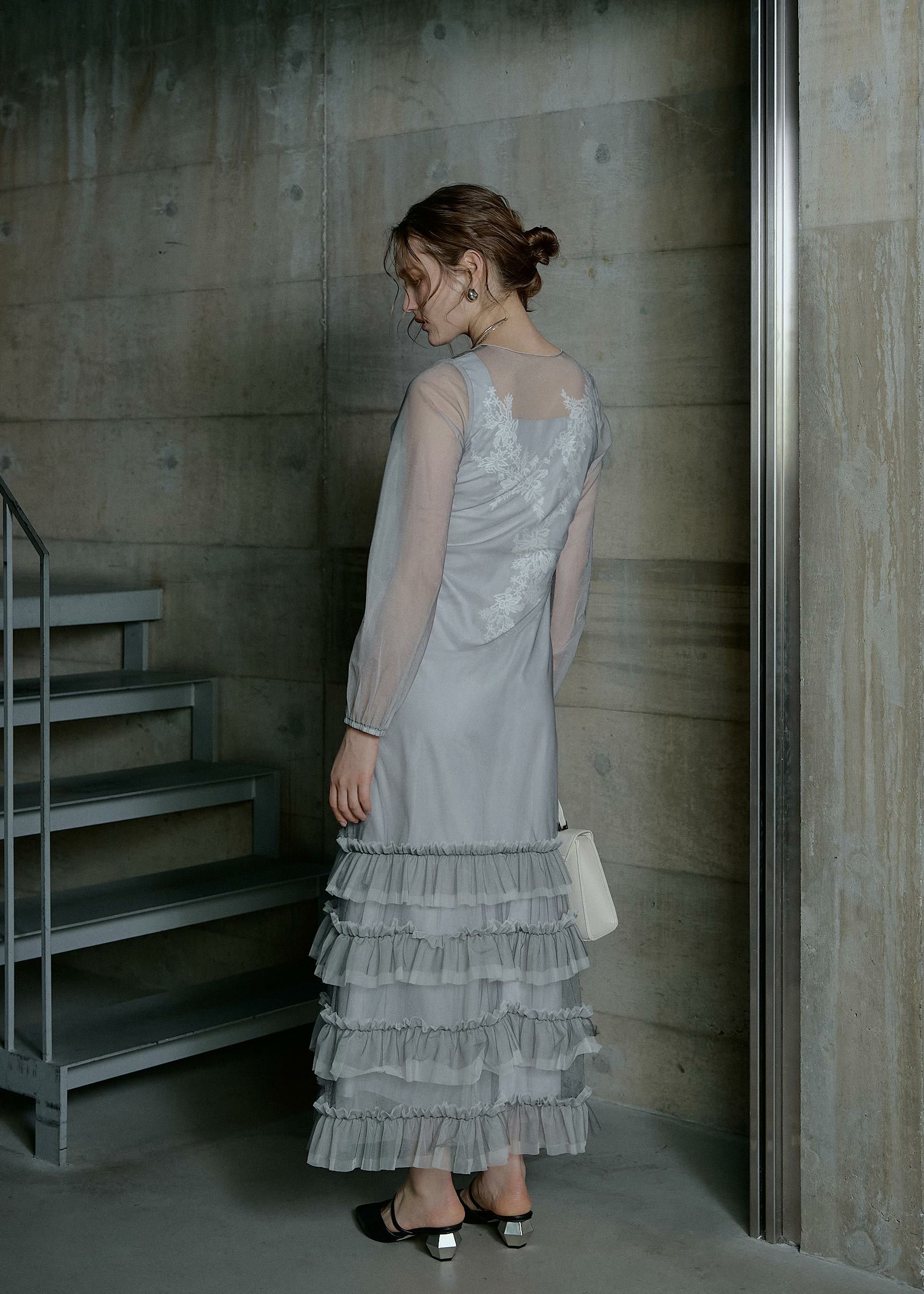 商品説明 ニュアンスに散りばめられたレーステープデザインと 裾のフリルチュールが華やかなワンピース。 ラメチュールとチュールの二層を重ねることで 陰影をつくり、レイヤードした風合いに仕立てました。 また、身頃部分にあしらわれたレーステープで さりげないアクセントを。 ボリューム感たっぷりの裾に施したチュールのフリルは LE'RUREらしい一癖をPLUS+ 4層目のフリルはシアーなデザインに落とし込み 足首がチラッと見えることで抜け感を演出し、 ゆるやかに広がるAラインで体系カバーにもぴったり◎ LE'RURE人気色のyellow, grayに加え、 大人モードにきまるblackの3色をご用意。 ※商品画像は、光の当たり具合や端末等の閲覧環境によって、 実際の色味と異なって見える場合がございます。予めご了承ください。 ※画像の商品はサンプルの為、実際の商品とサイズ感が異なっています。 予めご了承ください。 おすすめのシーン 結婚式・二次会・披露宴・成人式・同窓会・2次会 謝恩会・パーティー・デート・演奏会・お食事会など多様なシーンのコーディネートに使えます。 商品詳細 【備考】 ・裏地あり ・サイドファスナー仕様 ・襟ホック ・袖部分透け感あり 洗濯方法:クリーニング店にご相談ください。 ※その他お取り扱いに関しましては、商品に付属のアテンションタグをご覧ください。 原産国:MADE IN CHINA お問い合わせ品番:9609 着用モデル身長173cm