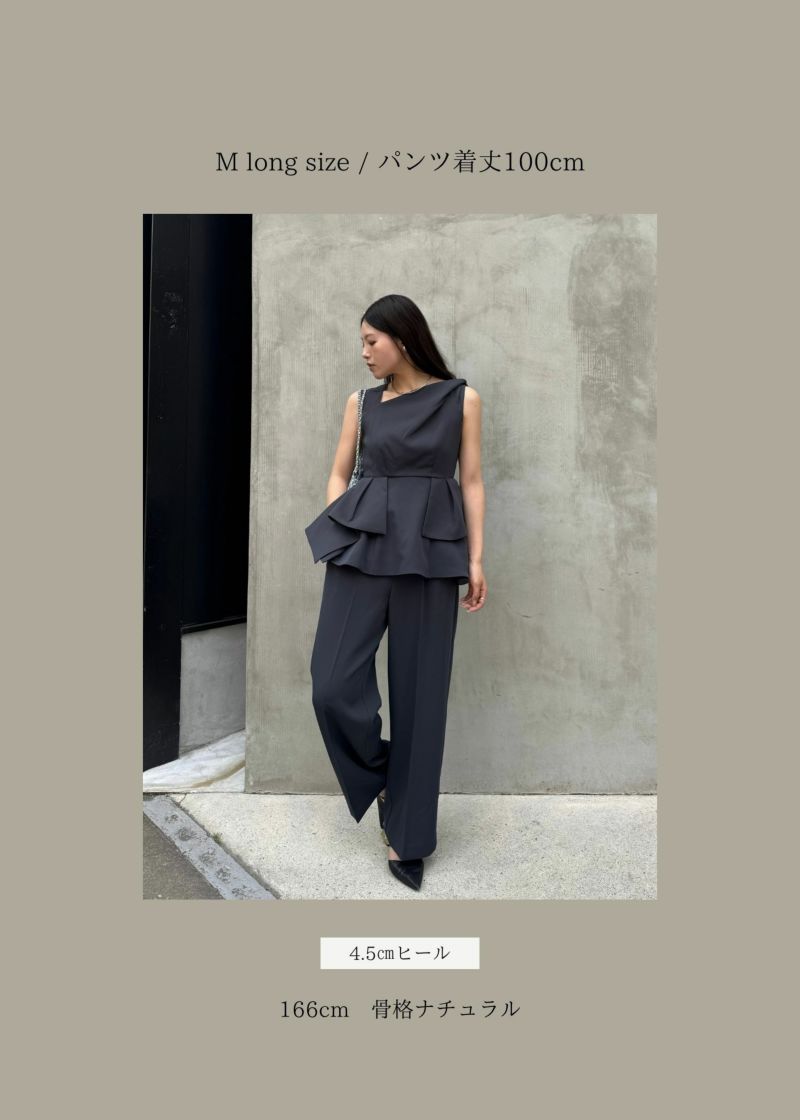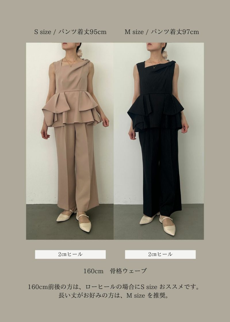 着丈バストウエストヒップ肩幅袖丈 S:トップス62?658585--36-- S:パンツ95--65?89101---- M:トップス64?678888--37-- M:パンツ97--68?92104---- M long:トップス64?678888--37-- M long:パンツ100--68?92104---- ※ トップス着丈は前後で変わります。 ※ トップスウエストはゴムを伸ばした状態の表記になります。 単位(cm) 【身長別 サイズ比較】 ・S サイズ 140cm台の方は5~7cmヒール推奨。 150cm?155cmの方は、5cm前後のヒールがおススメです。 ・M サイズ 156cm?160cm以下の方は、5cm前後のヒール推奨。 160cm以上のローヒールご着用方におススメです。 ・M long サイズ 158cm?160cm以下の方は、7cm前後のヒールでロング丈で着用可能。 160cm以上の高身長の方は4cm前後やローヒールで綺麗にご着用いただけます。 画像後方の身長別SNAPもご確認ください。 着用モデル 身長163cm / M long size お問い合わせ品番:9590