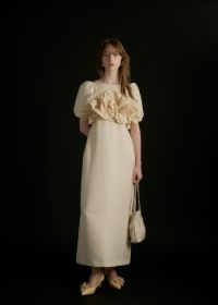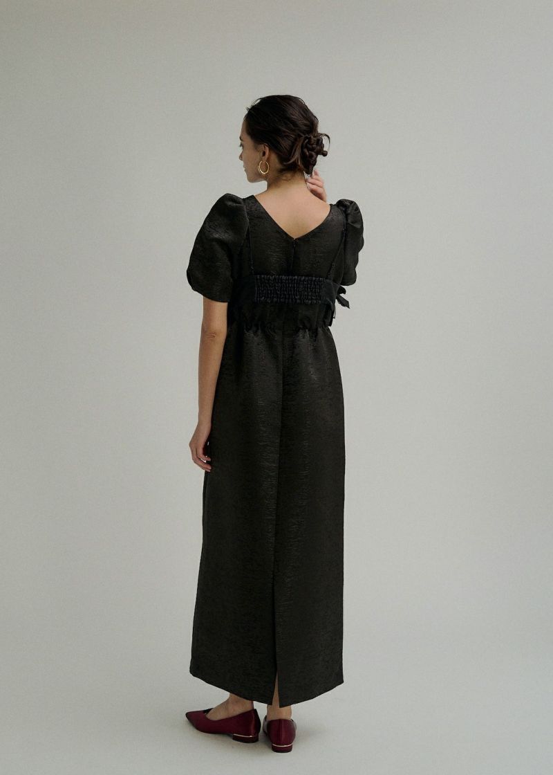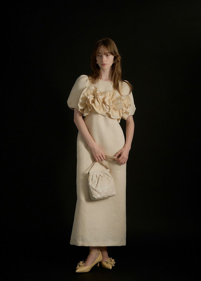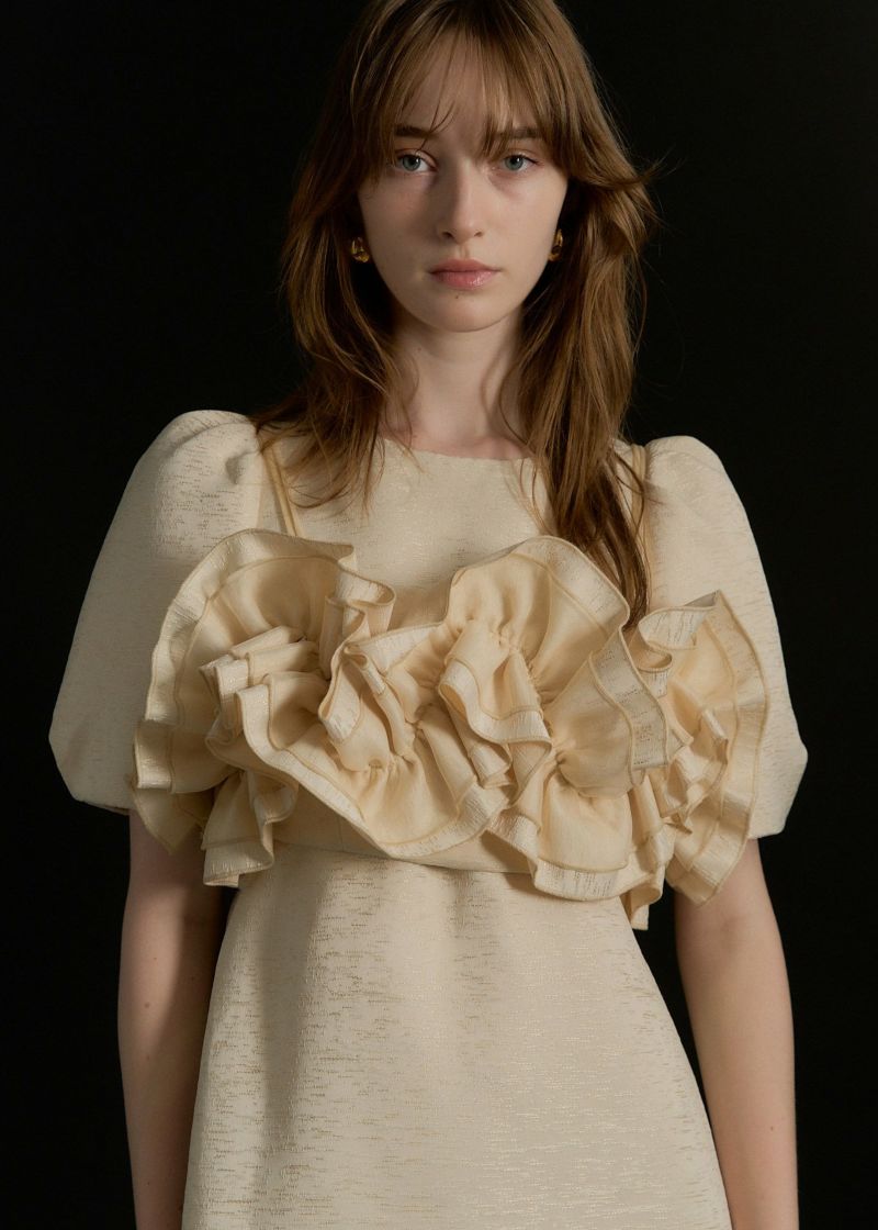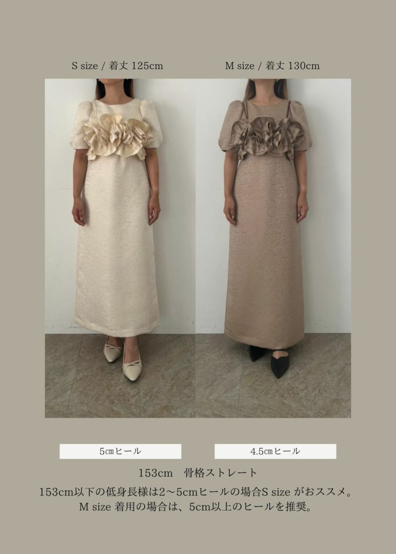 商品説明 ポコポコとかわいい素材感のジャカードで 人目惹くニュアンス感たっぷりのウェーブフリルビスチェのセットドレス。 ジャガード生地はオールシーズン使いやすい単色のものを使用し、 ハリ感を活かしたコクーンシルエットのワンピースは1枚でも様になります。 デコルテが綺麗にみえるUネックと、 バック部分は少し深めに女性らしい抜け感をPLUS+ お袖のパフっと感も拘りの一つ。 ビスチェは 大人気のWavy frill bustier stripe dress(品番:9575)のデザインを ジャガード生地にアップグレード。 ハリ感のある生地で、よりコーディネートのワンポイントに。 身頃後ろは伸縮性があり 調節可能な肩紐で、お好みの丈感に調節いただけます。 シアートップスやジャケットのコーディネートも 一癖あるLE'RUREらしい装いに仕上げてくれます。 ※商品画像は、光の当たり具合や端末等の閲覧環境によって、 実際の色味と異なって見える場合がございます。予めご了承ください。 ※画像の商品はサンプルの為、実際の商品とサイズ感が異なっています。 予めご了承ください。 おすすめのシーン 結婚式・二次会・披露宴・成人式・同窓会・2次会 謝恩会・パーティー・デート・演奏会・お食事会など多様なシーンのコーディネートに使えます。 商品詳細 【備考】 <ビスチェ> ・バストバックゴム仕様 ・アジャスターにて着丈調節可 <ワンピース> ・ウエストバックゴム仕様 ・バックファスナー仕様 ・バックスリット有 洗濯方法:クリーニング店にご相談ください。 ※その他お取り扱いに関しましては、商品に付属のアテンションタグをご覧ください。 原産国:MADE IN CHINA お問い合わせ品番:9599 着用モデル身長 beige / ivory : 174cm black : 172cm