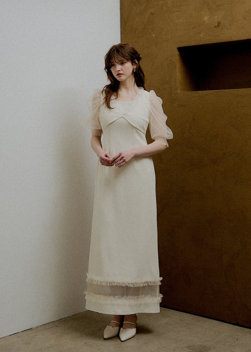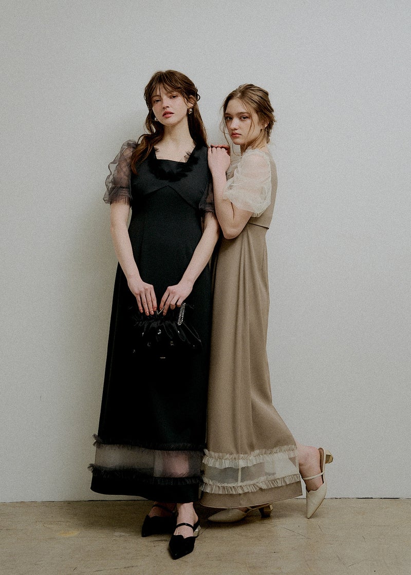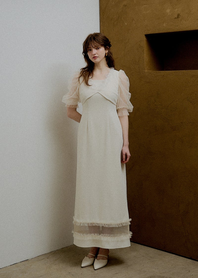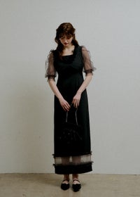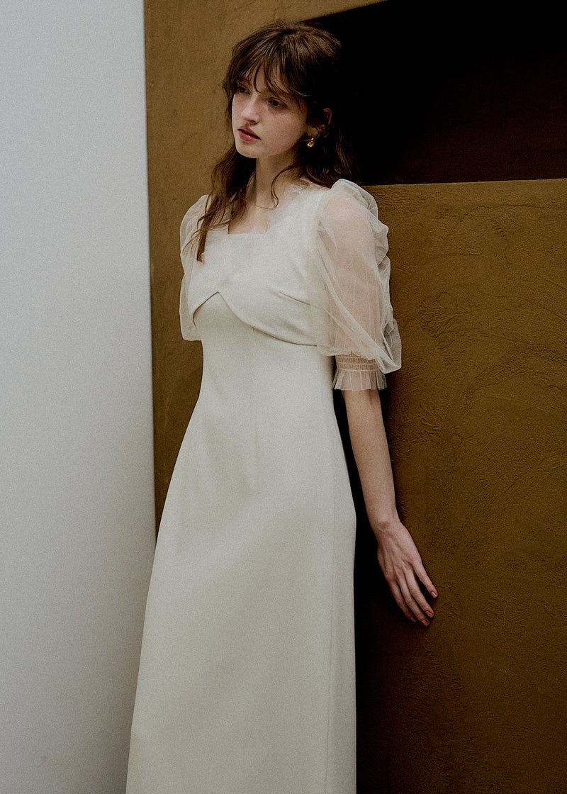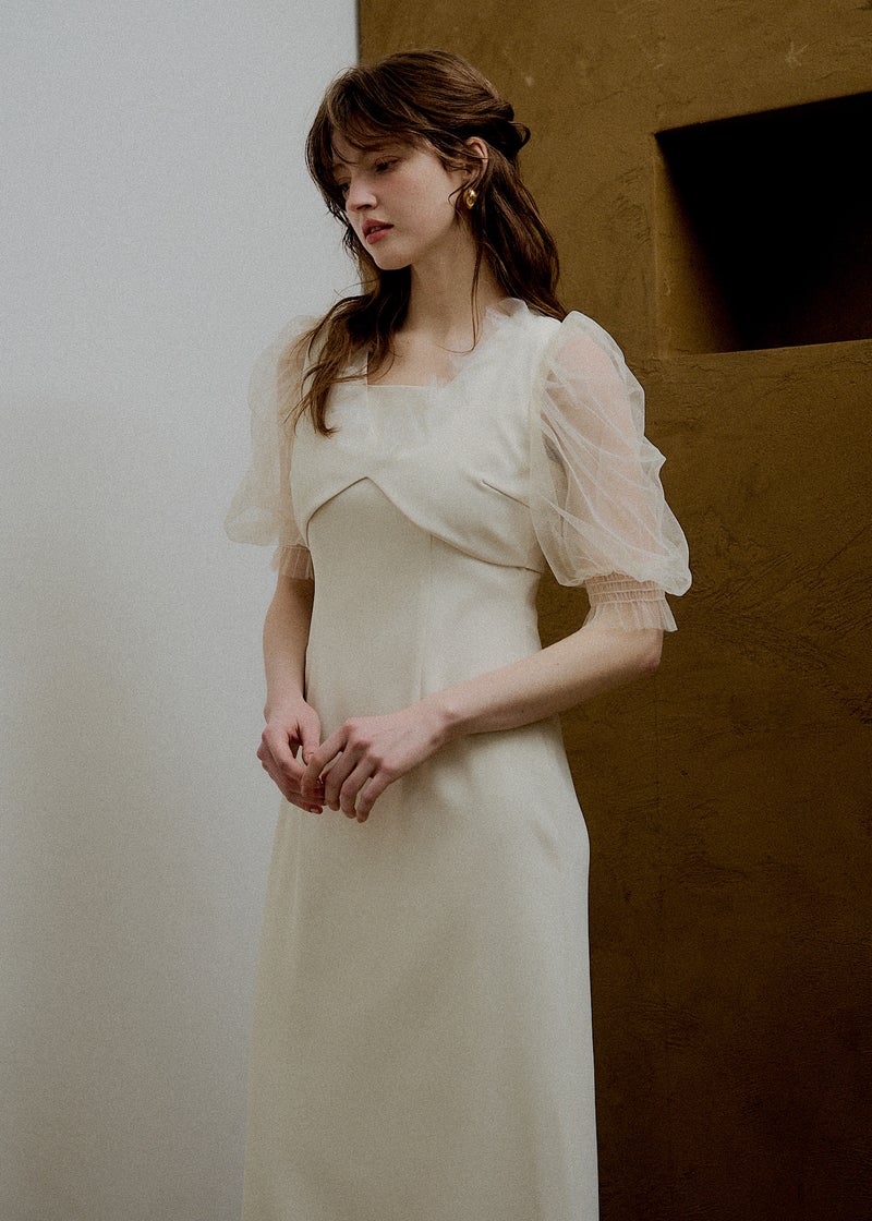 シアー素材をミキシングした軽やかなロングドレス。 ビスチェのレイヤード風デザインに デコルテは程よく開いたスクエアネックに仕上げ フラワーモチーフのチュールを施すことで、顔まわり華やかにしてくれます。 ふわっとしたチュールのお袖は 女性らしさを引き立てつつ 二の腕をさりげなくカバー。 裾には、透け感のあるチュールをあしらい春らしい柔らかな印象に。 落ち感のあるIラインで更にスタイルアップ効果も期待できます◎ オケージョンシーンはもちろん、 きれいめなお食事会や特別な日の装いにもぴったりの一着です。 またホワイトカラーは花嫁様の二次会ドレスにもおススメです。 ※商品画像は、光の当たり具合や端末等の閲覧環境によって、 実際の色味と異なって見える場合がございます。予めご了承ください。 ※画像の商品はサンプルの為、実際の商品とサイズ感が異なっています。 予めご了承ください。