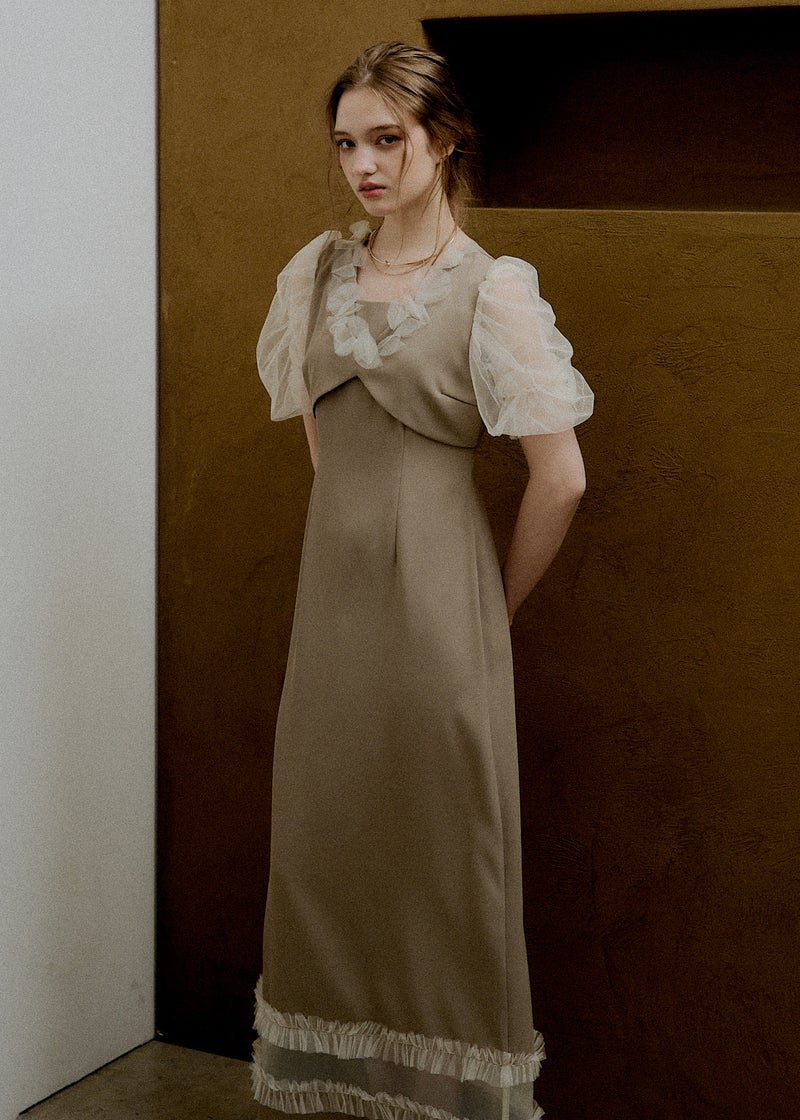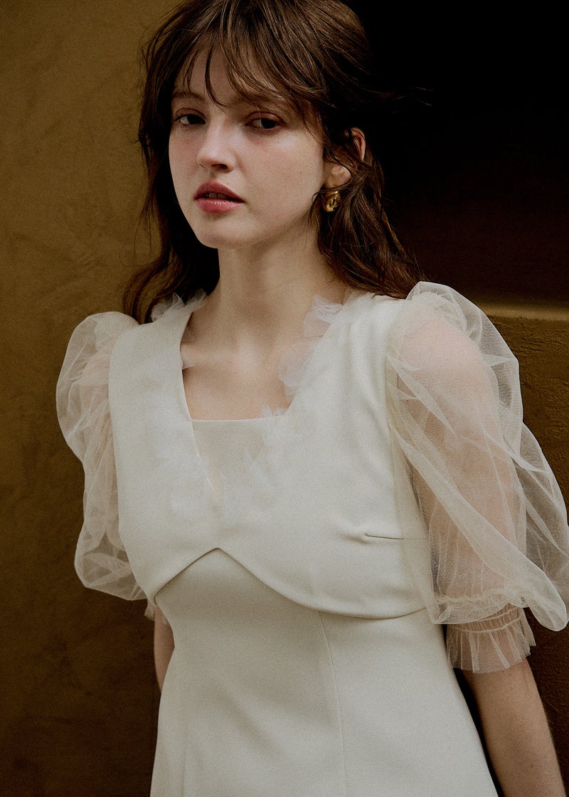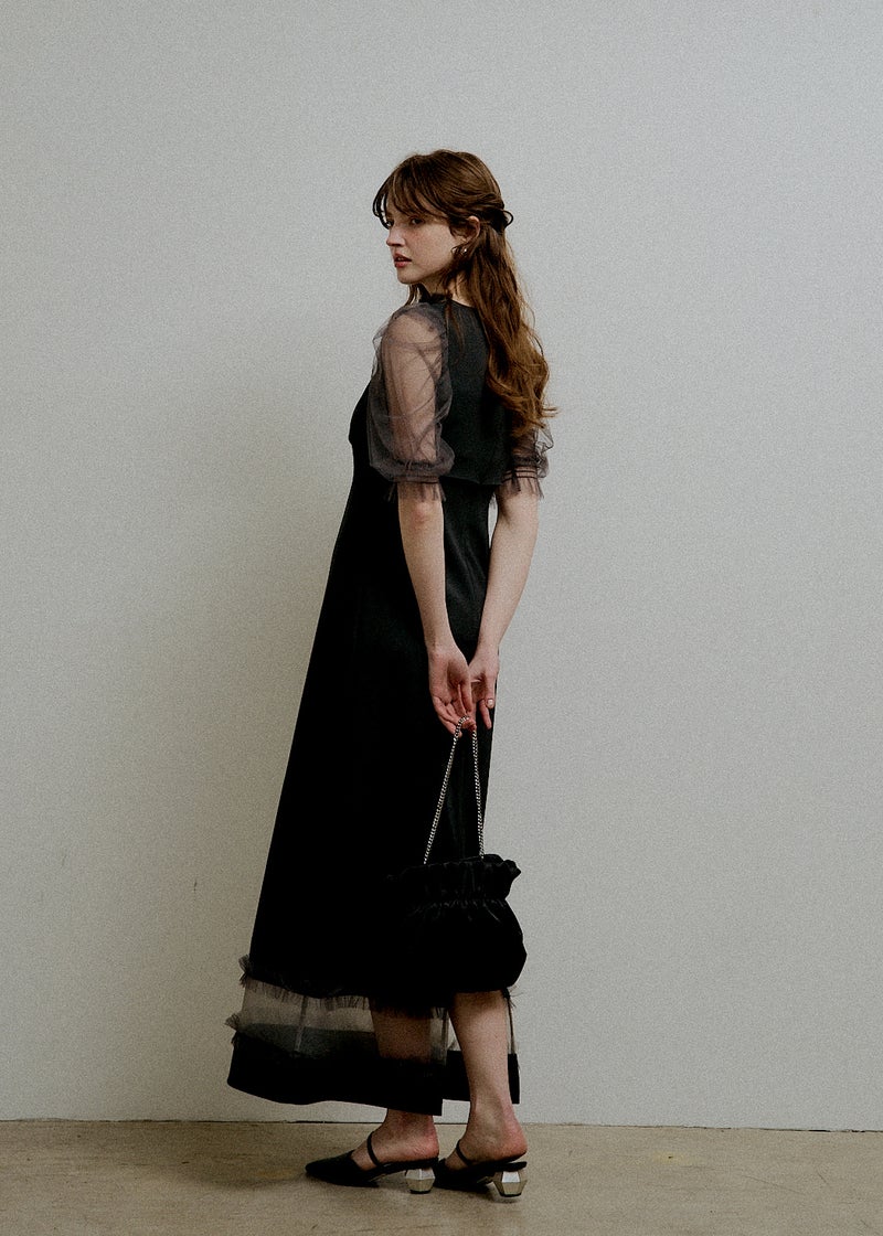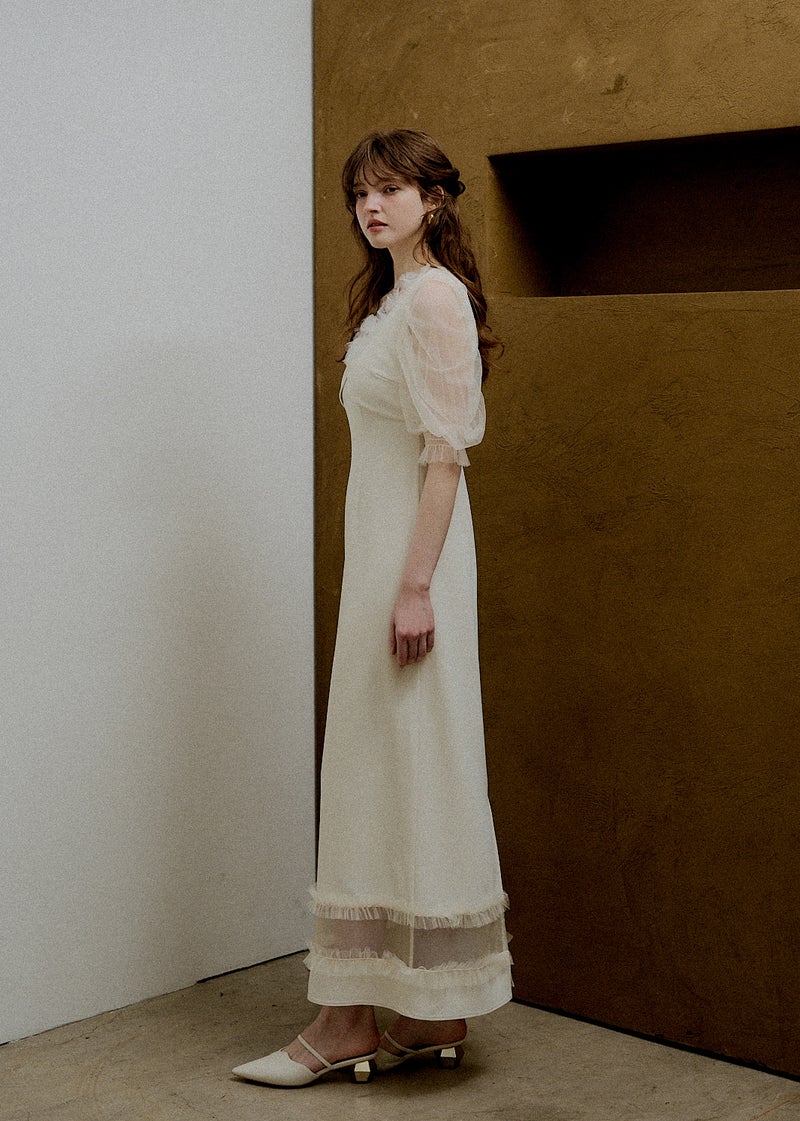 シアー素材をミキシングした軽やかなロングドレス。 ビスチェのレイヤード風デザインに デコルテは程よく開いたスクエアネックに仕上げ フラワーモチーフのチュールを施すことで、顔まわり華やかにしてくれます。 ふわっとしたチュールのお袖は 女性らしさを引き立てつつ 二の腕をさりげなくカバー。 裾には、透け感のあるチュールをあしらい春らしい柔らかな印象に。 落ち感のあるIラインで更にスタイルアップ効果も期待できます◎ オケージョンシーンはもちろん、 きれいめなお食事会や特別な日の装いにもぴったりの一着です。 またホワイトカラーは花嫁様の二次会ドレスにもおススメです。 ※商品画像は、光の当たり具合や端末等の閲覧環境によって、 実際の色味と異なって見える場合がございます。予めご了承ください。 ※画像の商品はサンプルの為、実際の商品とサイズ感が異なっています。 予めご了承ください。