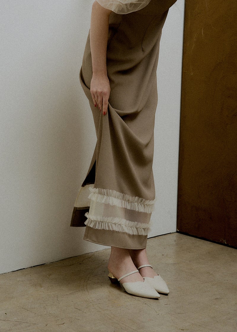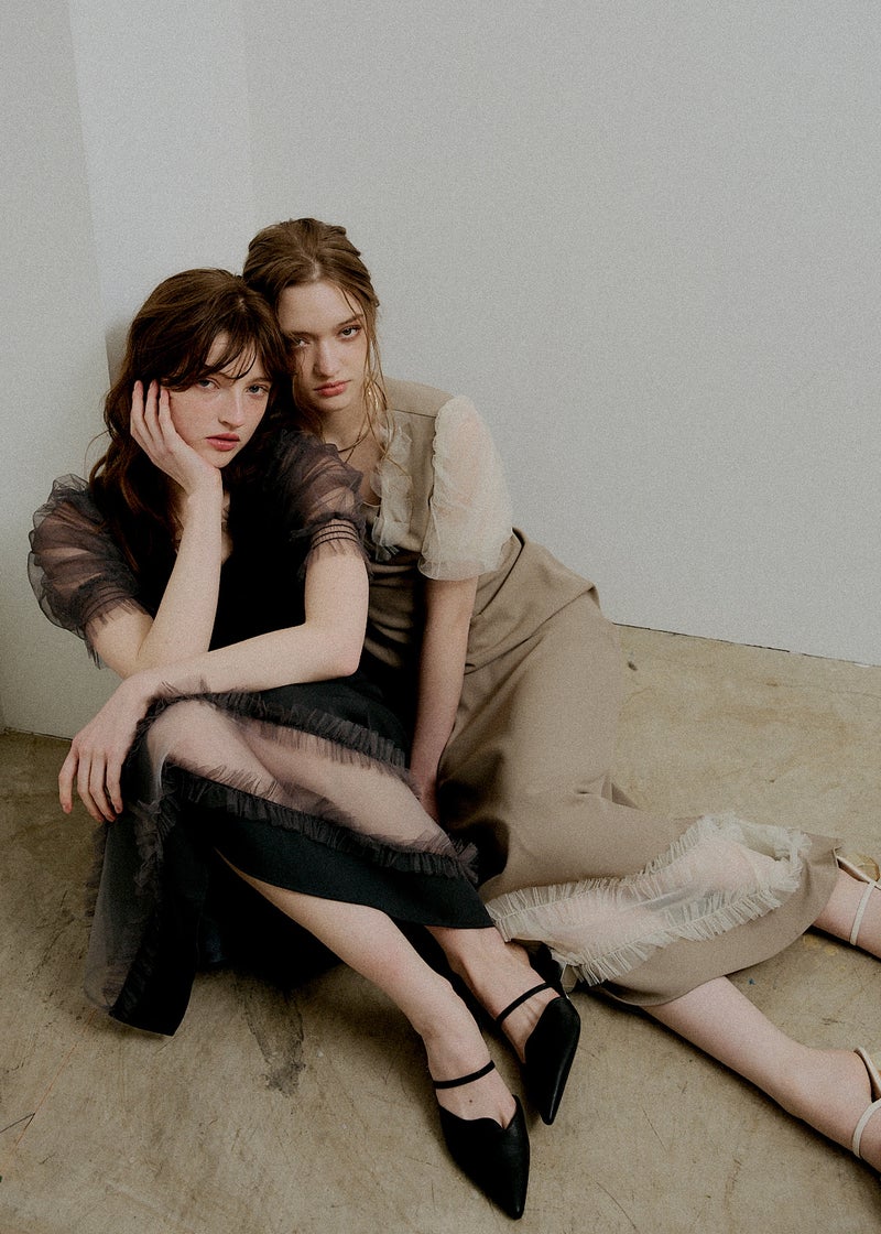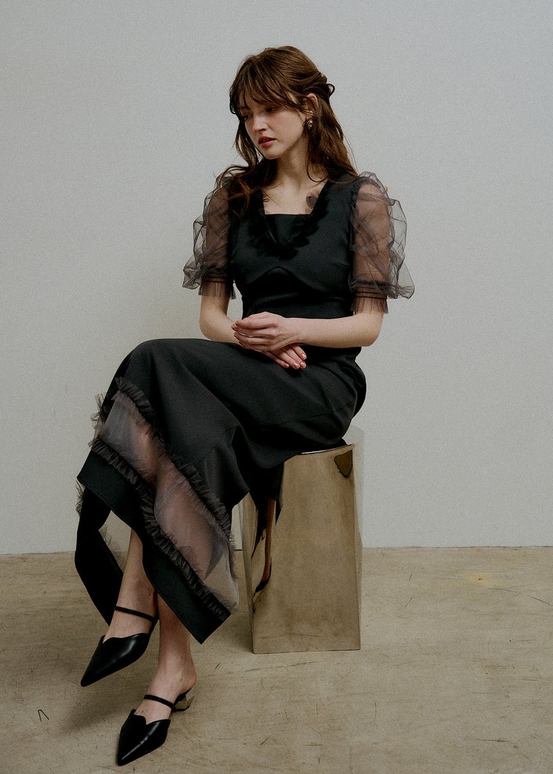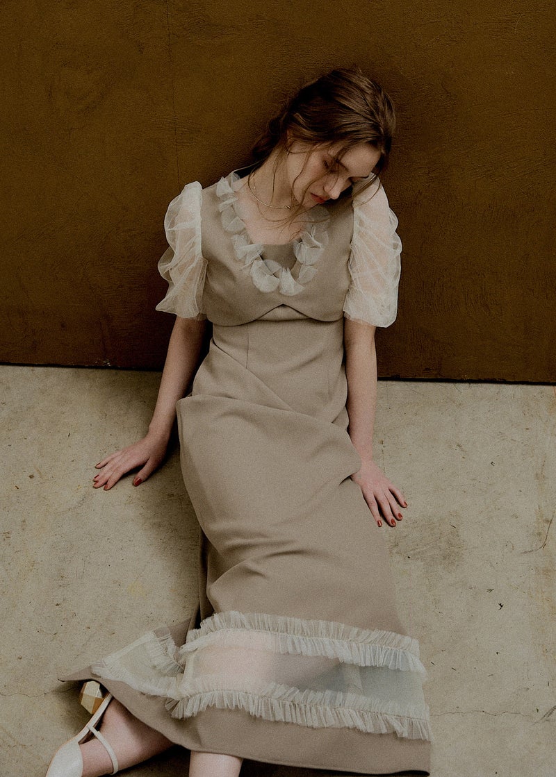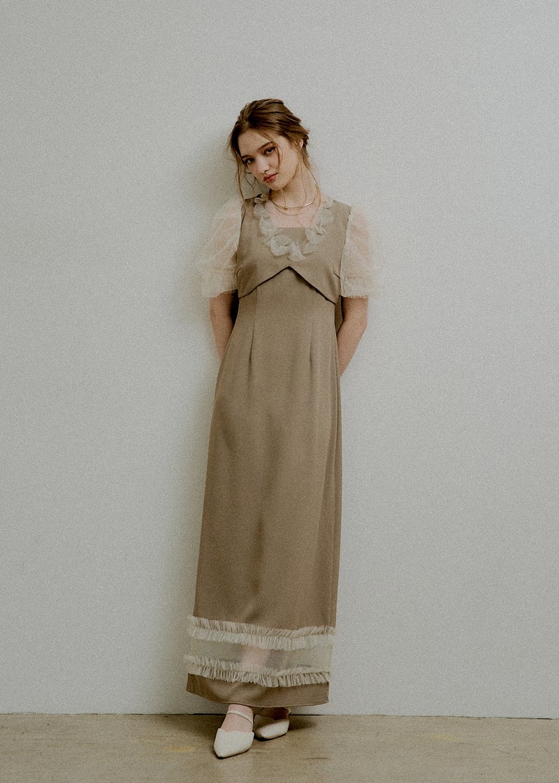 シアー素材をミキシングした軽やかなロングドレス。 ビスチェのレイヤード風デザインに デコルテは程よく開いたスクエアネックに仕上げ フラワーモチーフのチュールを施すことで、顔まわり華やかにしてくれます。 ふわっとしたチュールのお袖は 女性らしさを引き立てつつ 二の腕をさりげなくカバー。 裾には、透け感のあるチュールをあしらい春らしい柔らかな印象に。 落ち感のあるIラインで更にスタイルアップ効果も期待できます◎ オケージョンシーンはもちろん、 きれいめなお食事会や特別な日の装いにもぴったりの一着です。 またホワイトカラーは花嫁様の二次会ドレスにもおススメです。 ※商品画像は、光の当たり具合や端末等の閲覧環境によって、 実際の色味と異なって見える場合がございます。予めご了承ください。 ※画像の商品はサンプルの為、実際の商品とサイズ感が異なっています。 予めご了承ください。