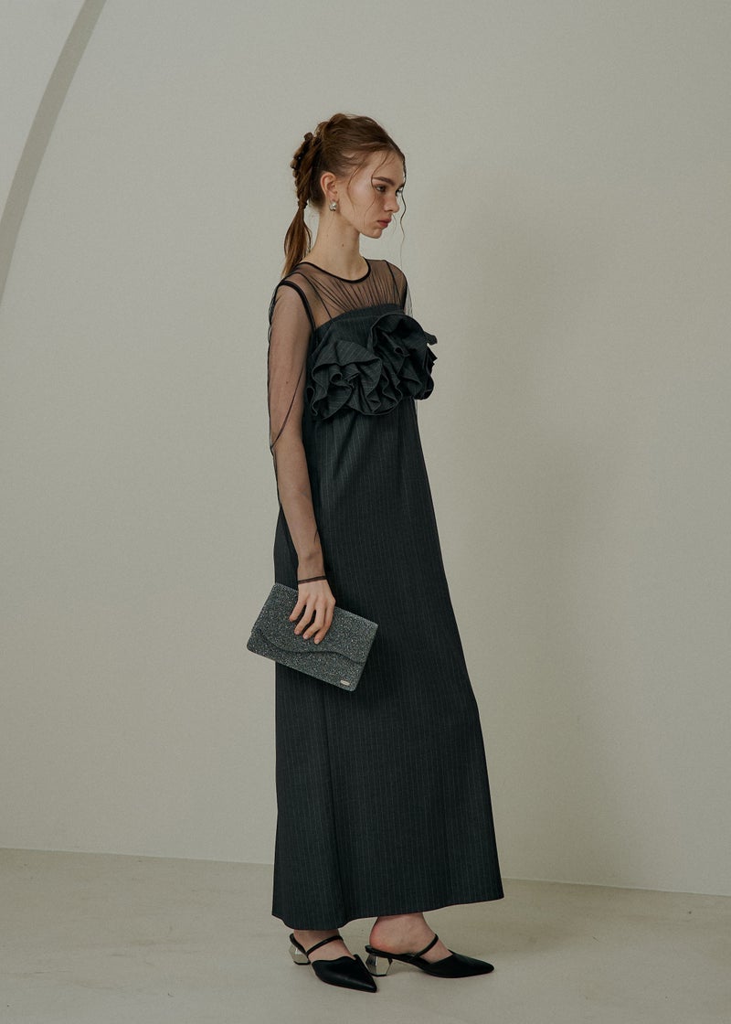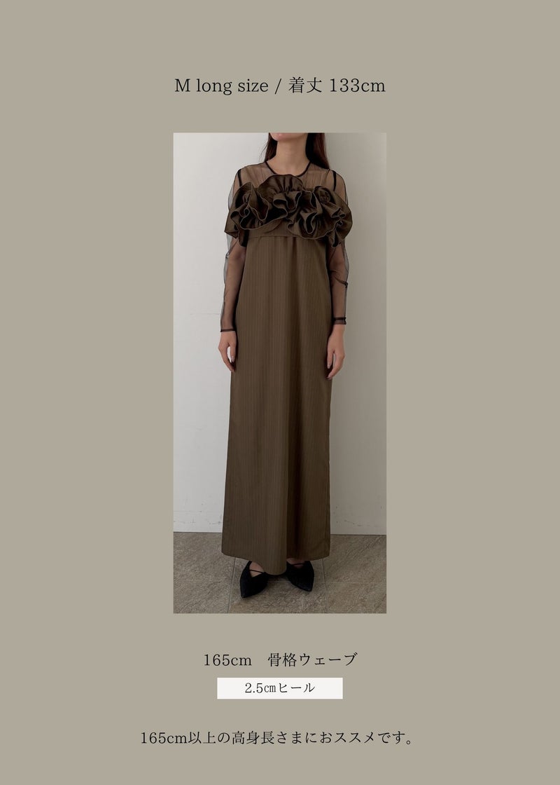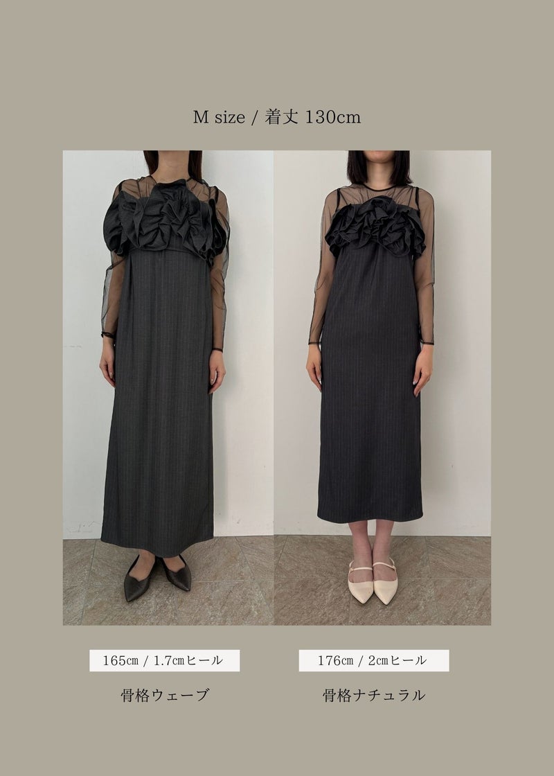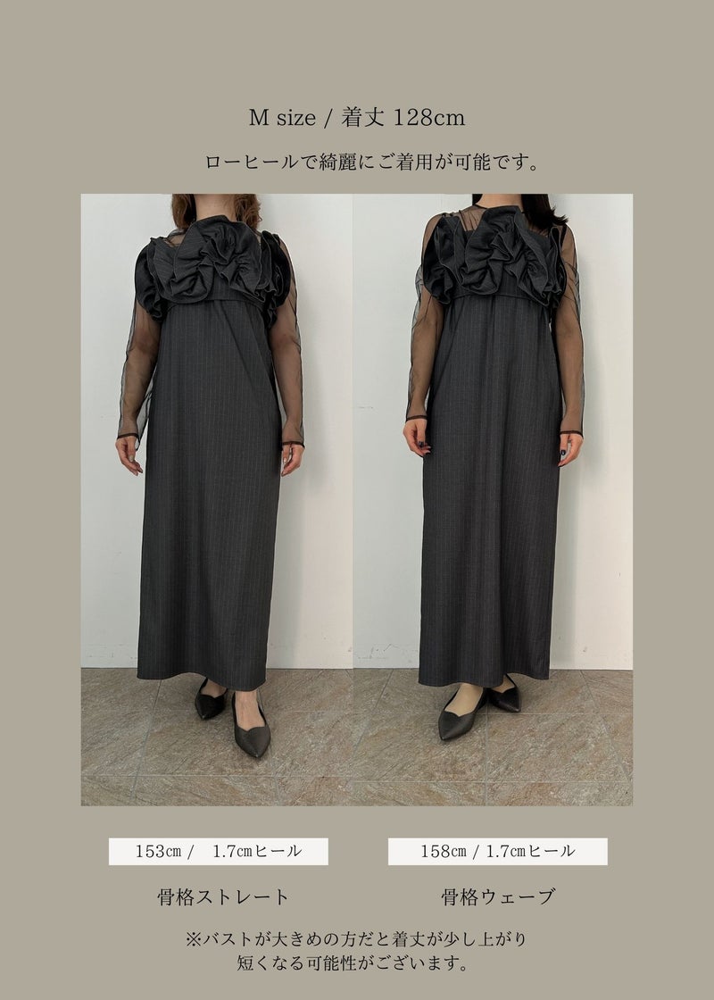 LE'RURE初のストライプ生地を使用した 人目惹くニュアンス感たっぷりのウェーブフリルビスチェのセットドレス。 ストライプの生地は程よくハリ感がありながら 柔らかさも兼ね揃え、皺になりにくいのがポイント。 こだわりが詰まったビスチェは全体のバランス感とシルエットに追求。 身頃後ろは伸縮性があり、調節可能な肩紐でお好みの丈感に調節いただけます。 ワンピースのチュールはチクチクしない肌触りの良い生地を使用。 デコルテにはギャザーデザインを仕込みヘルシーで女性らしい印象に。 足さばきの良いスリットで、デザインに相反したストレスフリーな着心地もポイントです。 ビスチェを合わせてトレンド感のあるカジュアルなコーディネートはもちろん、 ワンピース1枚でジャケットと合わせてタイムレスなスタイルにも。 LE'RUREらしいコーディネートをたっぷりお楽しみください。 ※商品画像は、光の当たり具合や端末等の閲覧環境によって、 実際の色味と異なって見える場合がございます。予めご了承ください。 ※画像の商品はサンプルの為、実際の商品とサイズ感が異なっています。 予めご了承ください。