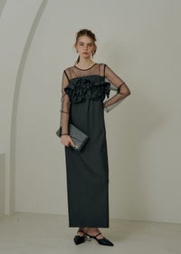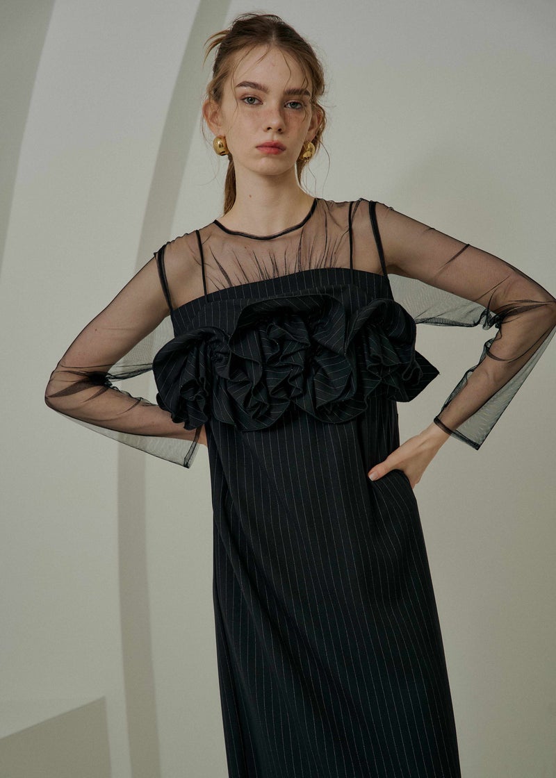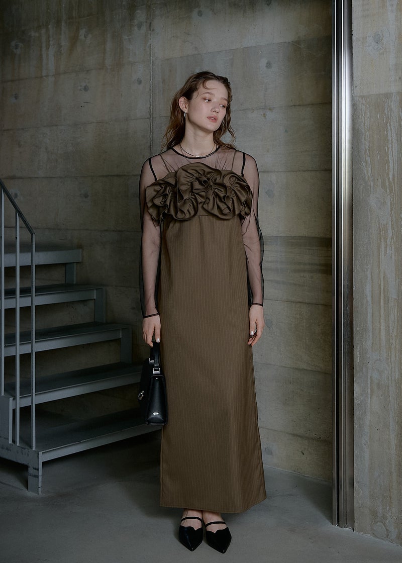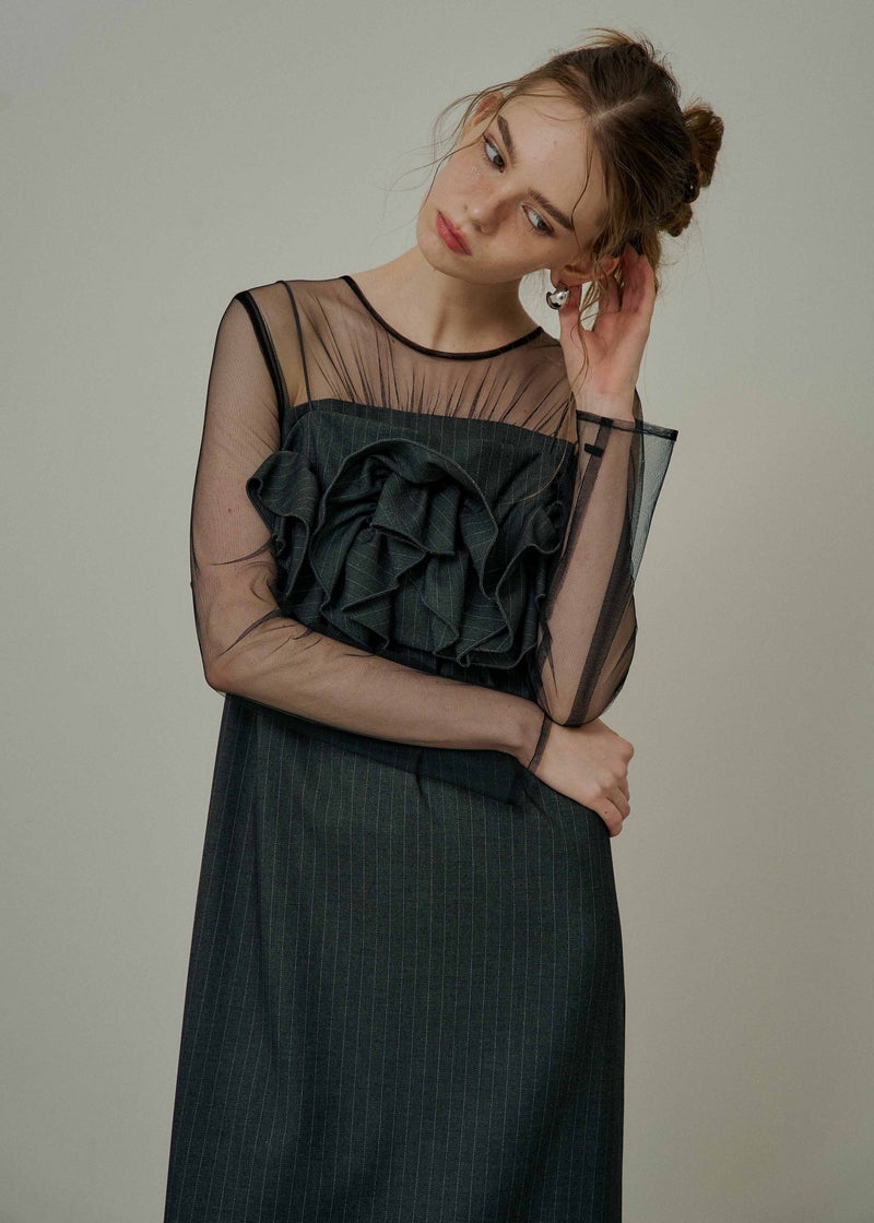 LE'RURE初のストライプ生地を使用した 人目惹くニュアンス感たっぷりのウェーブフリルビスチェのセットドレス。 ストライプの生地は程よくハリ感がありながら 柔らかさも兼ね揃え、皺になりにくいのがポイント。 こだわりが詰まったビスチェは全体のバランス感とシルエットに追求。 身頃後ろは伸縮性があり、調節可能な肩紐でお好みの丈感に調節いただけます。 ワンピースのチュールはチクチクしない肌触りの良い生地を使用。 デコルテにはギャザーデザインを仕込みヘルシーで女性らしい印象に。 足さばきの良いスリットで、デザインに相反したストレスフリーな着心地もポイントです。 ビスチェを合わせてトレンド感のあるカジュアルなコーディネートはもちろん、 ワンピース1枚でジャケットと合わせてタイムレスなスタイルにも。 LE'RUREらしいコーディネートをたっぷりお楽しみください。 ※商品画像は、光の当たり具合や端末等の閲覧環境によって、 実際の色味と異なって見える場合がございます。予めご了承ください。 ※画像の商品はサンプルの為、実際の商品とサイズ感が異なっています。 予めご了承ください。