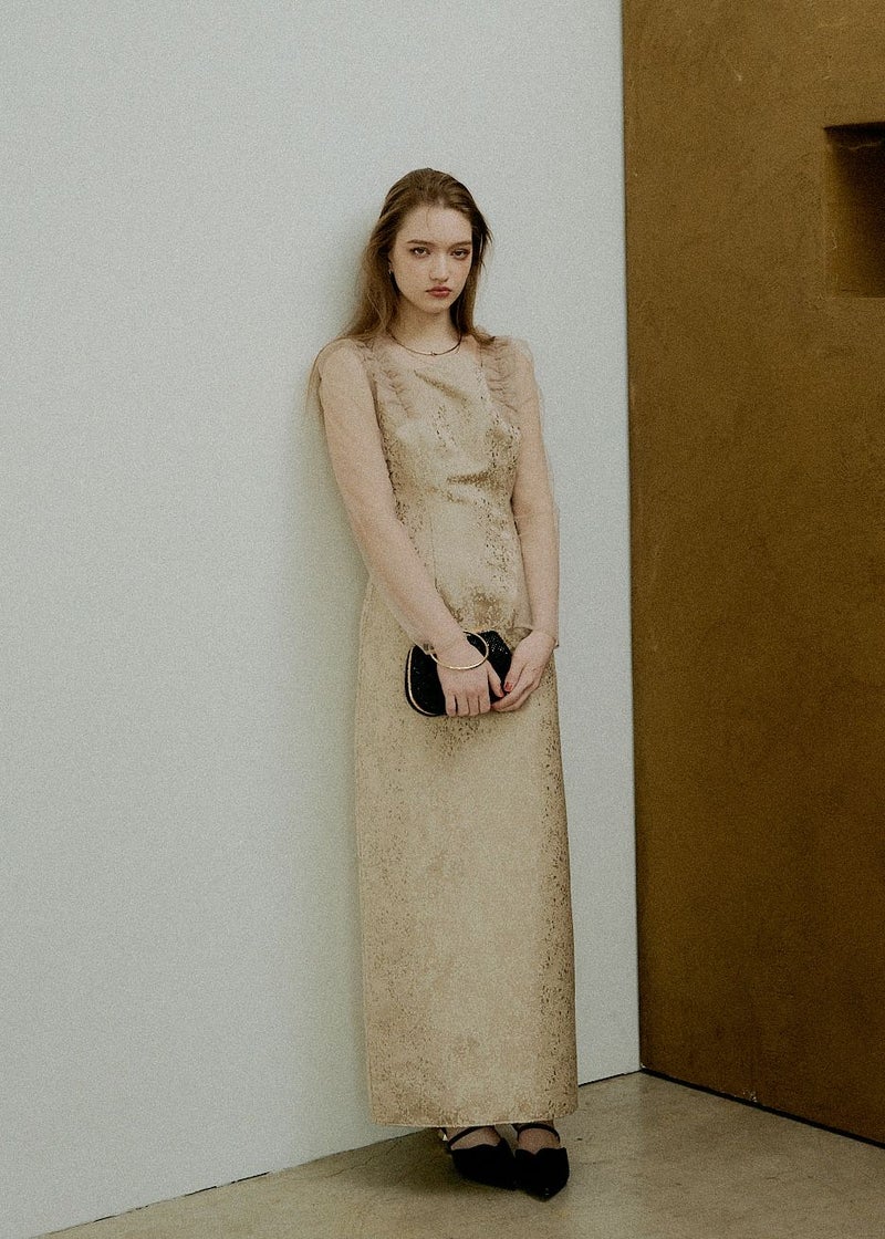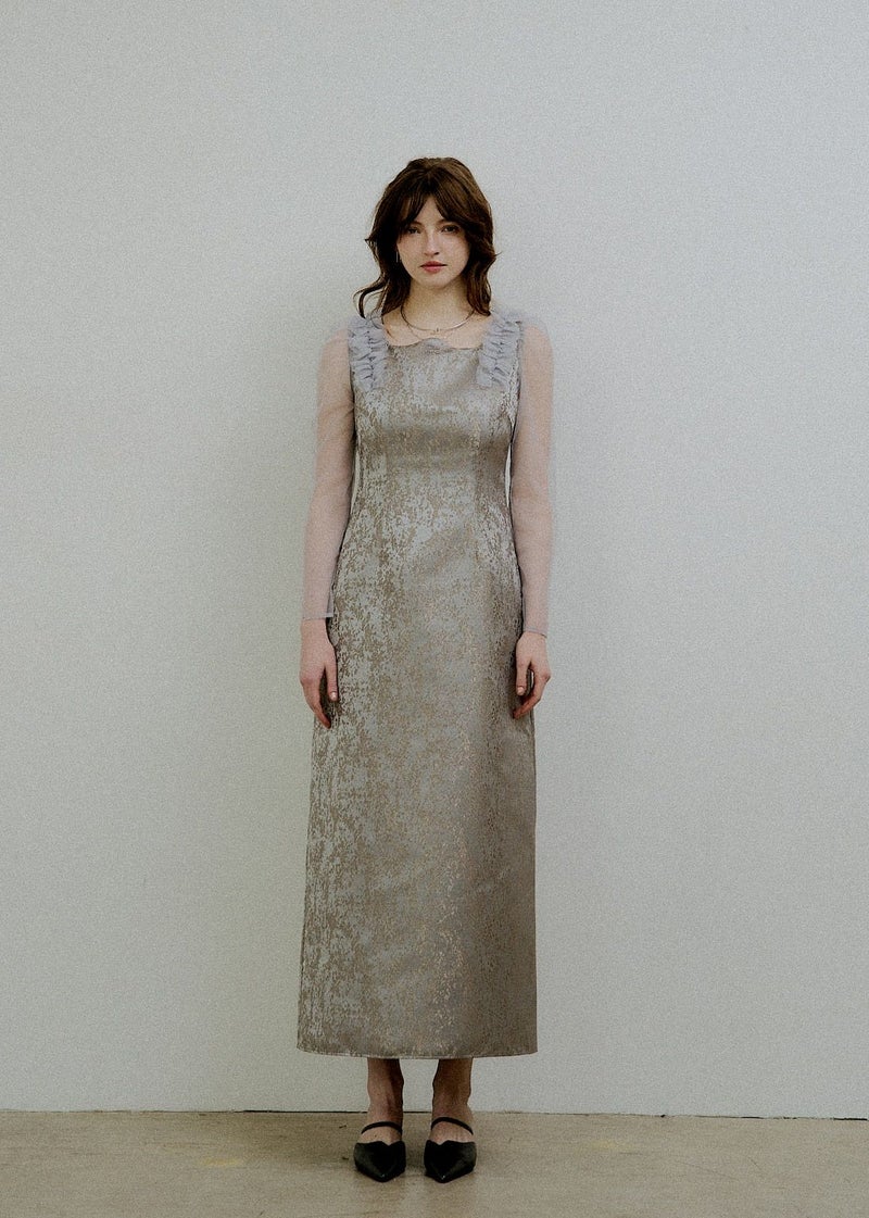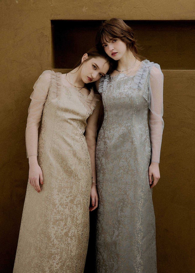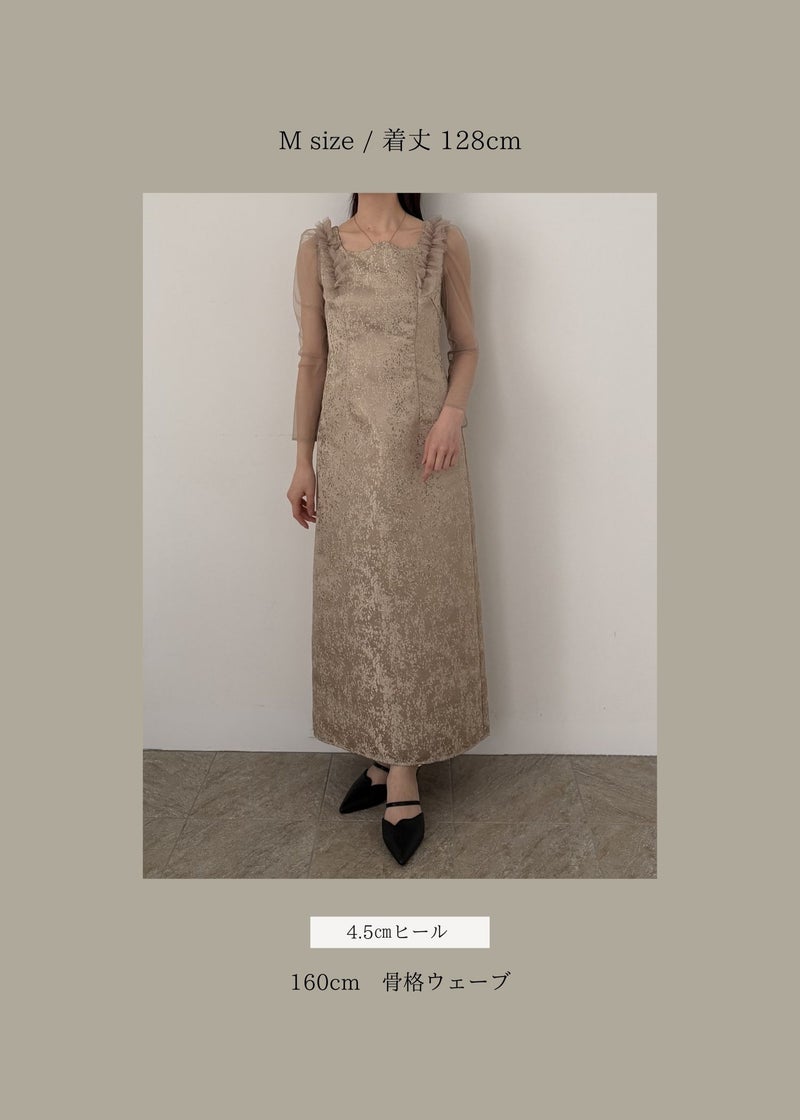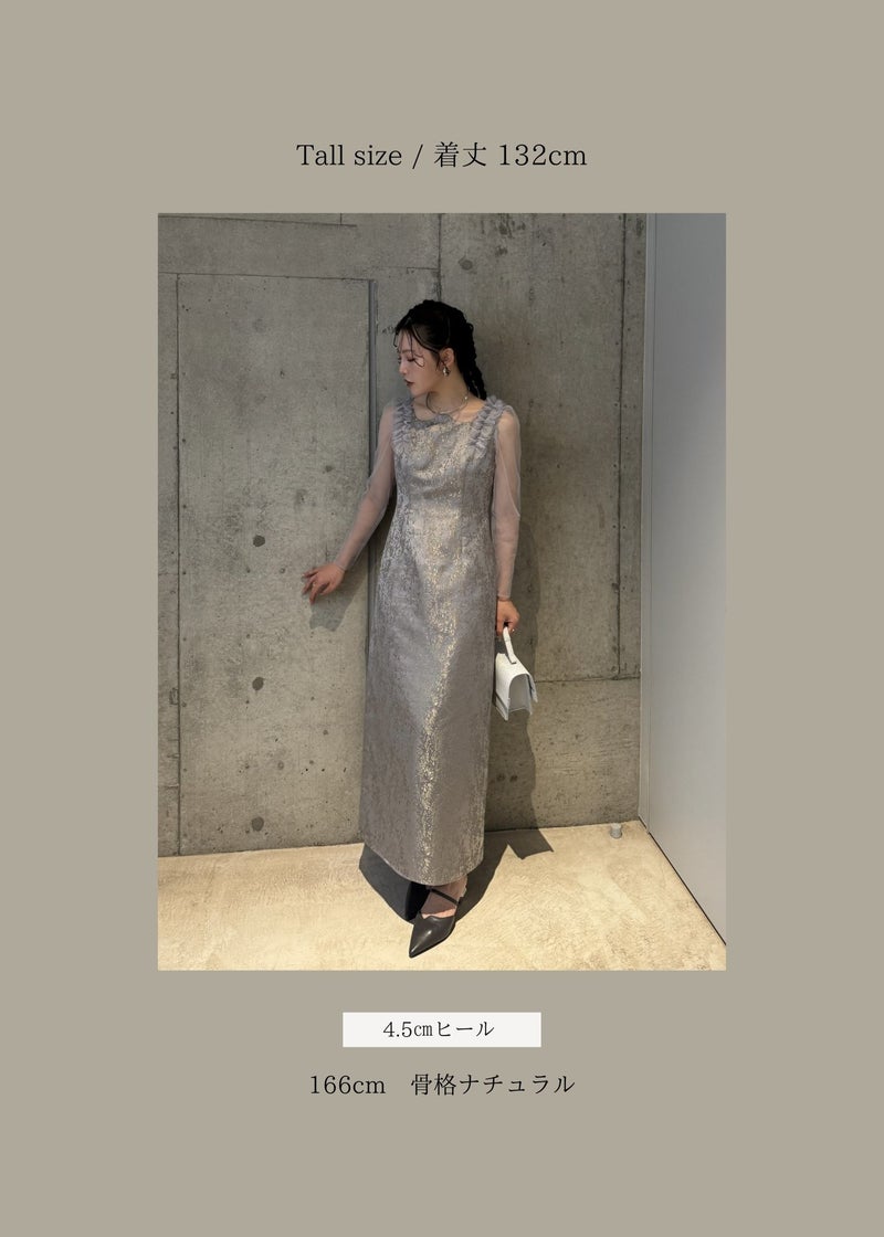 商品説明 '26 Spring collection 新作ジャガードドレスは、 春らしい華やかなデザインにアップデート。 鎖骨がきれいに魅えるよう設計された”うねり”デザインと Iラインシルエットで一枚でさらっと綺麗にスタイリングが決まります。 【春にも軽やかな印象でジャガードドレスを着ていただきたい】 という思いを込めて、 華やかなチュールフリルとカラー展開でお作りしました。 どちらもゴールドの煌めく刺繍が施されており コーディネート次第で表情が変わるBeigeと より洗練された印象を持つgray。 どちらも〝LE'RUREらしさ〟を存分にお楽しみいただける1着です。 ※商品画像は、光の当たり具合や端末等の閲覧環境によって、 実際の色味と異なって見える場合がございます。予めご了承ください。 ※画像の商品はサンプルの為、実際の商品とサイズ感が異なっています。 予めご了承ください。 おすすめのシーン 結婚式・二次会・披露宴・成人式・同窓会・ 2次会謝恩会・パーティー・デート・演奏会・お食事会など多様なシーンのコーディネートに使えます。 商品詳細 【備考】 ・お袖 部分透け感あり ・バックファスナー仕様 ・バックスリットあり 洗濯方法:クリーニング店にご相談ください。 ※その他お取り扱いに関しましては、商品に付属のアテンションタグをご覧ください。 原産国:MADE IN CHINA お問い合わせ品番:9611 着用モデル身長 / Model size 75_gray :身長174cm 05_beige :身長168cm