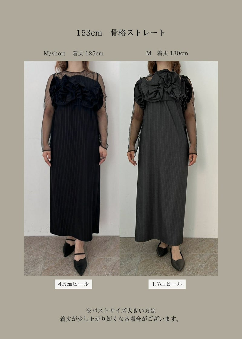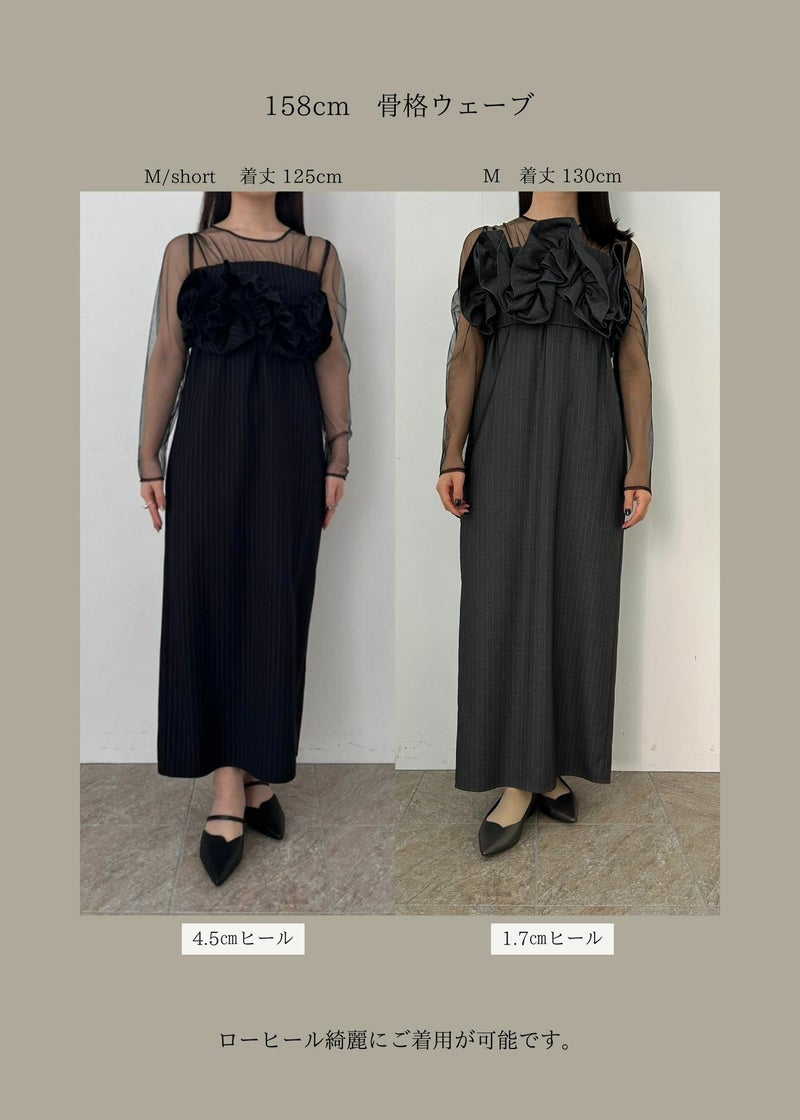 着丈バストウエストヒップ肩幅袖丈袖口 M/short:ビスチェ188980-------- M/short:ワンピース1258987--356322 M:ビスチェ188980-------- M:ワンピース1308987--356322 M long:ビスチェ188980-------- M long:ワンピース1338987--356322 単位(cm) 【身長別 サイズ比較】 ・M/shortサイズ 140cm台の方は5~7cmヒール推奨。 150cm~155cm以下の方は、2~4cmのヒールがお勧め。 ・Mサイズ 155cm~160cm の方2~4cm前後のヒール推奨。 160cm以上で足首やくるぶしの見える丈感ご希望の方はローヒールを。 ・M long サイズ 160cm~164cm の方2~4cm前後のヒール推奨。 165cm以上で足首やくるぶしの見える丈感ご希望の方はローヒールを。 着用モデル gray / black : 身長177cm / Model size brown : 身長173cm / Model size お問い合わせ品番:9575