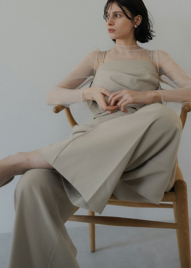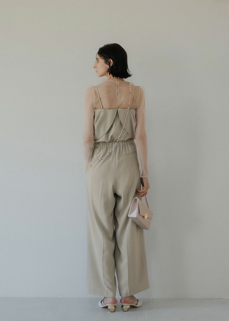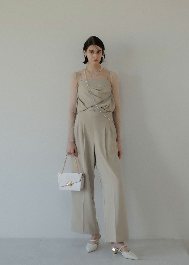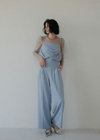 商品説明 チュールトップスとビスチェ タック入りのパンツでオールインワン見えする3点セットアイテム。 タックを施したドレープデザインのビスチェは 立体感とニュアンス感あるシルエットが魅力的。 INでもOUTでも着用できる丈感に仕上げました。 肩紐は取り外し可能で、キャミオールインワン風としても着用して頂けます。 背中見せも美しくレディムードを高めます。 チュールトップスは肌触りの良い素材を使用し バックネックにはくるみボタンを。 着用することで肌を見せすぎず抜け感あるスタイリングに。 美シルエットなセミワイドパンツは 着る人の体型を選ばない 調節可能なバックウエストゴムを仕込むことで ベルトレスでボディにフィット。 デザインと着心地の良さも両立させました。 チュールレスでビスチェ単体で 背中見せも美しくレディムードを高めます。 オケージョンはもちろん、Tシャツとのレイヤード デニムや他カラーのスラックス等の合わせでカジュアルにも。 ビスチェとパンツのみの、ヘルシーでラフなバケーションスタイルも素敵。 様々なシーンに馴染んでくれるマルチなアイテムです。 model着用:Melange collarless jacket ※商品画像は、光の当たり具合や端末等の閲覧環境によって、 実際の色味と異なって見える場合がございます。予めご了承ください。 ※画像の商品はサンプルの為、実際の商品とサイズ感が異なっています。 予めご了承ください。 おすすめのシーン 結婚式・二次会・披露宴・成人式・同窓会・2次会 謝恩会・パーティー・デート・演奏会・お食事会など多様なシーンのコーディネートに使えます。 商品詳細 【備考】 <ビスチェ> ・バックファスナー仕様 ・わき~背中ゴム入 ・裏地あり ・アジャスターにて着丈調節可 <チュールトップス> ・胡桃ボタン2つ使用 ・お袖部分スリットあり <パンツ> ・サイドファスナー仕様 ・裏地あり ・ポケット付 ・ウエスト調節可能 洗濯方法:クリーニング店にご相談ください。 ※その他お取り扱いに関しましては、商品に付属のアテンションタグをご覧ください。 原産国:MADE IN CHINA お問い合わせ品番:9582 着用モデル身長175cm