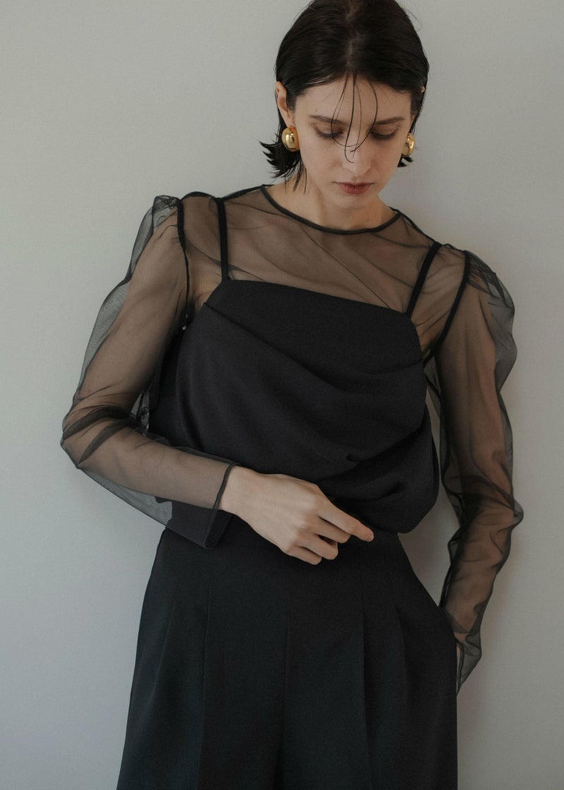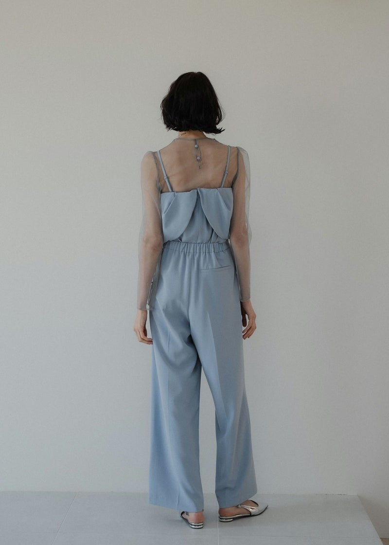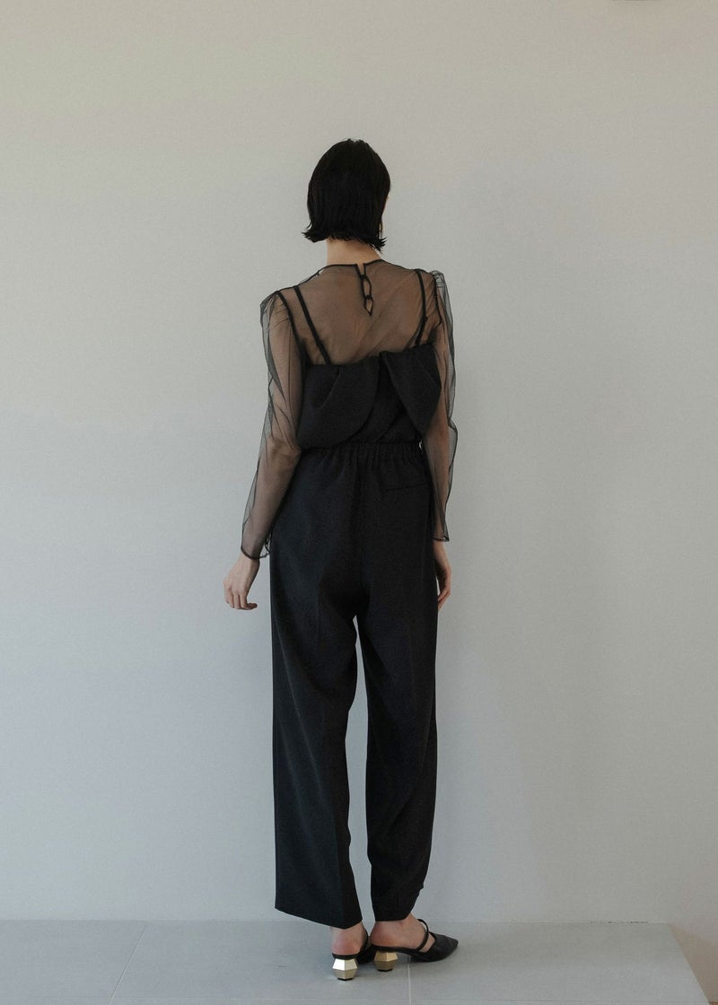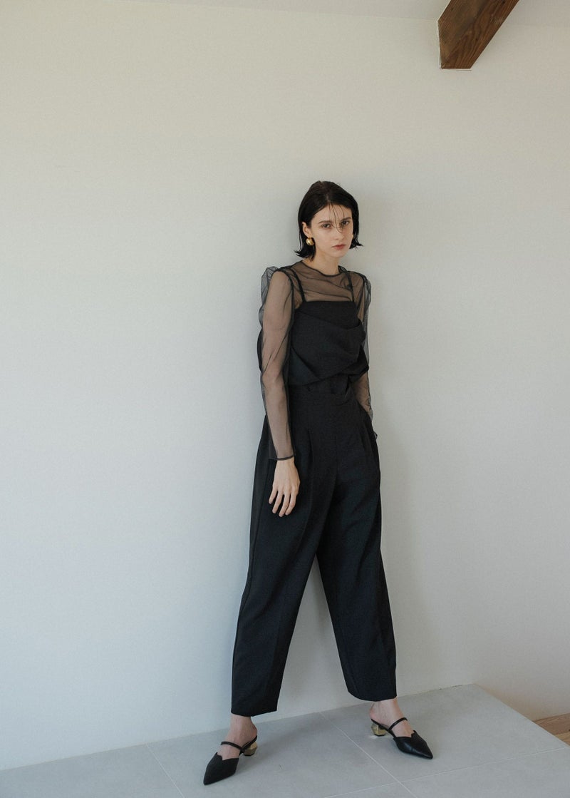 商品説明 チュールトップスとビスチェ タック入りのパンツでオールインワン見えする3点セットアイテム。 タックを施したドレープデザインのビスチェは 立体感とニュアンス感あるシルエットが魅力的。 INでもOUTでも着用できる丈感に仕上げました。 肩紐は取り外し可能で、キャミオールインワン風としても着用して頂けます。 背中見せも美しくレディムードを高めます。 チュールトップスは肌触りの良い素材を使用し バックネックにはくるみボタンを。 着用することで肌を見せすぎず抜け感あるスタイリングに。 美シルエットなセミワイドパンツは 着る人の体型を選ばない 調節可能なバックウエストゴムを仕込むことで ベルトレスでボディにフィット。 デザインと着心地の良さも両立させました。 チュールレスでビスチェ単体で 背中見せも美しくレディムードを高めます。 オケージョンはもちろん、Tシャツとのレイヤード デニムや他カラーのスラックス等の合わせでカジュアルにも。 ビスチェとパンツのみの、ヘルシーでラフなバケーションスタイルも素敵。 様々なシーンに馴染んでくれるマルチなアイテムです。 model着用:Melange collarless jacket ※商品画像は、光の当たり具合や端末等の閲覧環境によって、 実際の色味と異なって見える場合がございます。予めご了承ください。 ※画像の商品はサンプルの為、実際の商品とサイズ感が異なっています。 予めご了承ください。 おすすめのシーン 結婚式・二次会・披露宴・成人式・同窓会・2次会 謝恩会・パーティー・デート・演奏会・お食事会など多様なシーンのコーディネートに使えます。 商品詳細 【備考】 <ビスチェ> ・バックファスナー仕様 ・わき~背中ゴム入 ・裏地あり ・アジャスターにて着丈調節可 <チュールトップス> ・胡桃ボタン2つ使用 ・お袖部分スリットあり <パンツ> ・サイドファスナー仕様 ・裏地あり ・ポケット付 ・ウエスト調節可能 洗濯方法:クリーニング店にご相談ください。 ※その他お取り扱いに関しましては、商品に付属のアテンションタグをご覧ください。 原産国:MADE IN CHINA お問い合わせ品番:9582 着用モデル身長175cm