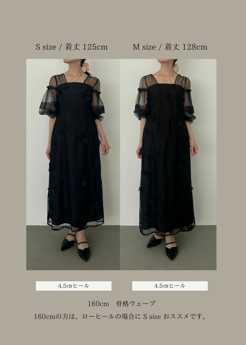 着丈バストウエストヒップ肩幅袖丈 S1258471~851013251 M1288774~881043352 M/long1368774~881043352 単位(cm) 【身長別 サイズ比較】 ・Sサイズ 140cm台の方は7cmヒール推奨。 150cm台の方は4~7cmヒール推奨。 160cm前後の方はローヒールでご着用可能。 ・Mサイズ 155cm~160cm の方7cm前後のヒール推奨。 160cm以上で足首やくるぶしの見える丈感ご希望の方はローヒールを。 ・M/longサイズ 165cm以上の高身長の方 足首が見え隠れする丈感がご希望の方におススメ。 ロング丈で仕上げておりますので、2~5cmのヒール推奨。 170cm以上の方はローヒールで綺麗にご着用いただけます。 画像後方の身長別SNAPもご確認ください。 着用モデル 身長163cm / M long size お問い合わせ品番:9588