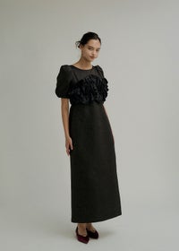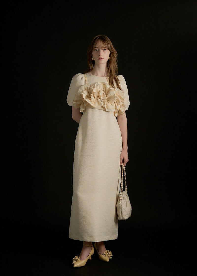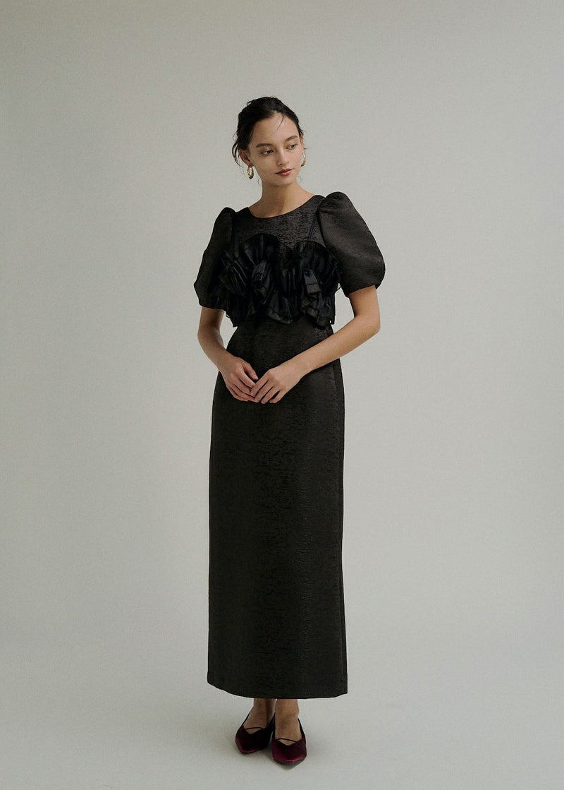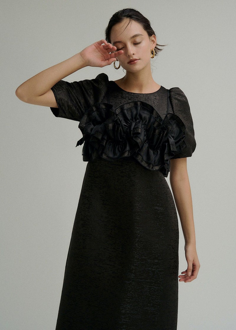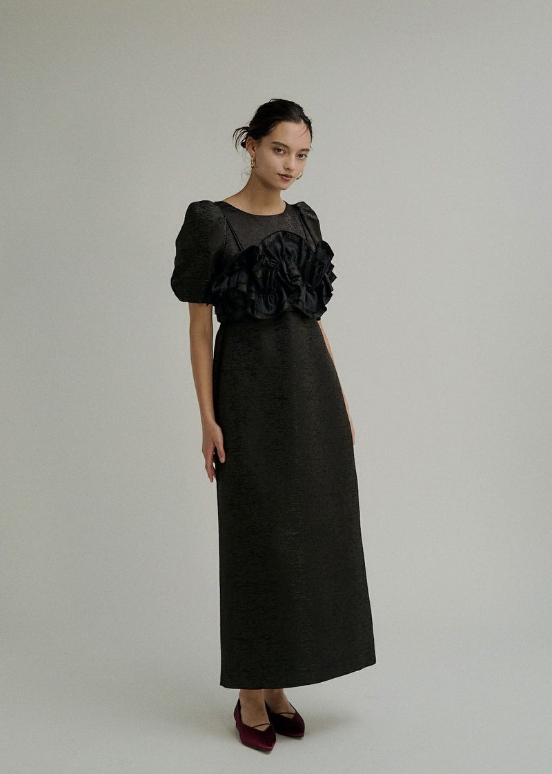 商品説明 ポコポコとかわいい素材感のジャカードで 人目惹くニュアンス感たっぷりのウェーブフリルビスチェのセットドレス。 ジャガード生地はオールシーズン使いやすい単色のものを使用し、 ハリ感を活かしたコクーンシルエットのワンピースは1枚でも様になります。 デコルテが綺麗にみえるUネックと、 バック部分は少し深めに女性らしい抜け感をPLUS+ お袖のパフっと感も拘りの一つ。 ビスチェは 大人気のWavy frill bustier stripe dress(品番:9575)のデザインを ジャガード生地にアップグレード。 ハリ感のある生地で、よりコーディネートのワンポイントに。 身頃後ろは伸縮性があり 調節可能な肩紐で、お好みの丈感に調節いただけます。 シアートップスやジャケットのコーディネートも 一癖あるLE'RUREらしい装いに仕上げてくれます。 ※商品画像は、光の当たり具合や端末等の閲覧環境によって、 実際の色味と異なって見える場合がございます。予めご了承ください。 ※画像の商品はサンプルの為、実際の商品とサイズ感が異なっています。 予めご了承ください。 おすすめのシーン 結婚式・二次会・披露宴・成人式・同窓会・2次会 謝恩会・パーティー・デート・演奏会・お食事会など多様なシーンのコーディネートに使えます。 商品詳細 【備考】 <ビスチェ> ・バストバックゴム仕様 ・アジャスターにて着丈調節可 <ワンピース> ・ウエストバックゴム仕様 ・バックファスナー仕様 ・バックスリット有 洗濯方法:クリーニング店にご相談ください。 ※その他お取り扱いに関しましては、商品に付属のアテンションタグをご覧ください。 原産国:MADE IN CHINA お問い合わせ品番:9599 着用モデル身長 beige / ivory : 174cm black : 172cm