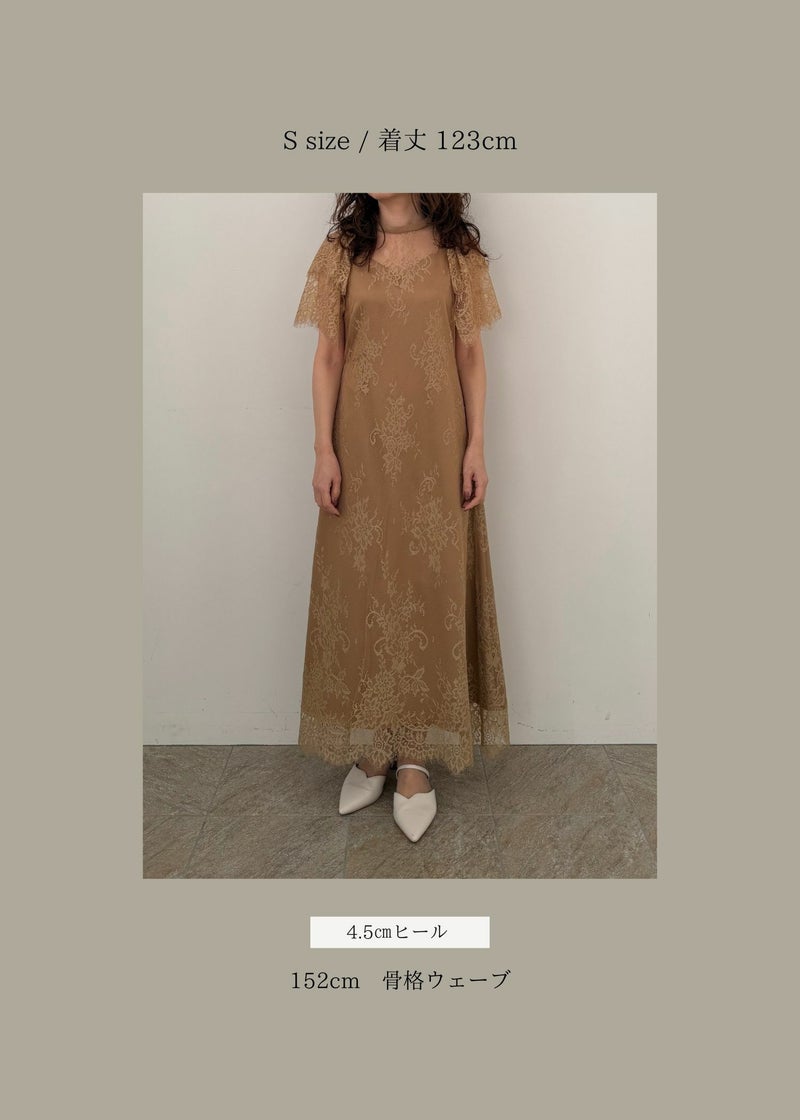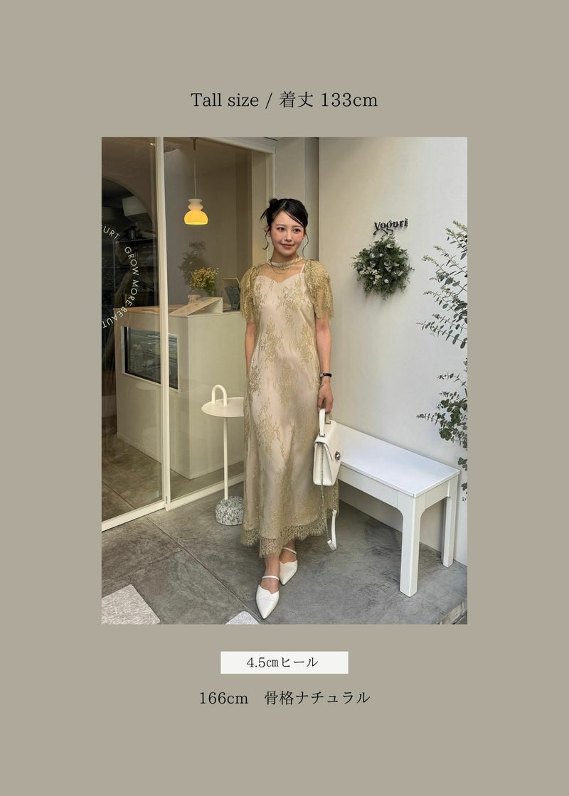 商品説明 裾スカラップをポイントにした総レースドレスが登場。 ハートカットのキャミワンピと繊細なレースを レイヤードデザインとして、落とし込みました。 くびれを綺麗に魅せるようシルエットにも拘り、 お袖の2層の大きなフリルデザインは程よく二の腕カバーにも◎ ソフトなAラインシルエットのスカートは レース地の分量をたっぷりと贅沢に使用し、高級感溢れる印象に。 '25 AWのレースドレスは Beige、Blackと大人モードも取り入れつつ 華やかであるライムカラーを展開しております。 ※商品画像は、光の当たり具合や端末等の閲覧環境によって、 実際の色味と異なって見える場合がございます。予めご了承ください。 ※画像の商品はサンプルの為、実際の商品とサイズ感が異なっています。 予めご了承ください。 おすすめのシーン 結婚式・二次会・披露宴・成人式・同窓会・2次会 謝恩会・パーティー・デート・演奏会・お食事会など多様なシーンのコーディネートに使えます。 商品詳細 【備考】 ・ウエストバックゴム仕様 ・バックファスナー仕様 ・スカラップデザイン 洗濯方法:クリーニング店にご相談ください。 ※その他お取り扱いに関しましては、商品に付属のアテンションタグをご覧ください。 原産国:MADE IN CHINA お問い合わせ品番:9604 着用モデル身長 : 173cm