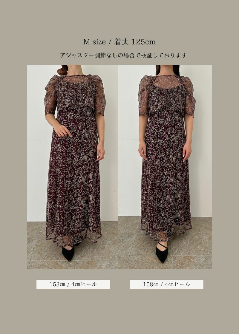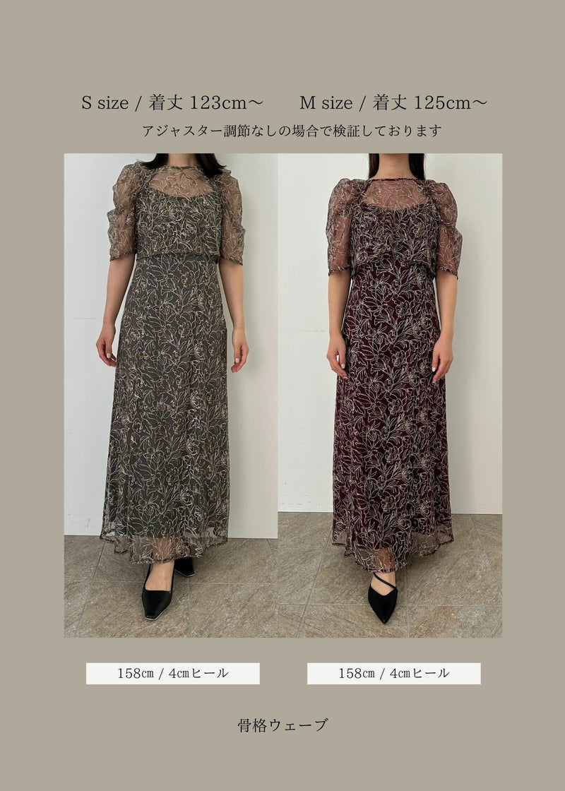 商品説明 立体的な花柄刺繍を施した、 LE’RUREオリジナルレースのレイヤードドレス。 ショルダーギャザーの程よいボリューム感が コーディネートにアクセントを効かせ、二の腕周りもカバー。 ウエスト位置を高めに切り替えることで スカートでありながら、スタイルアップ効果も期待できます。 ボディーラインを拾いすぎない、おち感のあるシルエットで 甘くなりすぎずに リラックスしたムードで着用いただける1枚に仕立てました。 LE’RUREのひと癖あるベーシックラインとして重宝できるアイテムです。 ※商品画像は、光の当たり具合や端末等の閲覧環境によって、 実際の色味と異なって見える場合がございます。予めご了承ください。 ※画像の商品はサンプルの為、実際の商品とサイズ感が異なっています。 予めご了承ください。 おすすめのシーン 結婚式・二次会・披露宴・成人式・同窓会・ 2次会謝恩会・パーティー・デート・演奏会・お食事会など多様なシーンのコーディネートに使えます。 商品詳細 【備考】 ワンピース ・裏地あり ・デコルテ部分透け感あり ・伸縮性なし ・サイドファスナー仕様 ・アジャスター仕様 ボレロ ・裏地なし ・透け感あり ・伸縮性なし ・バックボタン仕様 洗濯方法:クリーニング店にご相談ください。 ※その他お取り扱いに関しましては、商品に付属のアテンションタグをご覧ください。 原産国:MADE IN CHINA お問い合わせ品番:9413 着用モデル身長175cm