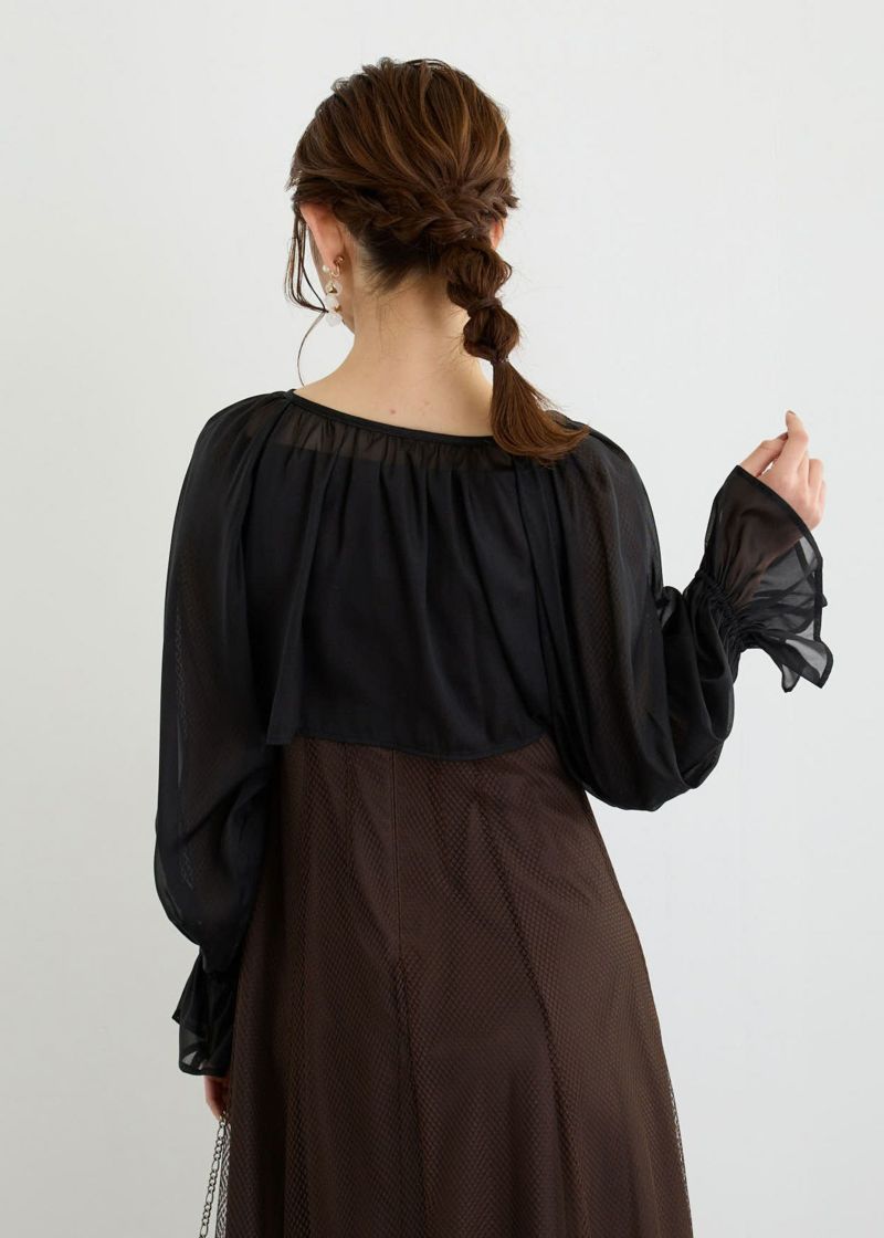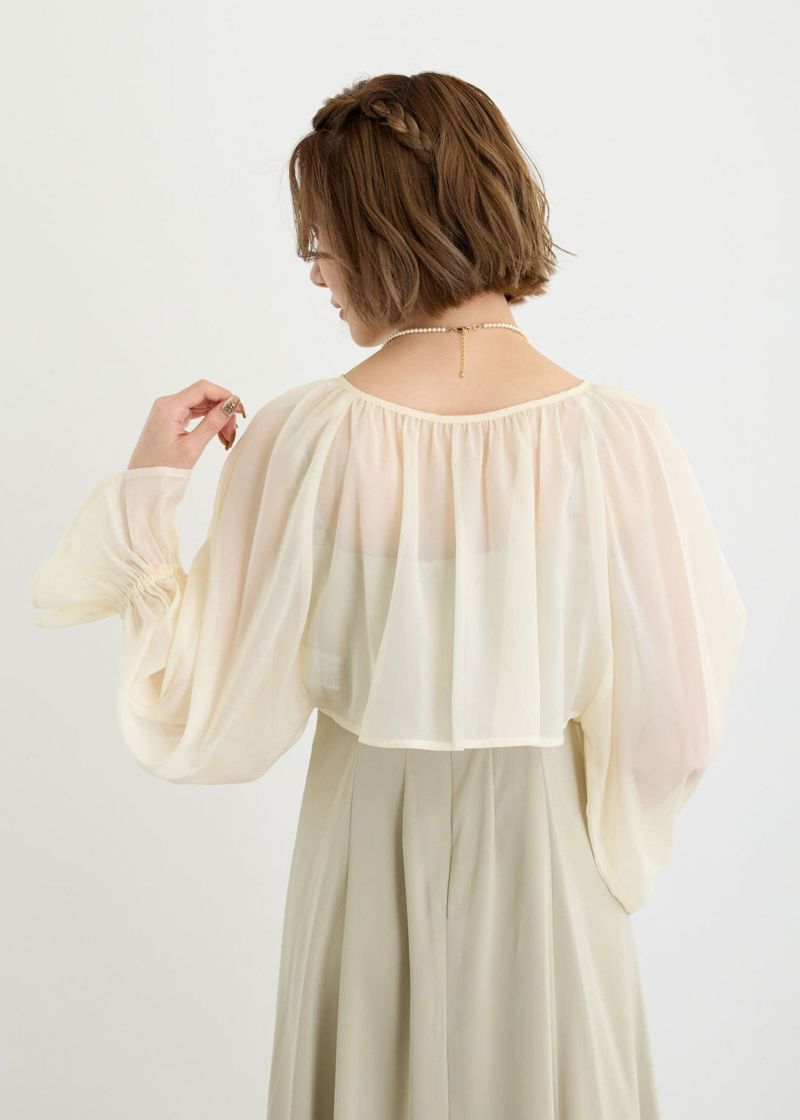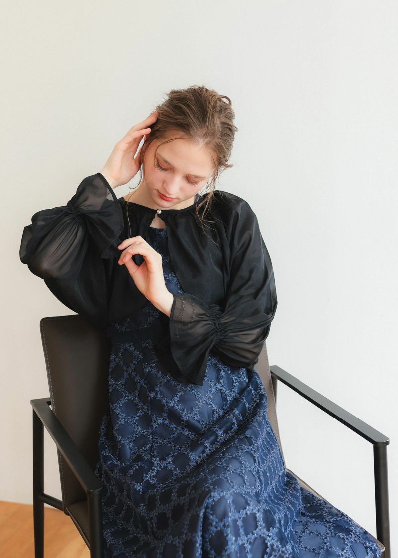 パールボタンを飾り付けたシアーボレロ。