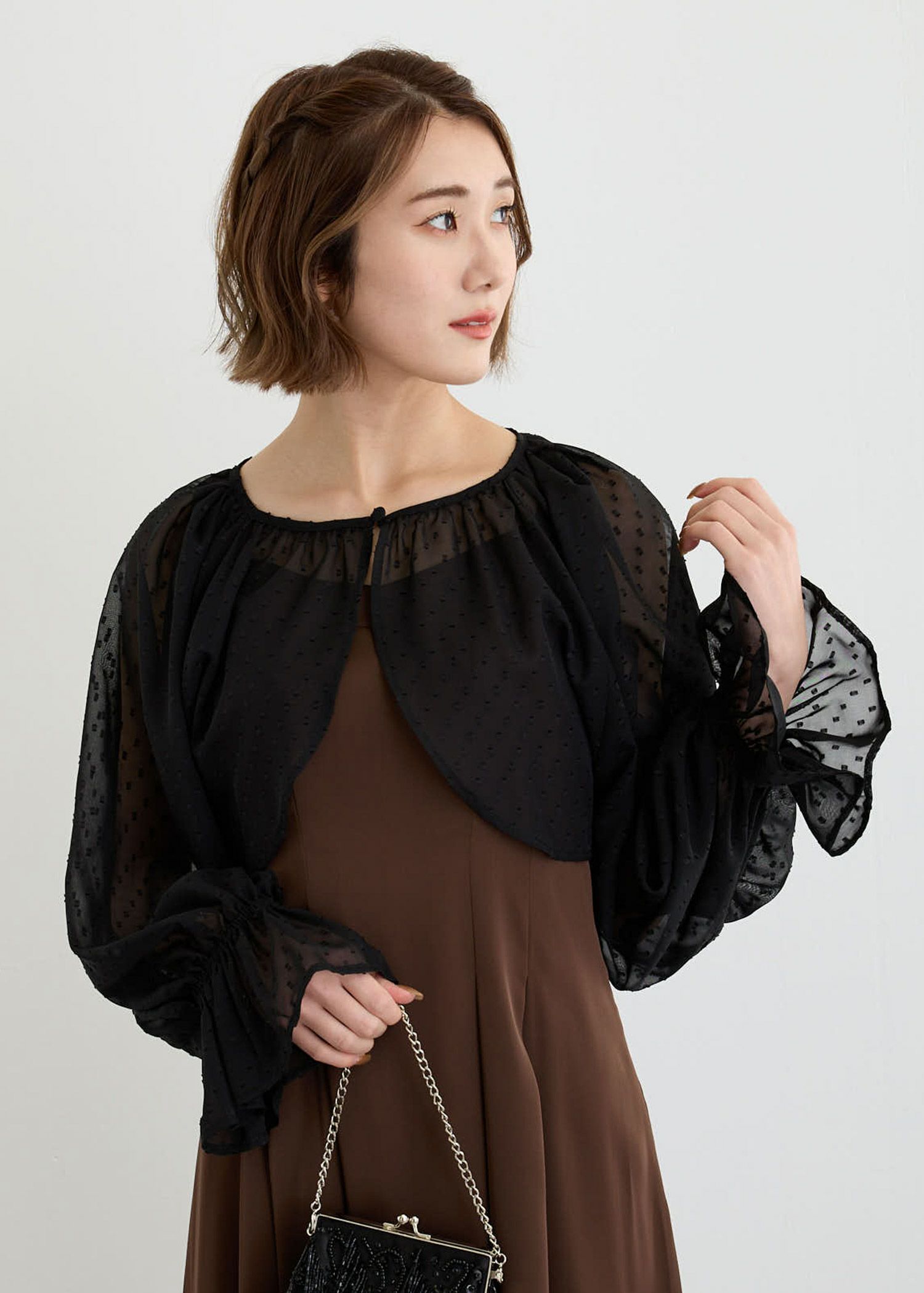 商品説明 パールボタンを飾り付けたたドット柄のシアーボレロ。 さりげないドット柄がアクセントになり、オシャレ度がぐっと上がります。 たっぷり分量のキャンディスリーブで気になる二の腕をカバーしてくれます。 羽織るだけで上品かつ華やかさを醸し出します。 ショート丈なので、どんなドレススタイルにも合わせやすいのもポイント。 お手持ちのキャミワンピース合わせもおすすめです。 しわになりにくく、かさばらないのでバッグに携帯して防寒や夏の冷房・紫外線対策にも◎ ※ハンガー掛けの商品画像が実際の商品のお色味に近くなっております。 ※商品画像は、光の当たり具合やパソコンなどの閲覧環境により、 実際の色味と異なって見える場合がございます。予めご了承ください。 こちらの商品はWeb限定商品です。 おすすめのシーン 結婚式・披露宴・二次会・同窓会・謝恩会など 多様なシーンのコーディネートに使えます。 商品詳細 【備考】 ・前つき合せくるみボタンあり ・伸縮性なし ・透け感あり ・袖口ゴム入り 洗濯方法:クリーニング店にご相談ください。 ※その他お取り扱いに関しましては、商品に付属のアテンションタグをご覧ください。 原産国:中国 お問い合わせ品番:24321
