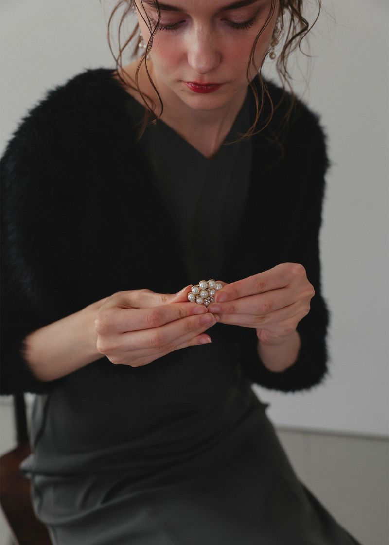 パールとビジューをあしらったブローチ付きで、さらに華やかさをプラスしてくれます。