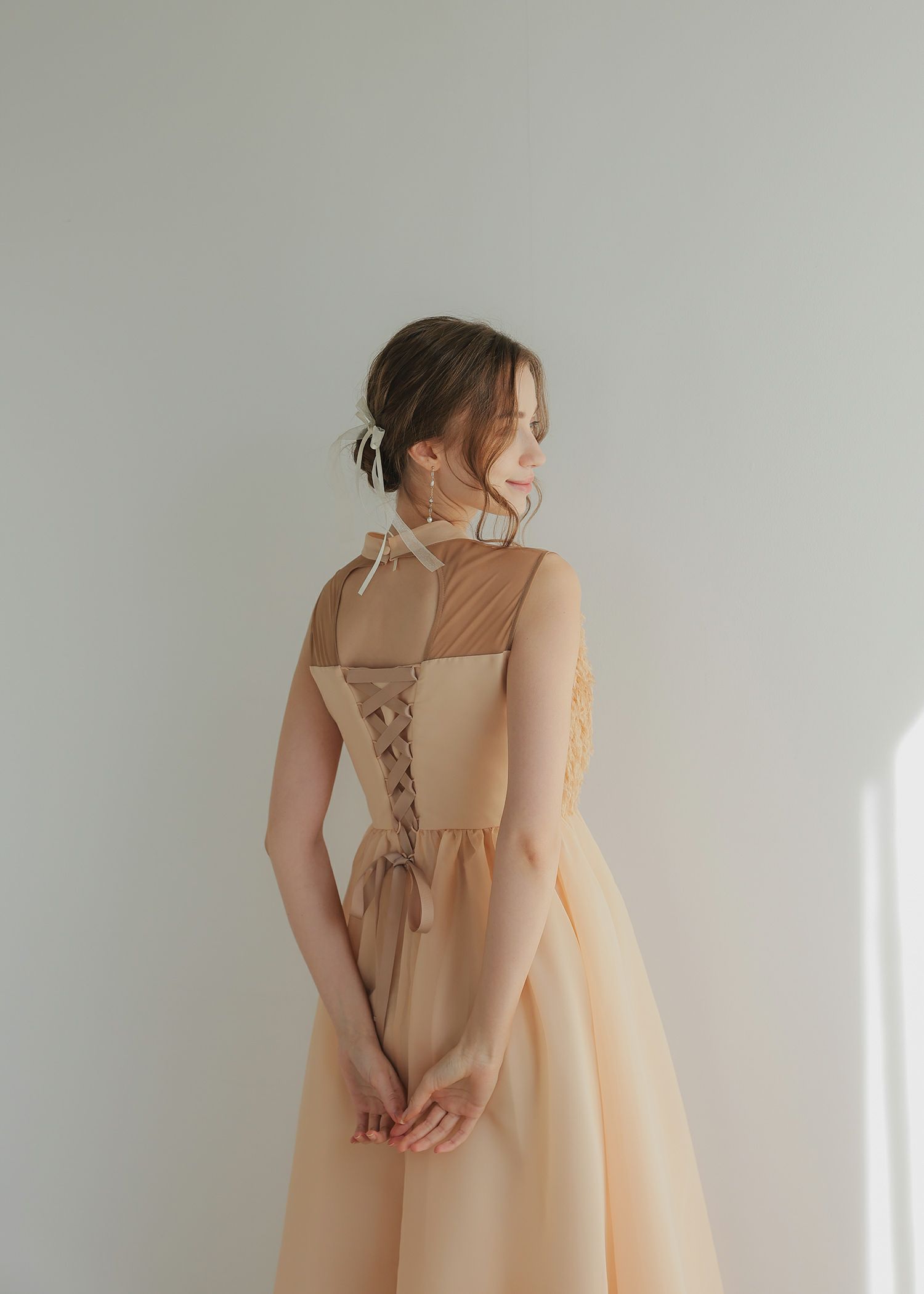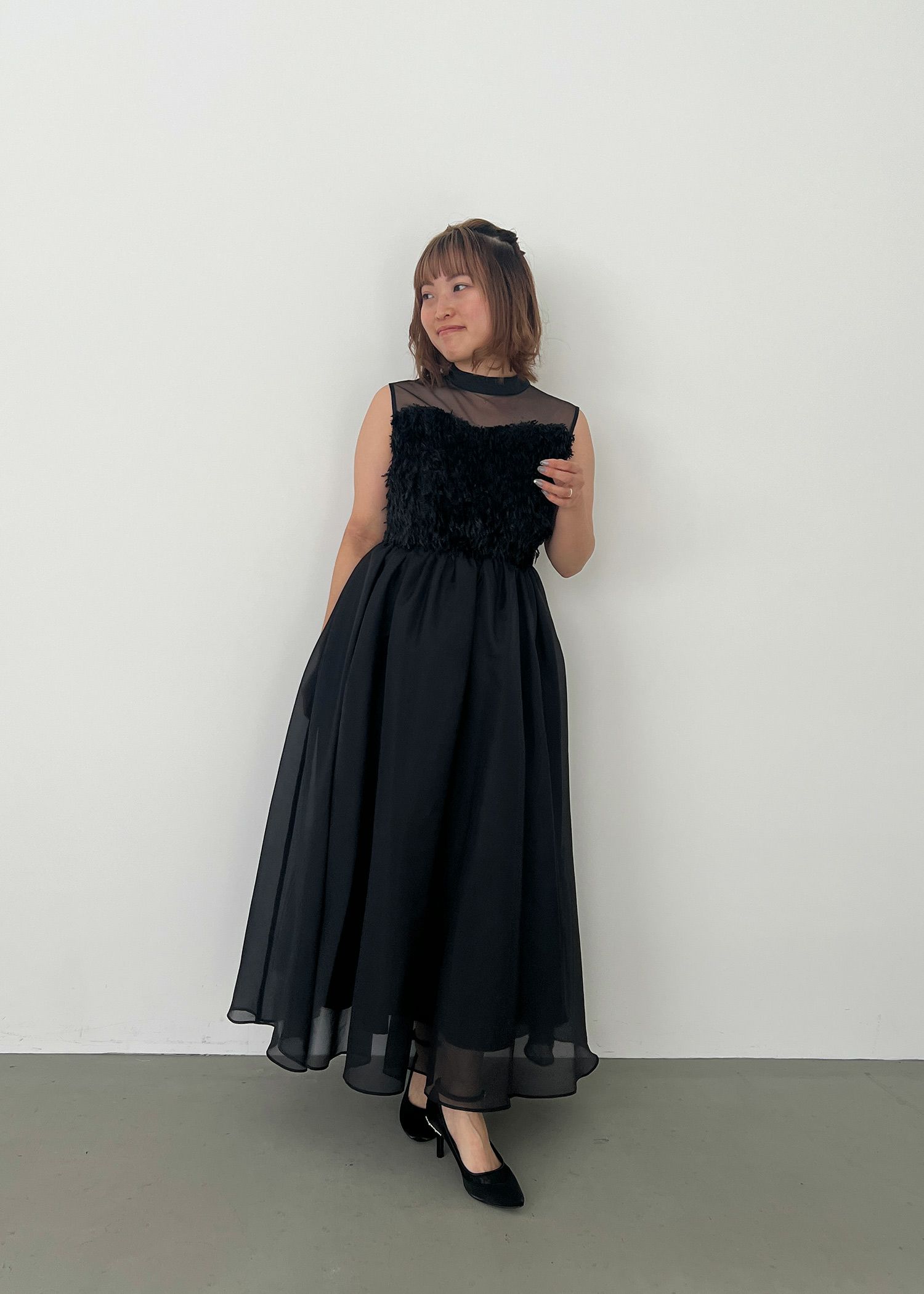 商品説明 胸元にあしらったフリンジデザインが目を惹くドレス。 首元部分は程よい透け感の肌見せのおかげで、適度な抜け感を。 肌触りも滑らかで着心地抜群です◎ バック部分は、ハートカットのように生地を切り抜く事で、 後ろから見た際も抜かりないオシャレさを追求しました。 またスピンドル仕様でお作りしているため、ウエスト部分を調節できるのも嬉しいポイント。 スカート部分はチュール生地とオーガンジー地を重ねる事で、 動くたびふわりと揺れるエレガントさを演出します。 他の人とは被りづらいひとクセ加えた華やかなパーティースタイルに仕上げました。 ※ノースリーブデザインでお作りしている為、結婚式の場合は、羽織りなどで肩を隠してご着用ください。 ※ハンガー掛けの商品画像が実際の商品のお色味に近くなっております。 ※商品画像は、光の当たり具合やパソコンなどの閲覧環境により、 実際の色味と異なって見える場合がございます。予めご了承ください。 おすすめのシーン カジュアルな結婚式・二次会・お呼ばれ・成人式・同窓会・ 女子会・謝恩会 パーティー・演奏会・お食事会など多様なシーンのコーディネートに使えます。 商品詳細 【備考】 ・裏地付き ・伸縮性なし ・デコルテ部分透け感あり ・後ろスピンドル ・左脇サイドファスナー仕様 洗濯方法:クリーニング店にご相談ください。 ※その他お取り扱いに関しましては、商品に付属のアテンションタグをご覧ください。 原産国:中国 お問い合わせ品番:25579