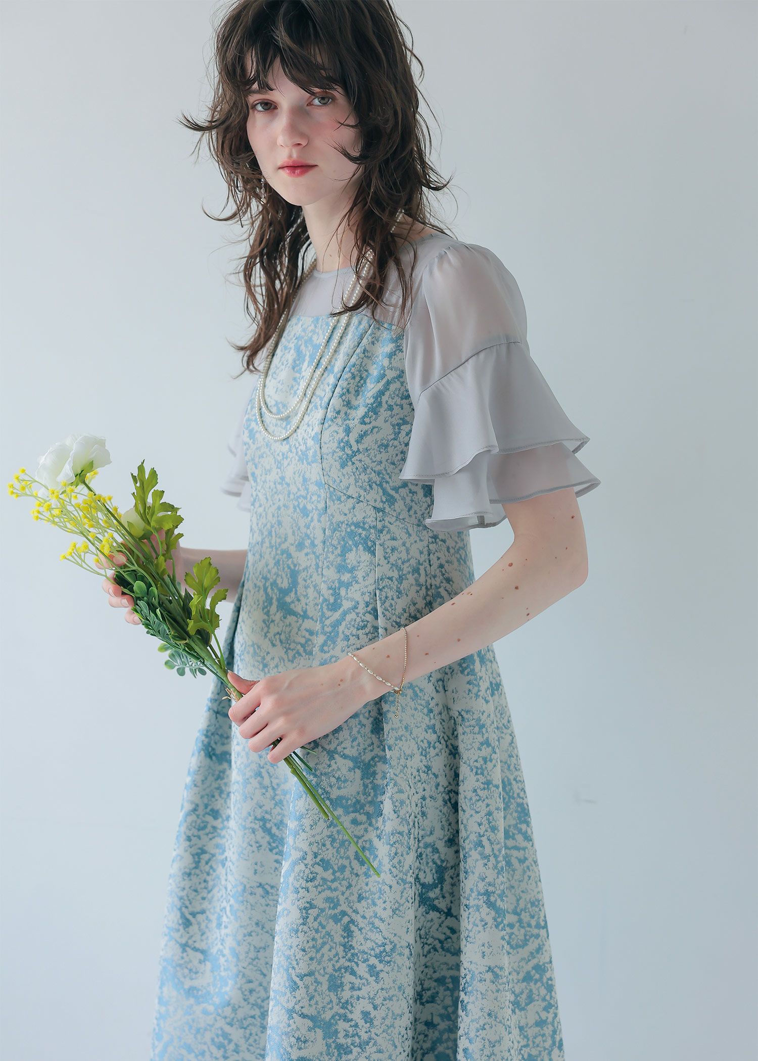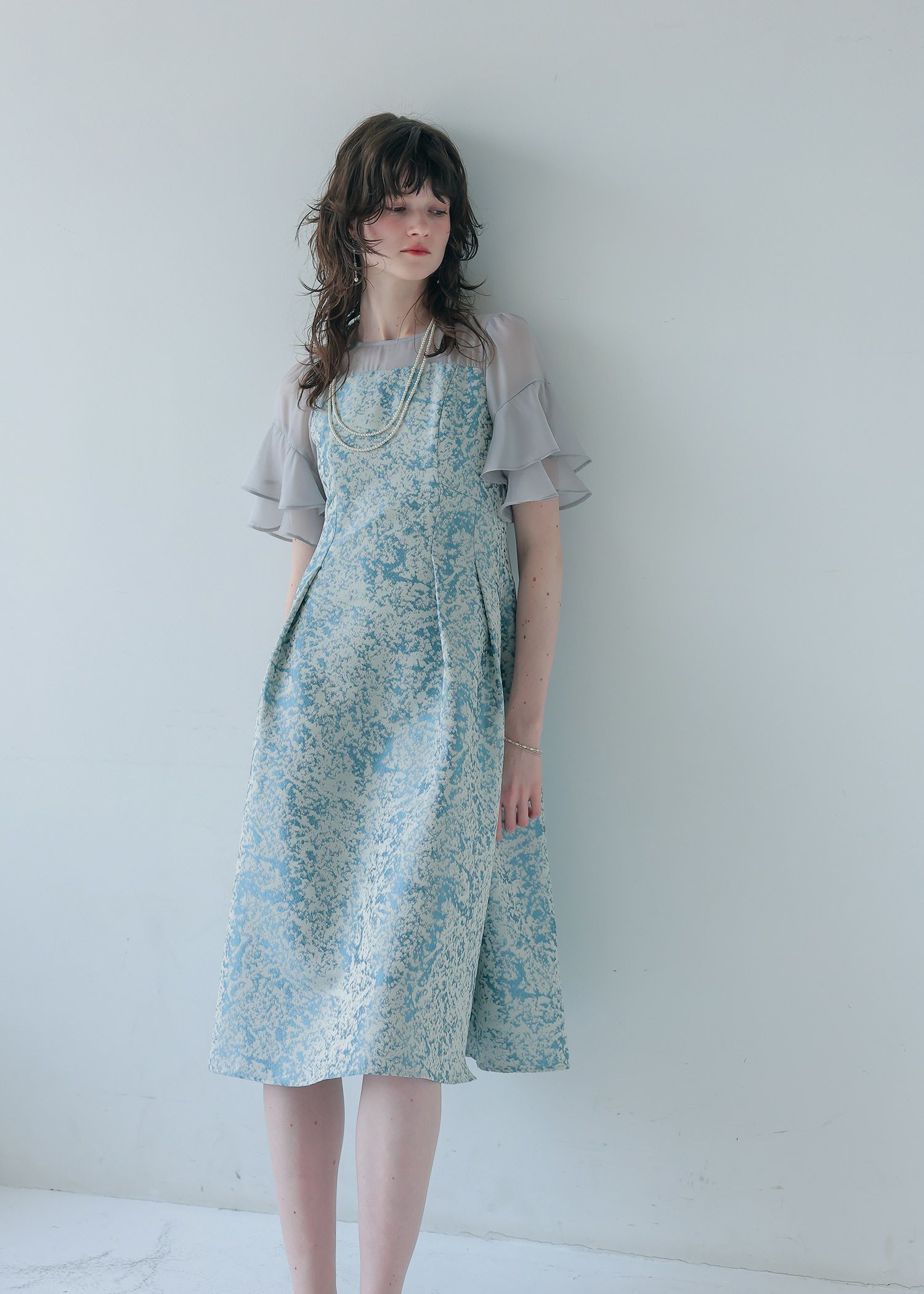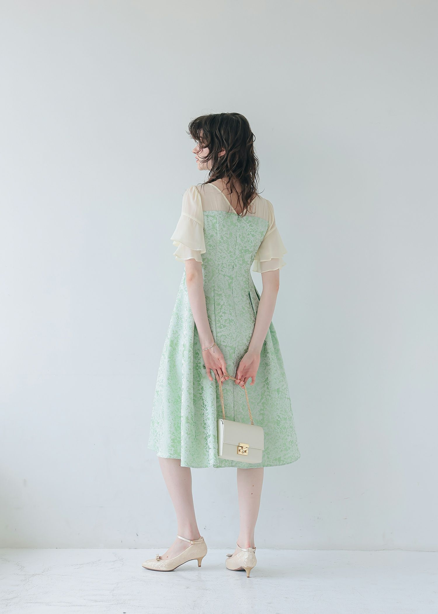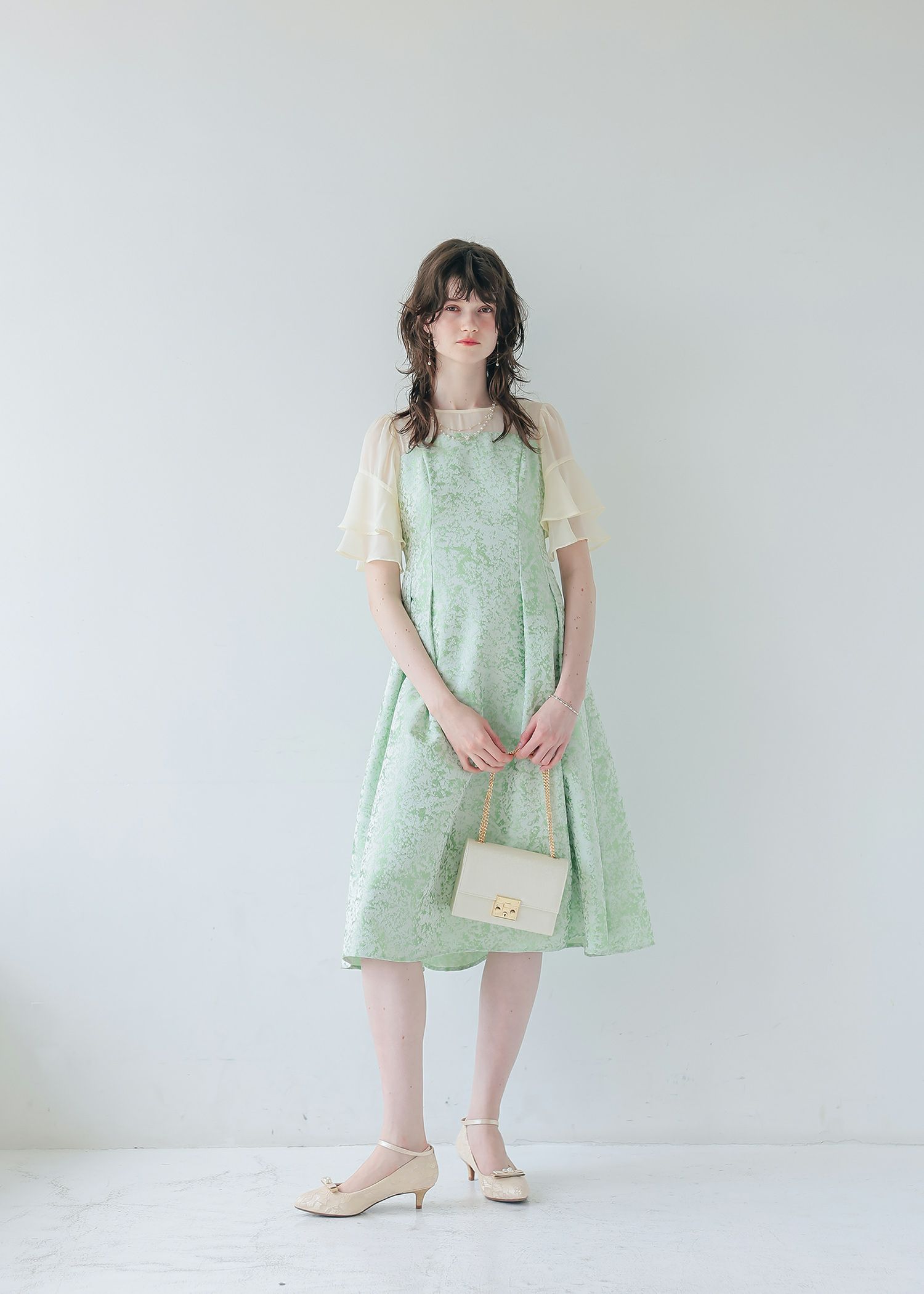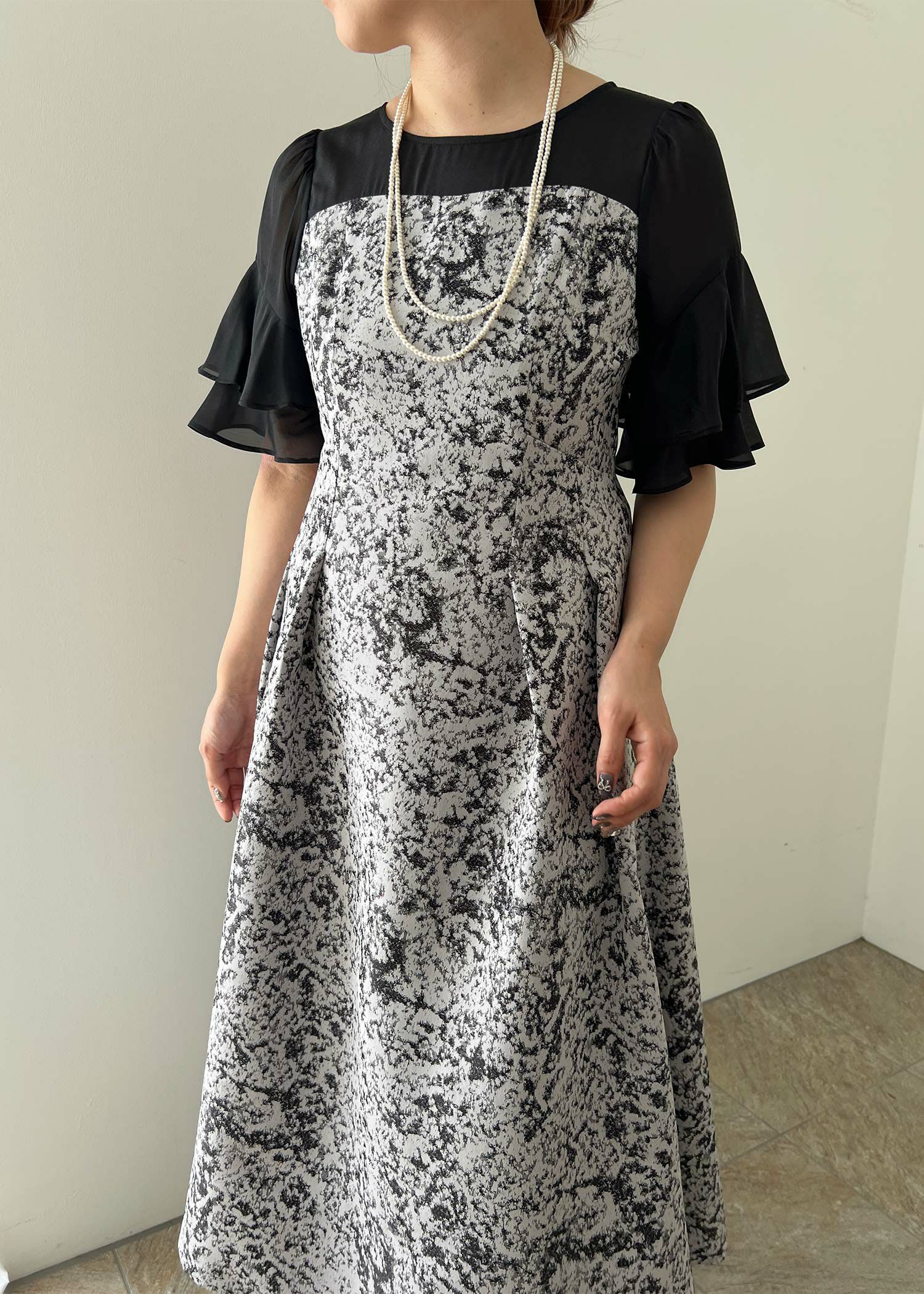 商品説明 モードライクな雰囲気のジャガード生地が目を引くオケージョンドレス。 デコルテと袖部分はシアー素材を使用し抜け感をプラス。 ラッフルスリーブがアクセントになり、肩周りをカバーしつつ 華奢見せさせてくれます。 程よい肌見せと袖のラッフルスリーブで女性らしく。 上半身映えするポイントをぎゅっと詰め込んだ一着。 フィット&フレアのシルエットでメリハリのあるスタイルに仕上がります。 少し短めの着丈なので、低身長の方にもおすすめです。 オケージョンシーンだけでなく、デイリーにも使いやすい大人のドレス。 結婚式や披露宴、二次会、ディナー、パーティー、お出かけなど幅広いシーンで大活躍してくれる一着です。 ※商品画像は、光の当たり具合やパソコンなどの閲覧環境により、 実際の色味と異なって見える場合がございます。予めご了承ください。 おすすめのシーン 結婚式・披露宴・二次会・同窓会・謝恩会など 多様なシーンのコーディネートに使えます。 商品詳細 【備考】 ・裏地あり ・伸縮性なし ・デコルテに透け感あり ・バックファスナー仕様 洗濯方法:クリーニング店にご相談ください。 ※その他お取り扱いに関しましては、商品に付属のアテンションタグをご覧ください。 原産国:中国