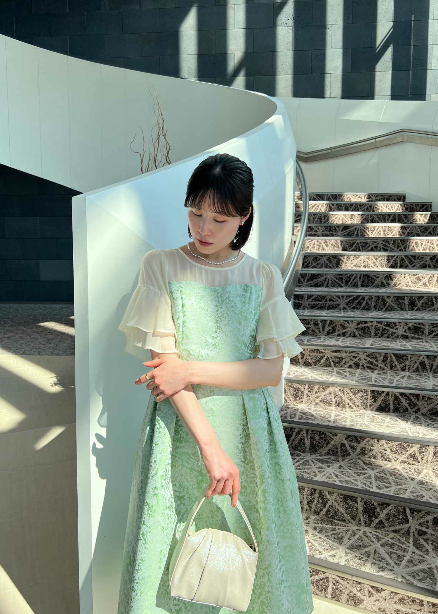 商品説明 モードライクな雰囲気のジャガード生地が目を引くオケージョンドレス。 デコルテと袖部分はシアー素材を使用し抜け感をプラス。 ラッフルスリーブがアクセントになり、肩周りをカバーしつつ 華奢見せさせてくれます。 程よい肌見せと袖のラッフルスリーブで女性らしく。 上半身映えするポイントをぎゅっと詰め込んだ一着。 フィット&フレアのシルエットでメリハリのあるスタイルに仕上がります。 少し短めの着丈なので、低身長の方にもおすすめです。 オケージョンシーンだけでなく、デイリーにも使いやすい大人のドレス。 結婚式や披露宴、二次会、ディナー、パーティー、お出かけなど幅広いシーンで大活躍してくれる一着です。 ※商品画像は、光の当たり具合やパソコンなどの閲覧環境により、 実際の色味と異なって見える場合がございます。予めご了承ください。 おすすめのシーン 結婚式・披露宴・二次会・同窓会・謝恩会など 多様なシーンのコーディネートに使えます。 商品詳細 【備考】 ・裏地あり ・伸縮性なし ・デコルテに透け感あり ・バックファスナー仕様 洗濯方法:クリーニング店にご相談ください。 ※その他お取り扱いに関しましては、商品に付属のアテンションタグをご覧ください。 原産国:中国 着丈バストウエストヒップ肩幅袖丈 M:111.590741033229 L:114.594781063330 単位(cm) ▼着用サイズ modelsize 外国人モデル身長176cm ▼着用サイズ全てMsize staff着用/身長153cm(ブルー・ブラック) staff着用/身長160cm(グリーン) お問い合わせ品番:25608 着丈ガイド REVIEW レビュー