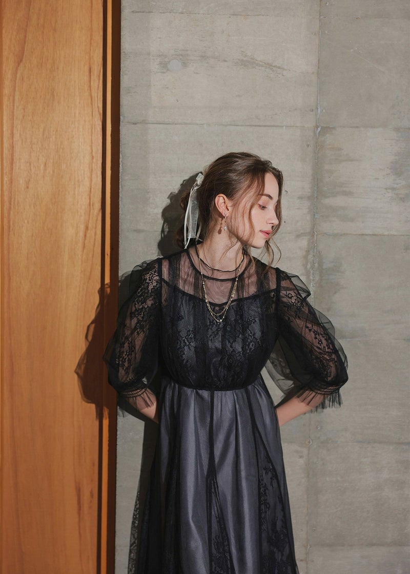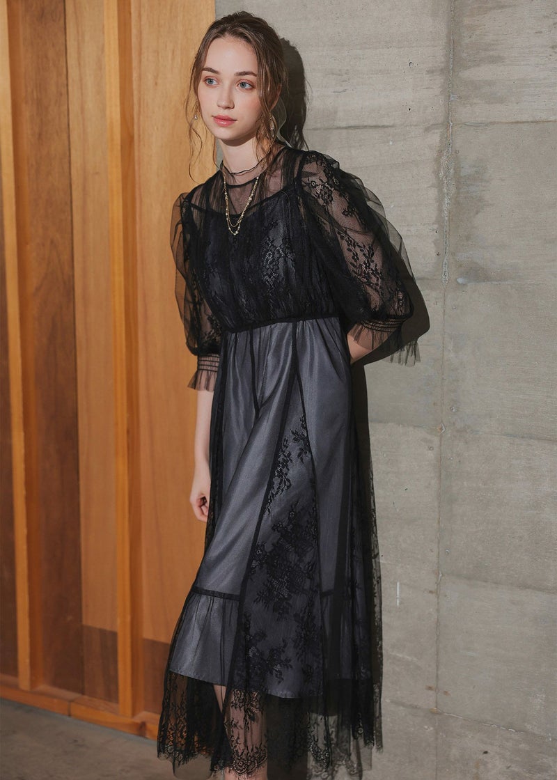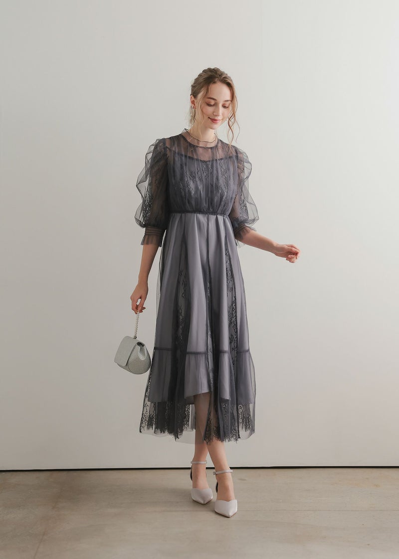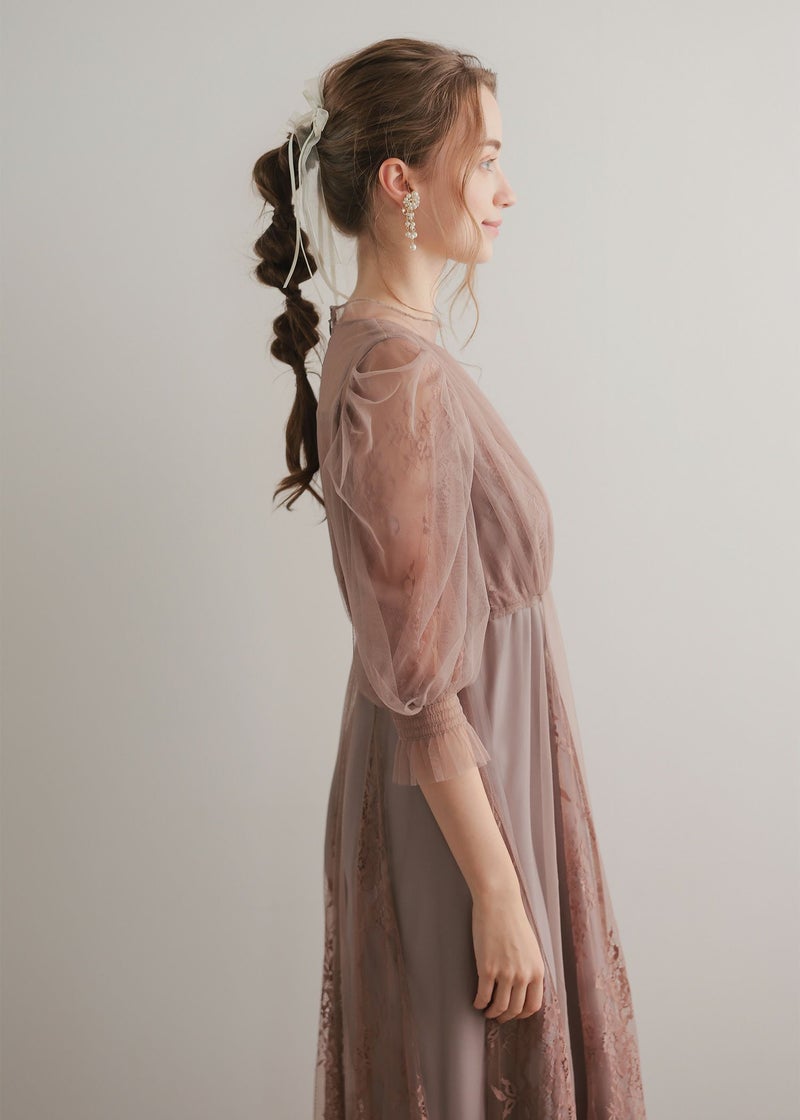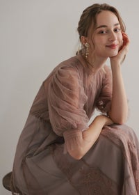 柔らかなフラワーモチーフレースとチュール素材を組み合わせたドレス。