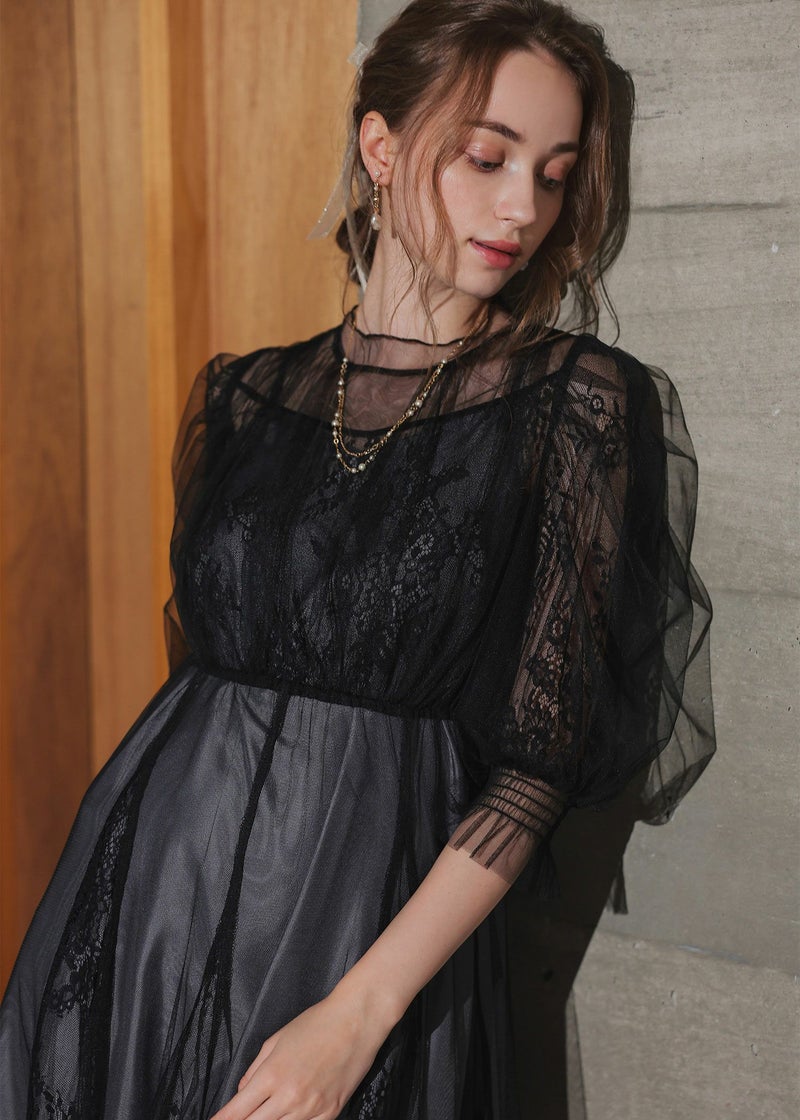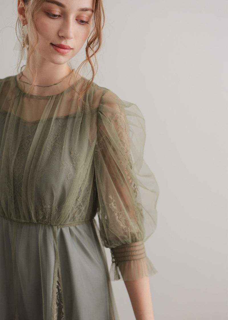 レースの切り替えや胸元のピンタック、レディライクなパフスリーブなど、