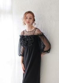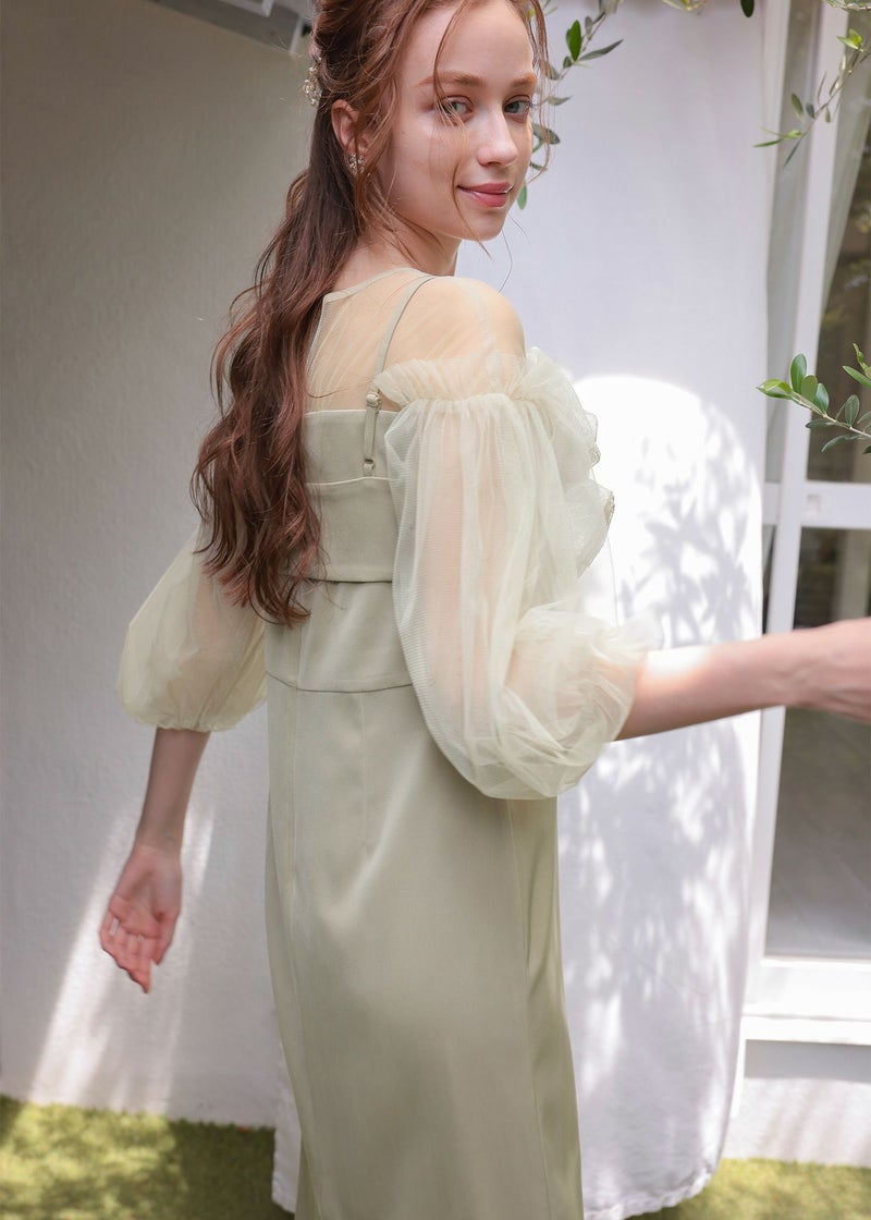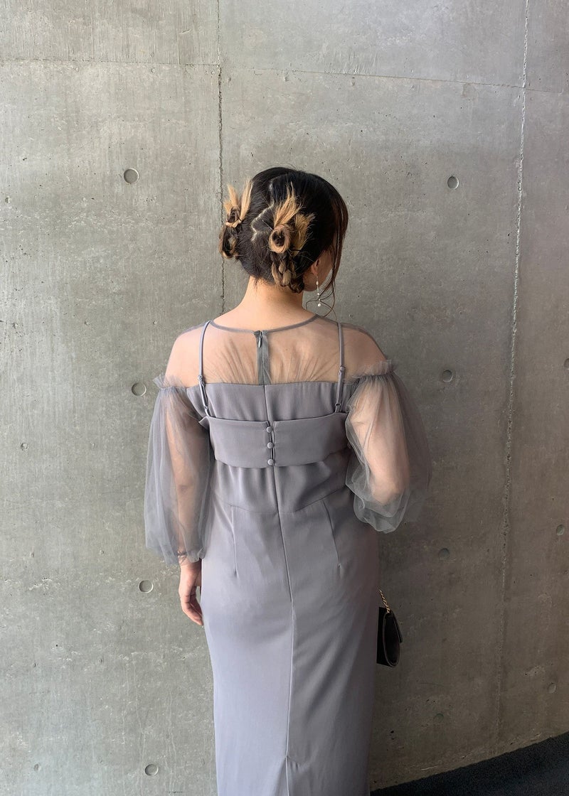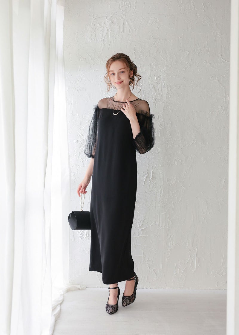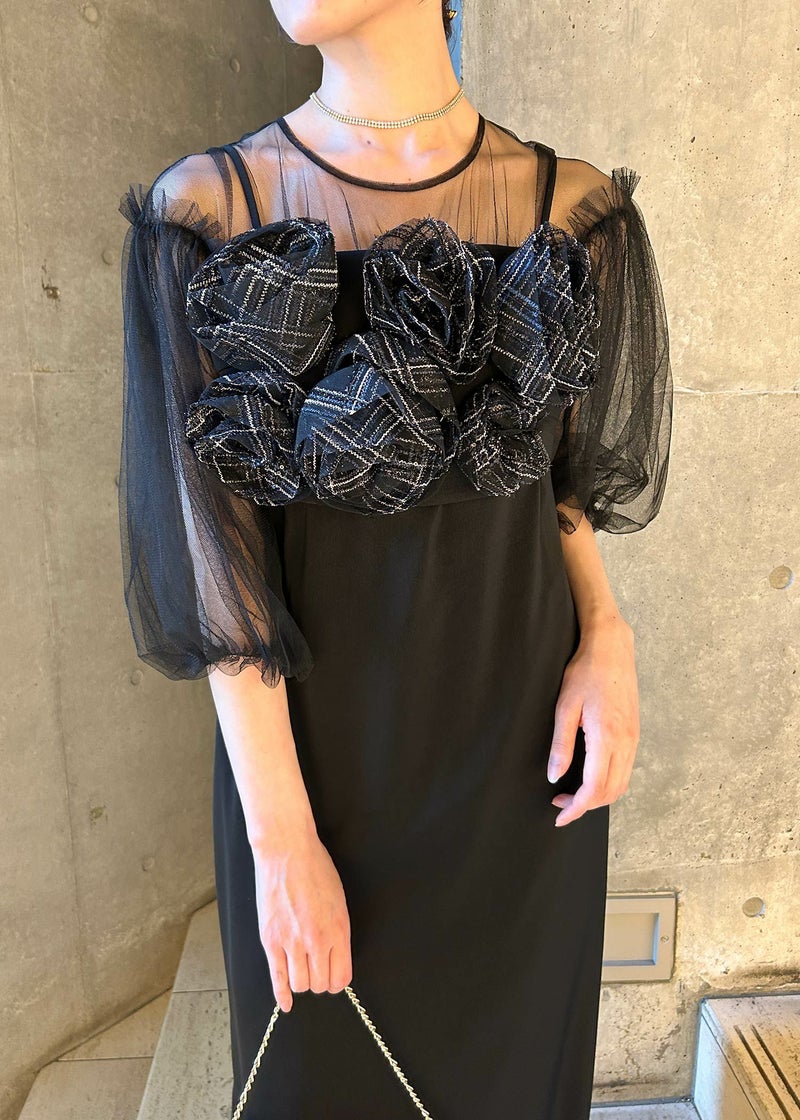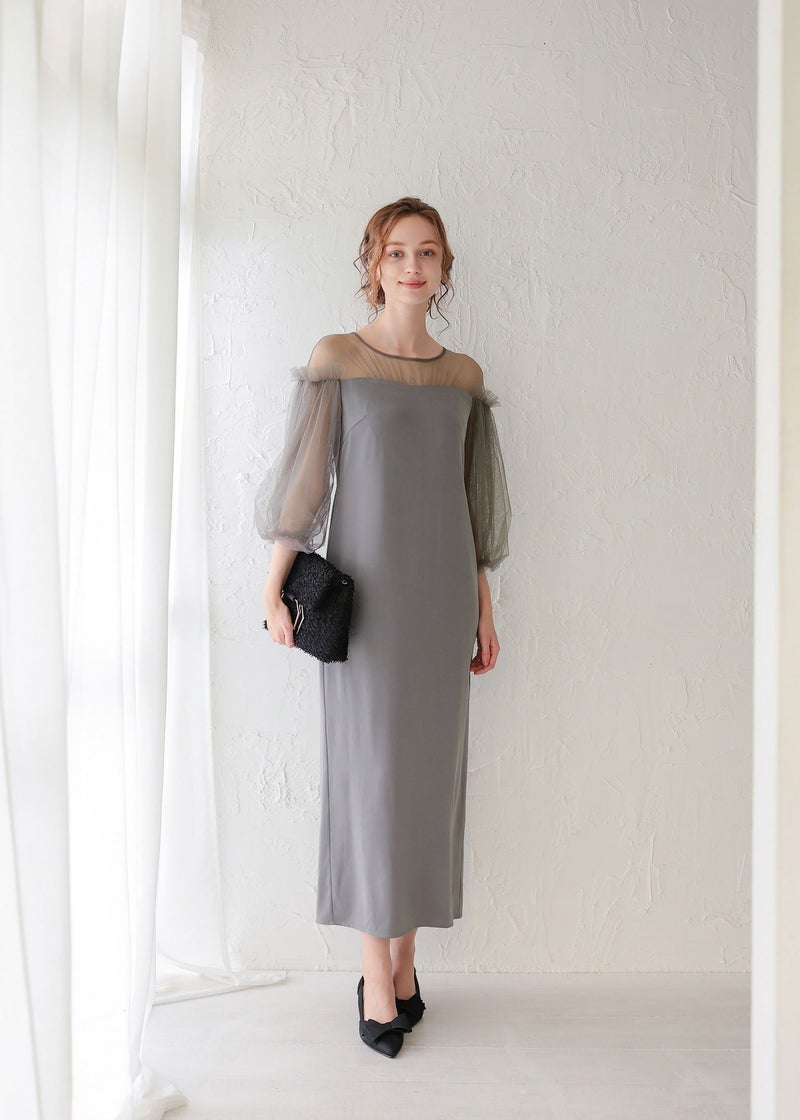 袖のチュールスリーブをワンピースと異なる素材を使うことで、洗練された印象に。