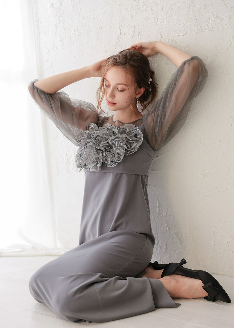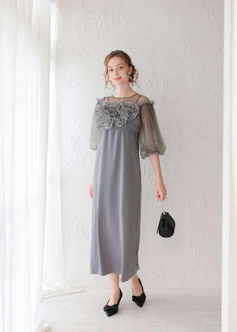 胸元のバラモチーフが目を惹くドレス。
