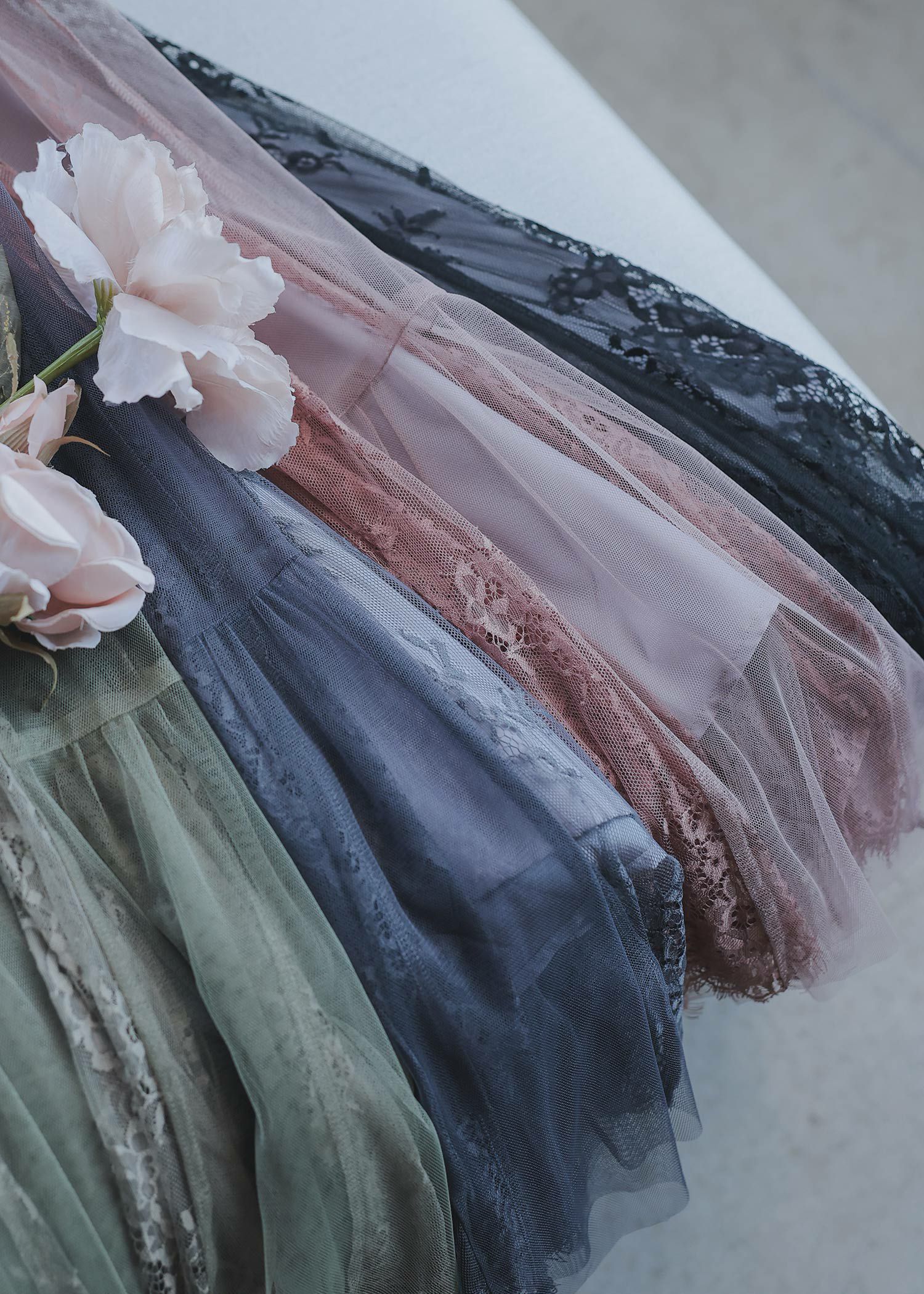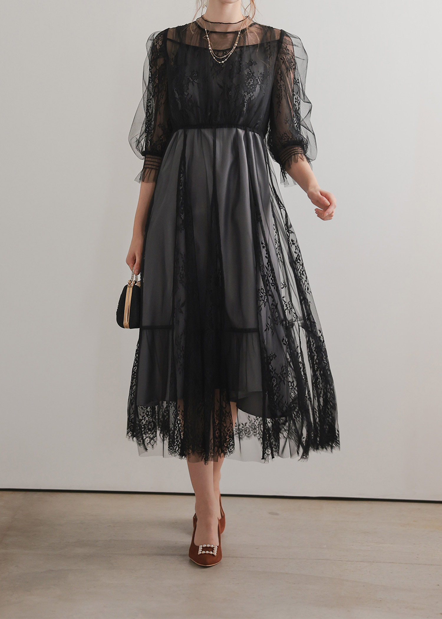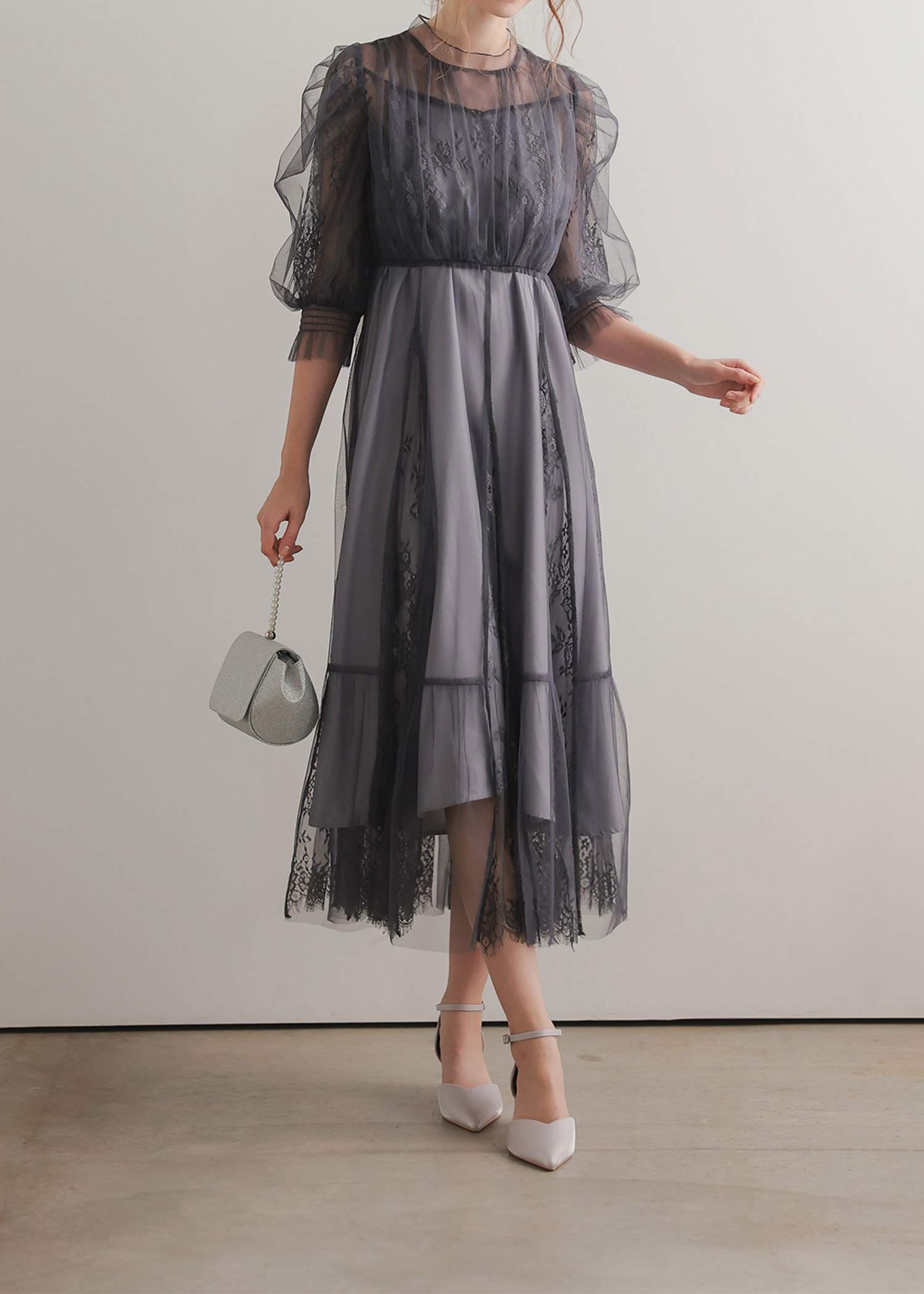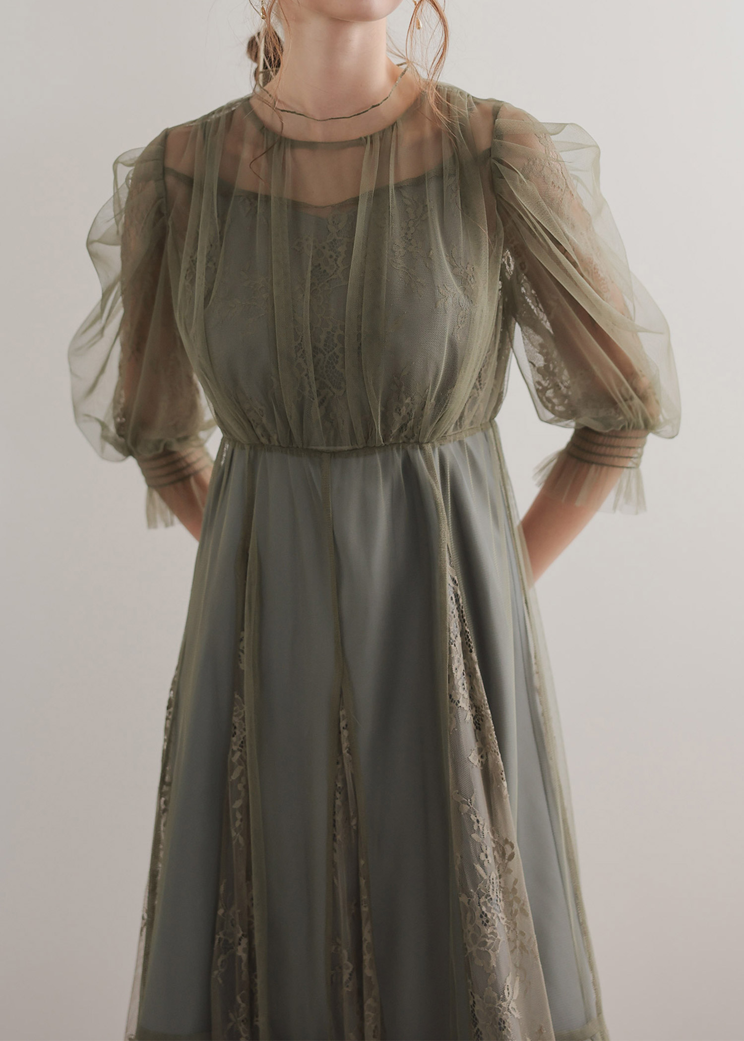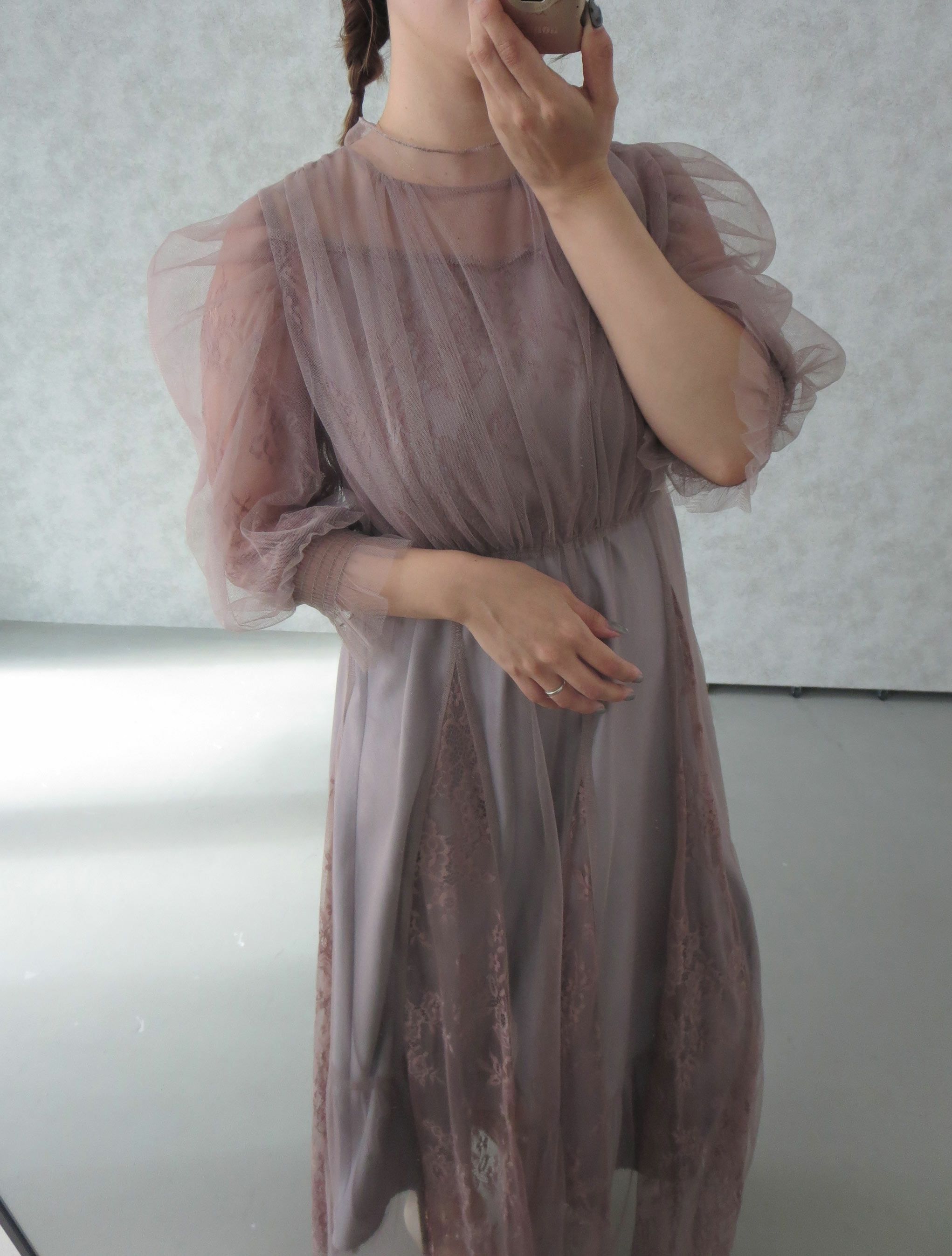 柔らかなフラワーモチーフレースとチュール素材を組み合わせたドレス。 チュールがエアリーに広がりきるだけで華やかな印象になります。 レースの切り替えや胸元のピンタック、レディライクなパフスリーブなど、 360℃どこから見ても絵になるクラシカルなディティールを贅沢に詰め込みました。 動くたびにスカートが広がるシルエットで、まるで花弁をその身に纏うかのようなドレスです。 裾のスカラップカットは上品さを演出。 気になる二の腕をおしゃれにカバーし、ウエスト周り全体にゴムが入っていてストレスフリーも実現。 ※ハンガー掛けの商品画像が実際の商品のお色味に近くなっております。 ※商品画像は、光の当たり具合やパソコンなどの閲覧環境により、 実際の色味と異なって見える場合がございます。予めご了承ください。 外国人着用モデル身長172cm グリーン着用SNAP身長158cm ブラック着用SNAP身長158cm モカチャ着用SNAP身長153cm チャコール着用SNAP身長153cm
