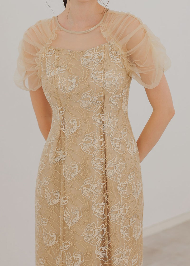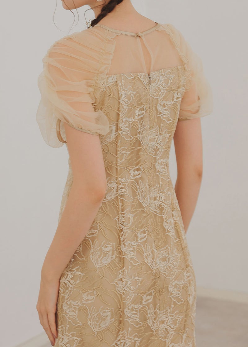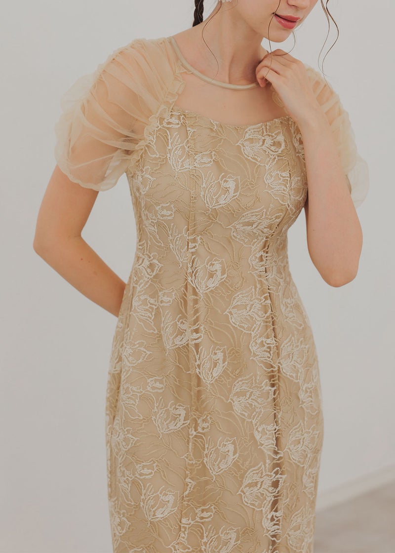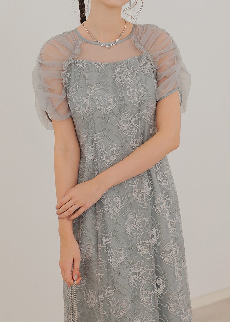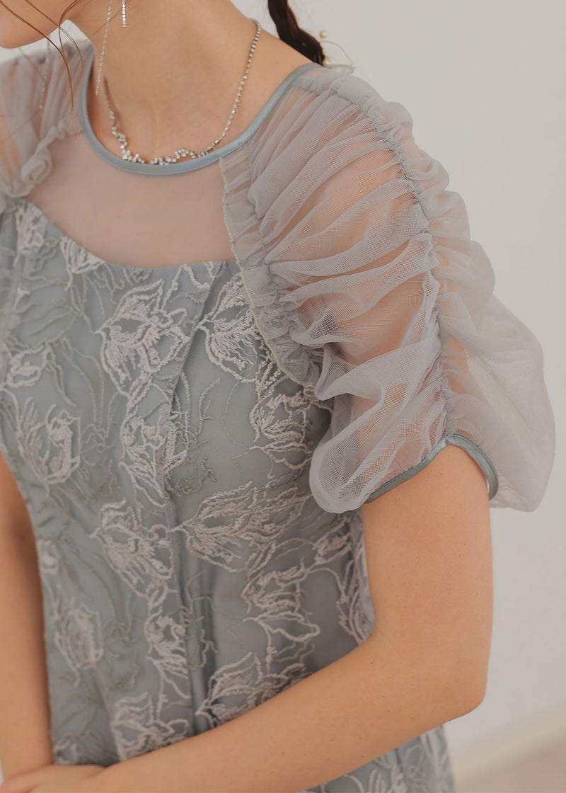 お袖~デコルテ部分は程よいシアー感にすることで、軽やかさと女性らしさをプラス。