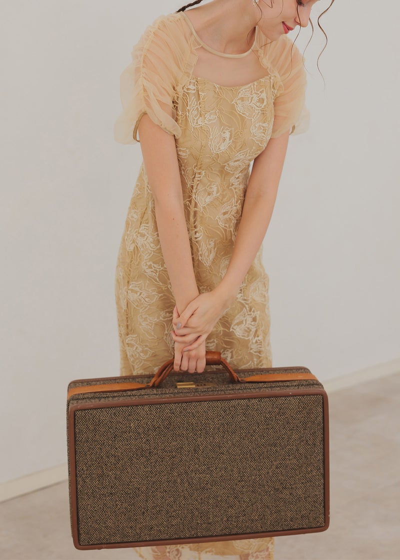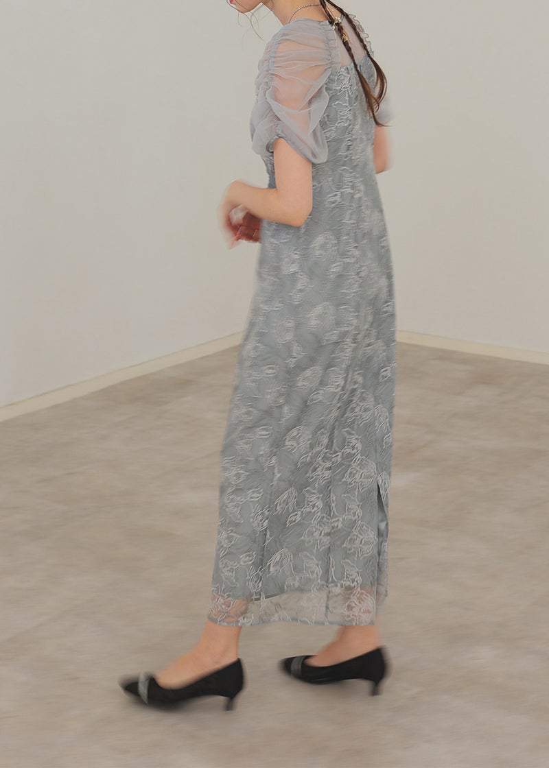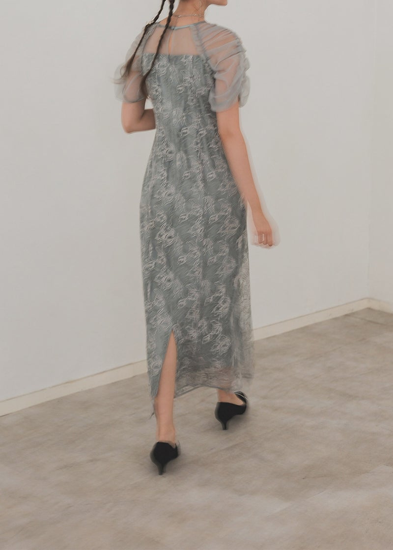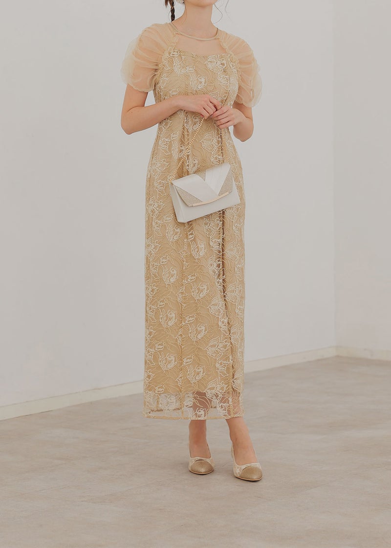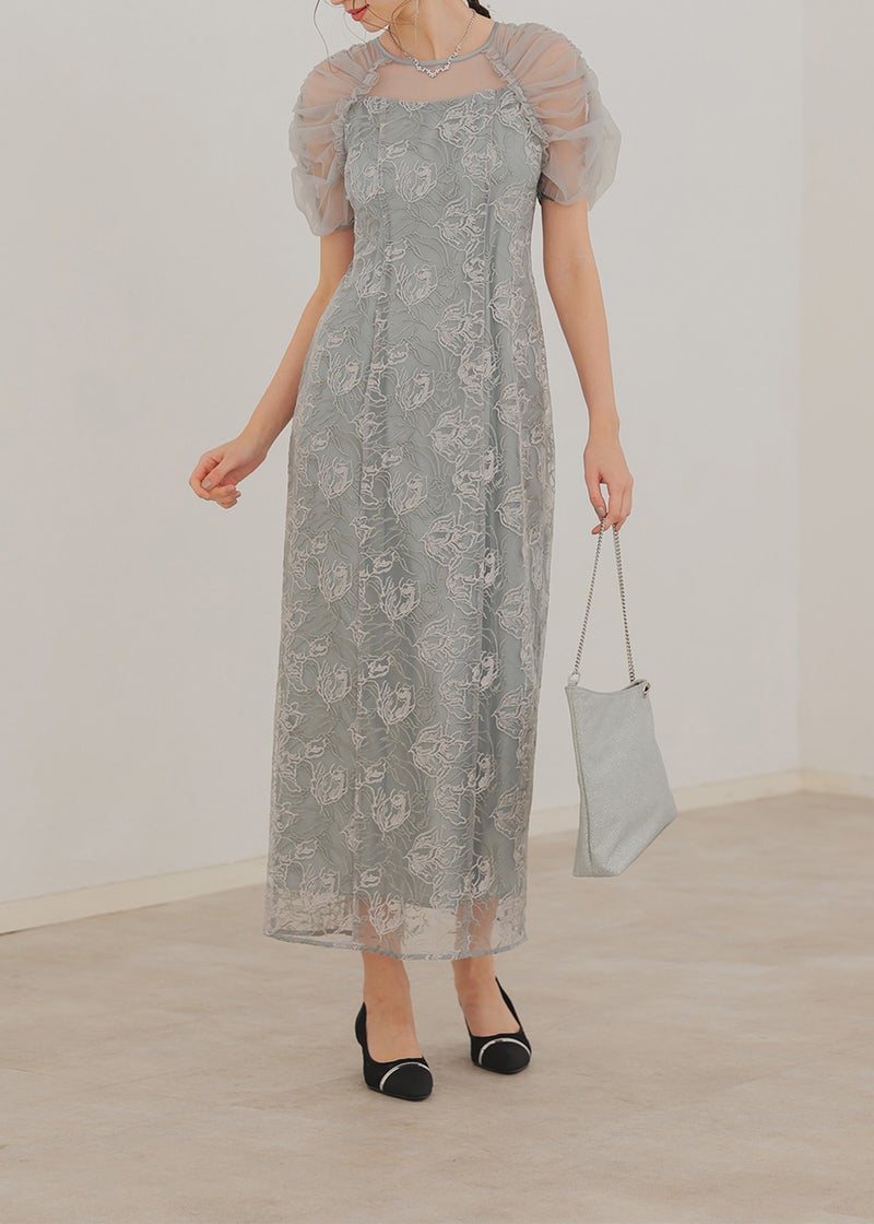 フラワー刺繍と落ち着いたカラーがフェミニンさを醸し出すドレス。