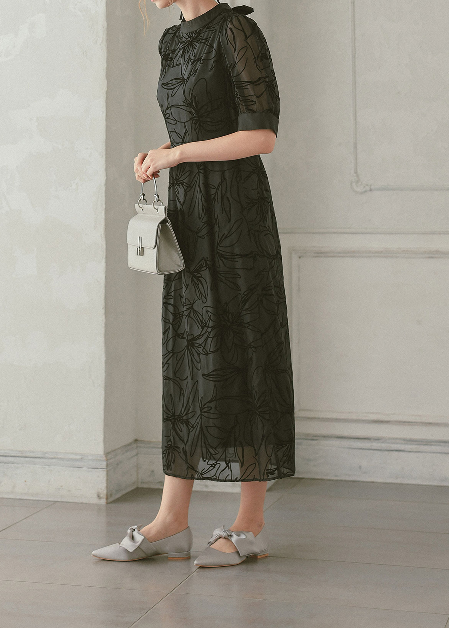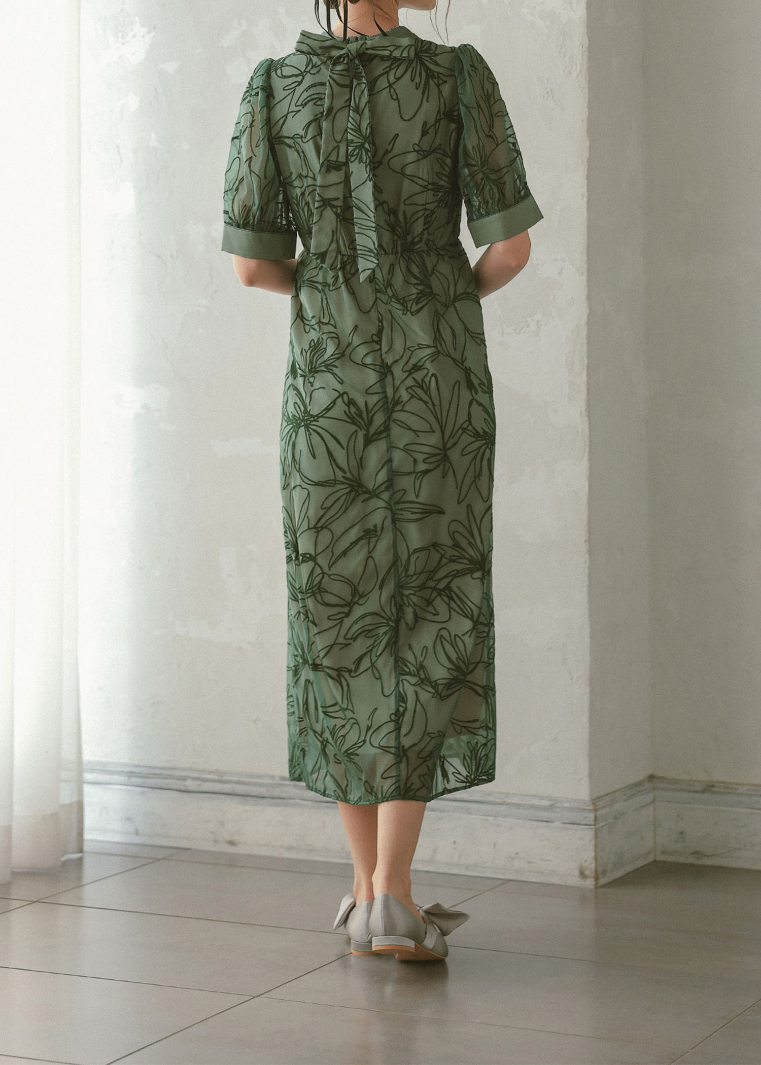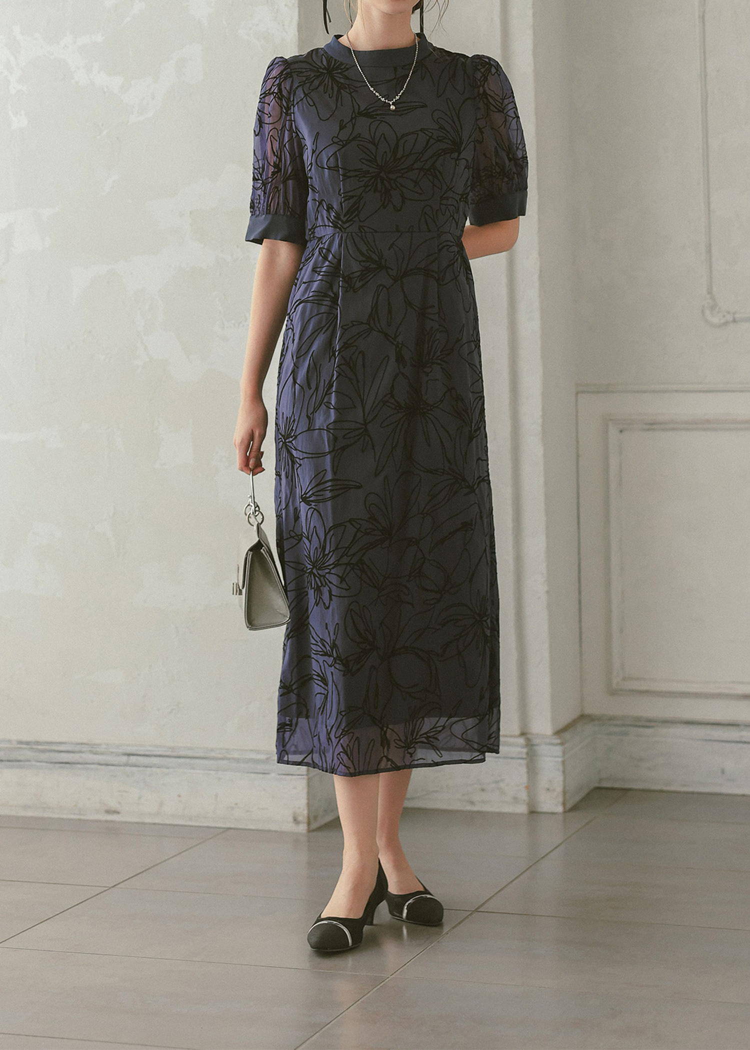 大人っぽい雰囲気の花柄Iラインドレス