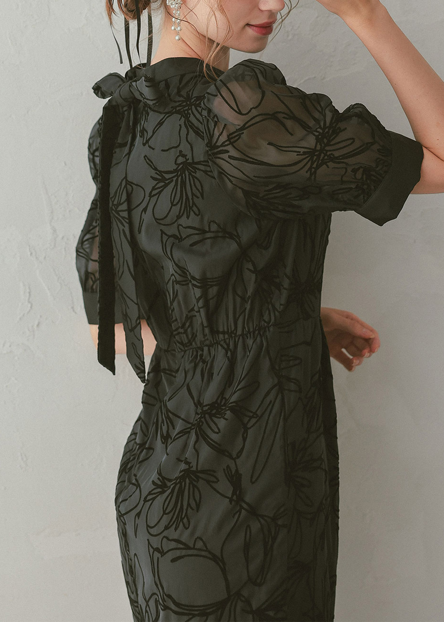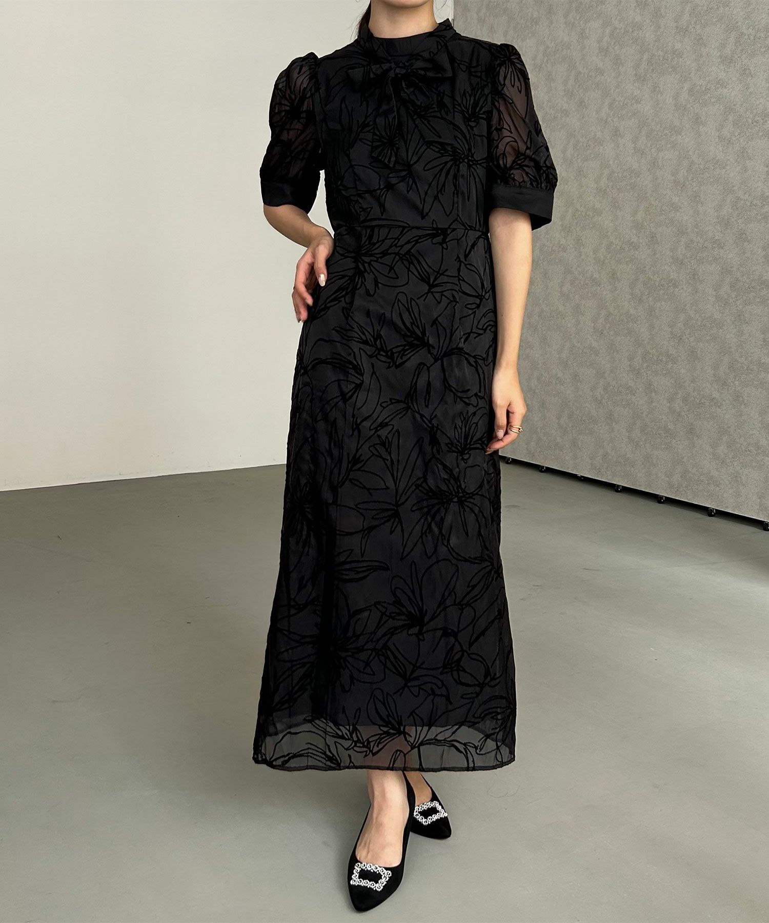 生地には、人気のボウタイボレロセットドレス(商品番号:82658)と共通のフロッキー生地を使用。