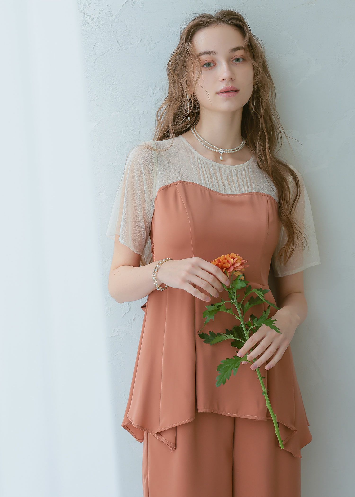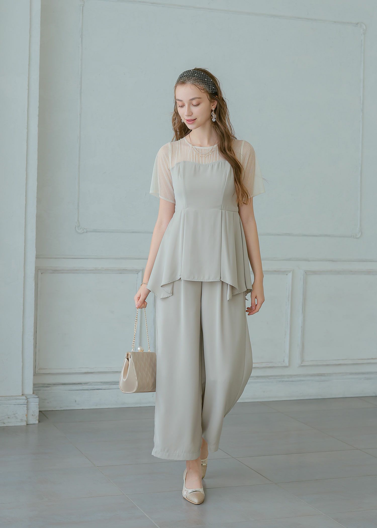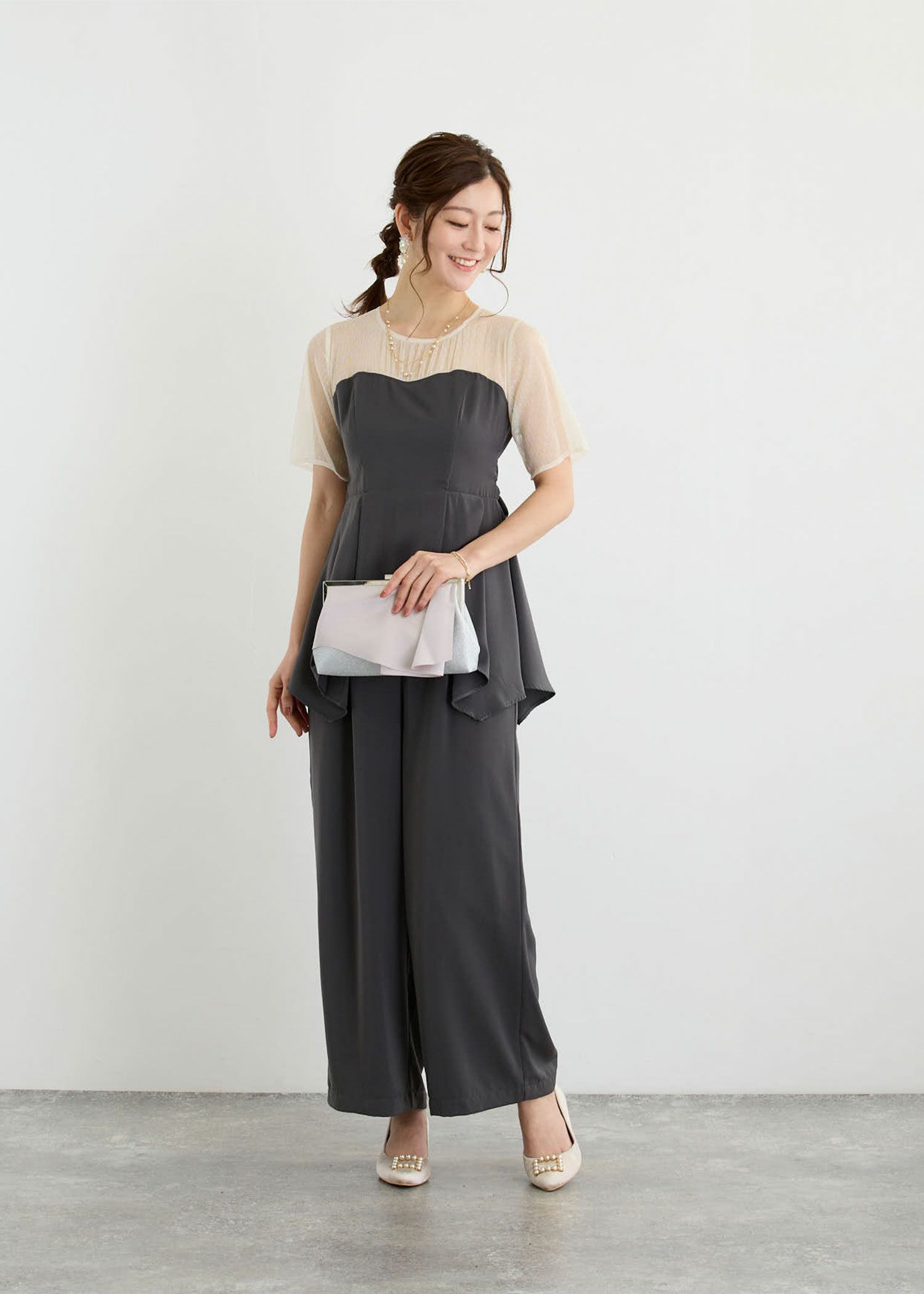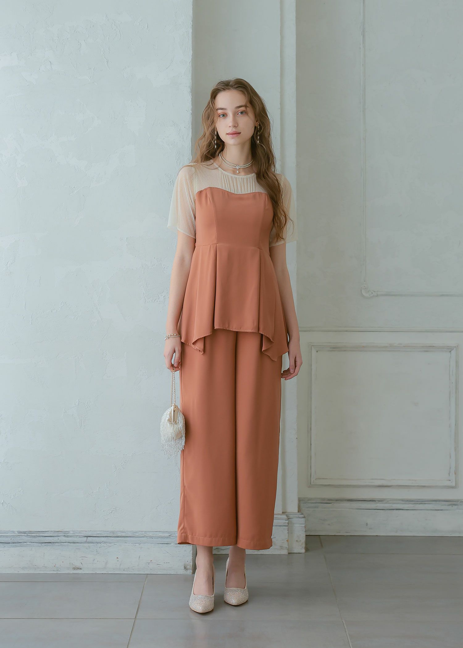 商品説明 ペプラムデザインが程よいフェミニンさを感じさせてくれるパンツドレス ペプラムデザインはウエスト周りの体形カバーにもなり、スタイルアップ効果があるのも嬉しいポイント。 さらに、ウエスト部分はリボンを後ろで結ぶデザインとなっており、 ウエストを引き締まって見せてくれる上、後ろ姿の可愛らしさもプラスしてくれます。 後ろ身頃部分にはゴムシャーリングを施し、着心地も楽ちん♪ デコルテや袖部分はシアーなチュール素材を使用することで、軽やかさと女性らしさをプラス。 本体部分には微光沢のとろみサテンを使用しており、上品でドレッシーな雰囲気に仕上げました。 クールな印象のパンツドレスに、フェミニンな要素を絶妙にプラスした、 カッコよさと可愛らしさのいいとこ取りのドレスです♪ パンツドレス初心者の方にもおすすめな1点です! ※ハンガー掛けの商品画像が実際の商品のお色味に近くなっております。 ※商品画像は、光の当たり具合やパソコンなどの閲覧環境により、 実際の色味と異なって見える場合がございます。予めご了承ください。 外国人モデル着用サイズ 172cm/Mサイズ 日本人モデル着用サイズ 160cm/158㎝ Mサイズ(オレンジ) 日本人モデル着用サイズ 166cm/165㎝ Mサイズ(チャコール※販売終了) 日本人モデル着用サイズ 160cm Mサイズ(ブラック※販売終了) 日本人モデル着用サイズ 158cm Mサイズ(ベージュ) おすすめのシーン 結婚式・披露宴・二次会・同窓会・謝恩会など 多様なシーンのコーディネートに使えます。 商品詳細 【備考】 ・デコルテ部分透け感あり ・その他透け感なし ・伸縮性なし ・後ろ身頃ゴムシャーリング部分伸縮性あり ・後ろ中心ファスナー 洗濯方法:クリーニング店にご相談ください。 ※その他お取り扱いに関しましては、商品に付属のアテンションタグをご覧ください。 原産国:中国 お問い合わせ品番:24914 着用モデル身長172cm
