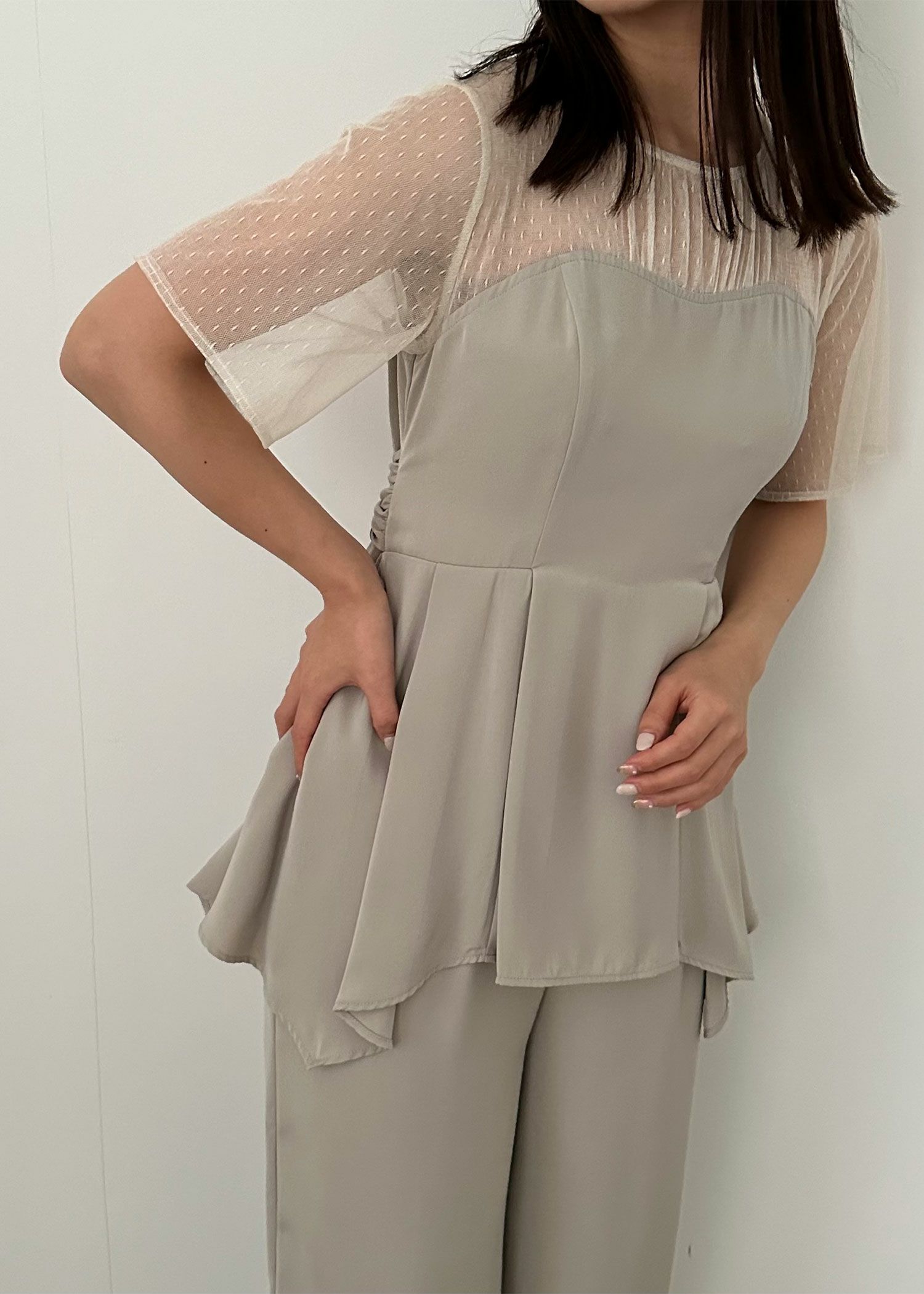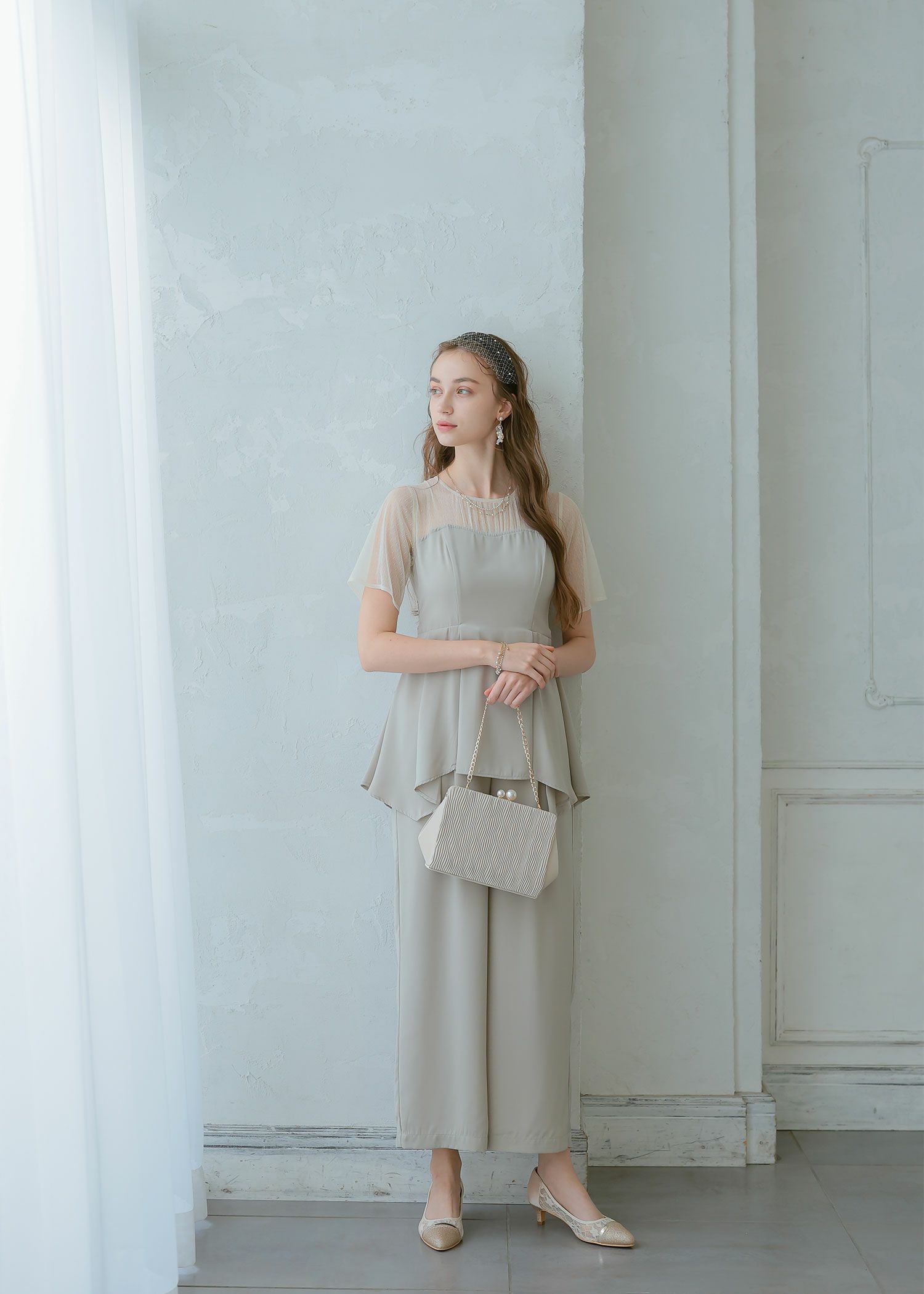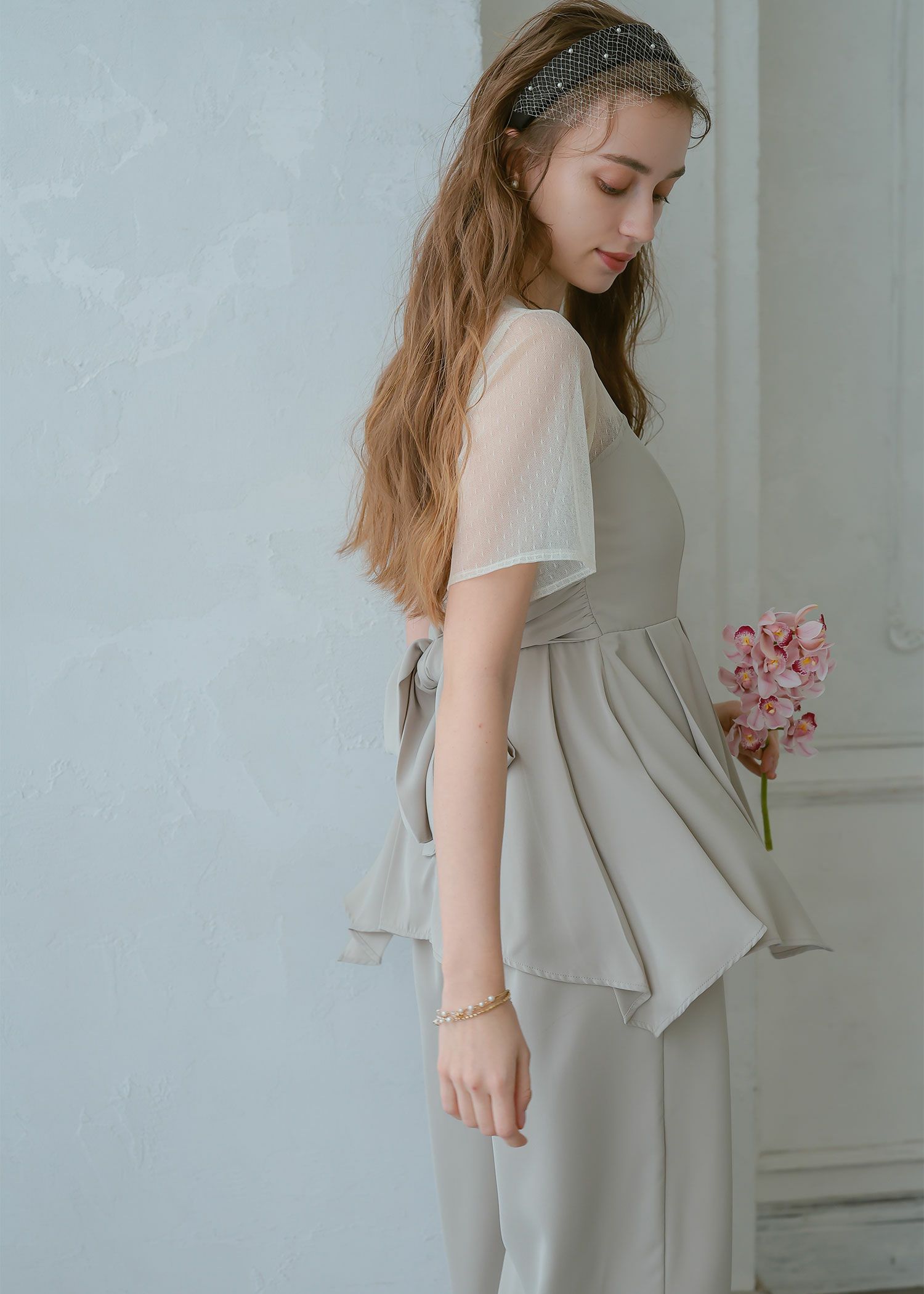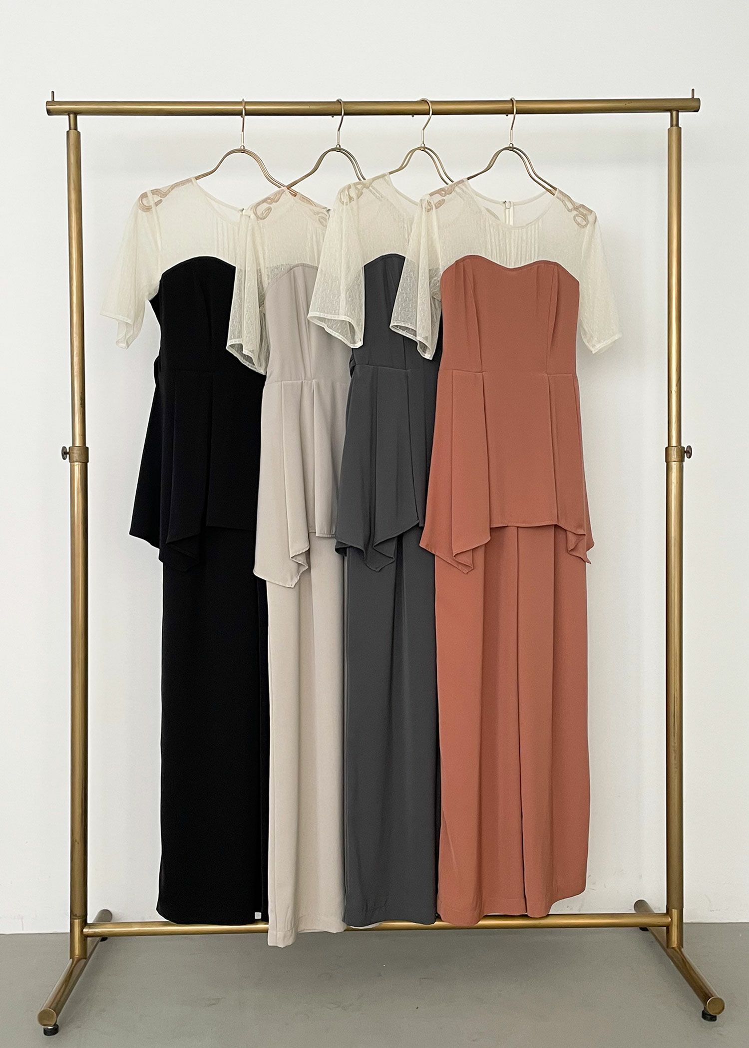 商品説明 ペプラムデザインが程よいフェミニンさを感じさせてくれるパンツドレス ペプラムデザインはウエスト周りの体形カバーにもなり、スタイルアップ効果があるのも嬉しいポイント。 さらに、ウエスト部分はリボンを後ろで結ぶデザインとなっており、 ウエストを引き締まって見せてくれる上、後ろ姿の可愛らしさもプラスしてくれます。 後ろ身頃部分にはゴムシャーリングを施し、着心地も楽ちん♪ デコルテや袖部分はシアーなチュール素材を使用することで、軽やかさと女性らしさをプラス。 本体部分には微光沢のとろみサテンを使用しており、上品でドレッシーな雰囲気に仕上げました。 クールな印象のパンツドレスに、フェミニンな要素を絶妙にプラスした、 カッコよさと可愛らしさのいいとこ取りのドレスです♪ パンツドレス初心者の方にもおすすめな1点です! ※ハンガー掛けの商品画像が実際の商品のお色味に近くなっております。 ※商品画像は、光の当たり具合やパソコンなどの閲覧環境により、 実際の色味と異なって見える場合がございます。予めご了承ください。 外国人モデル着用サイズ 172cm/Mサイズ 日本人モデル着用サイズ 160cm/158㎝ Mサイズ(オレンジ) 日本人モデル着用サイズ 166cm/165㎝ Mサイズ(チャコール※販売終了) 日本人モデル着用サイズ 160cm Mサイズ(ブラック※販売終了) 日本人モデル着用サイズ 158cm Mサイズ(ベージュ) おすすめのシーン 結婚式・披露宴・二次会・同窓会・謝恩会など 多様なシーンのコーディネートに使えます。 商品詳細 【備考】 ・デコルテ部分透け感あり ・その他透け感なし ・伸縮性なし ・後ろ身頃ゴムシャーリング部分伸縮性あり ・後ろ中心ファスナー 洗濯方法:クリーニング店にご相談ください。 ※その他お取り扱いに関しましては、商品に付属のアテンションタグをご覧ください。 原産国:中国 お問い合わせ品番:24914 着用モデル身長172cm