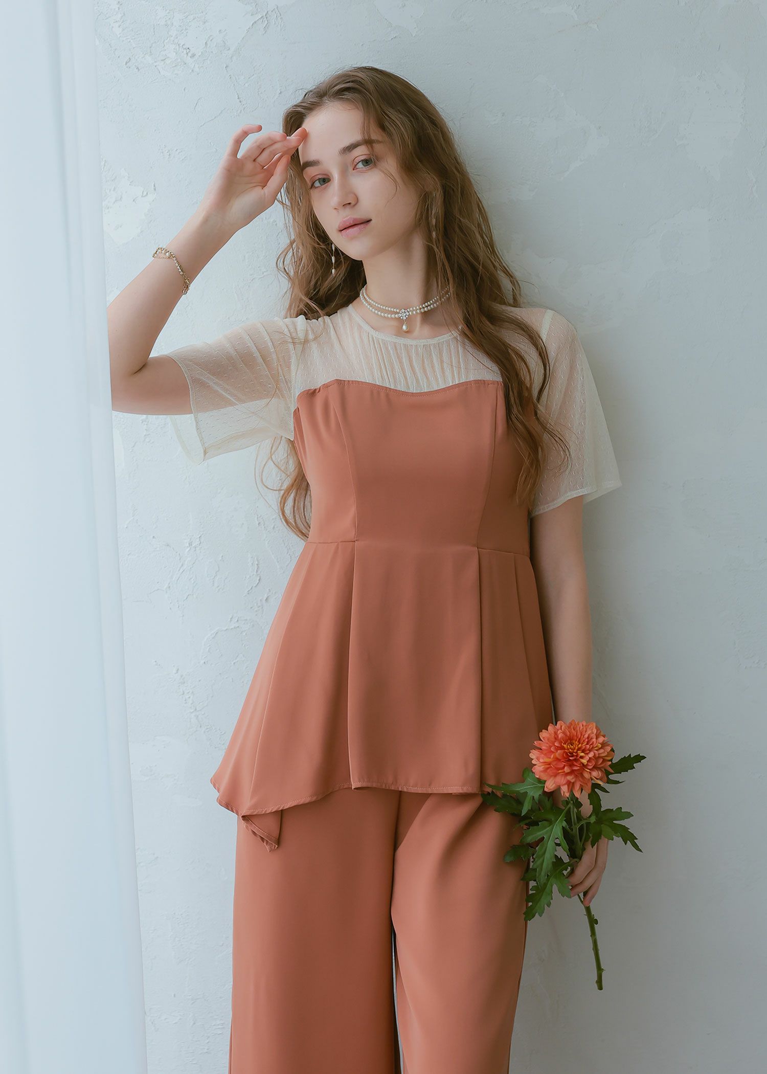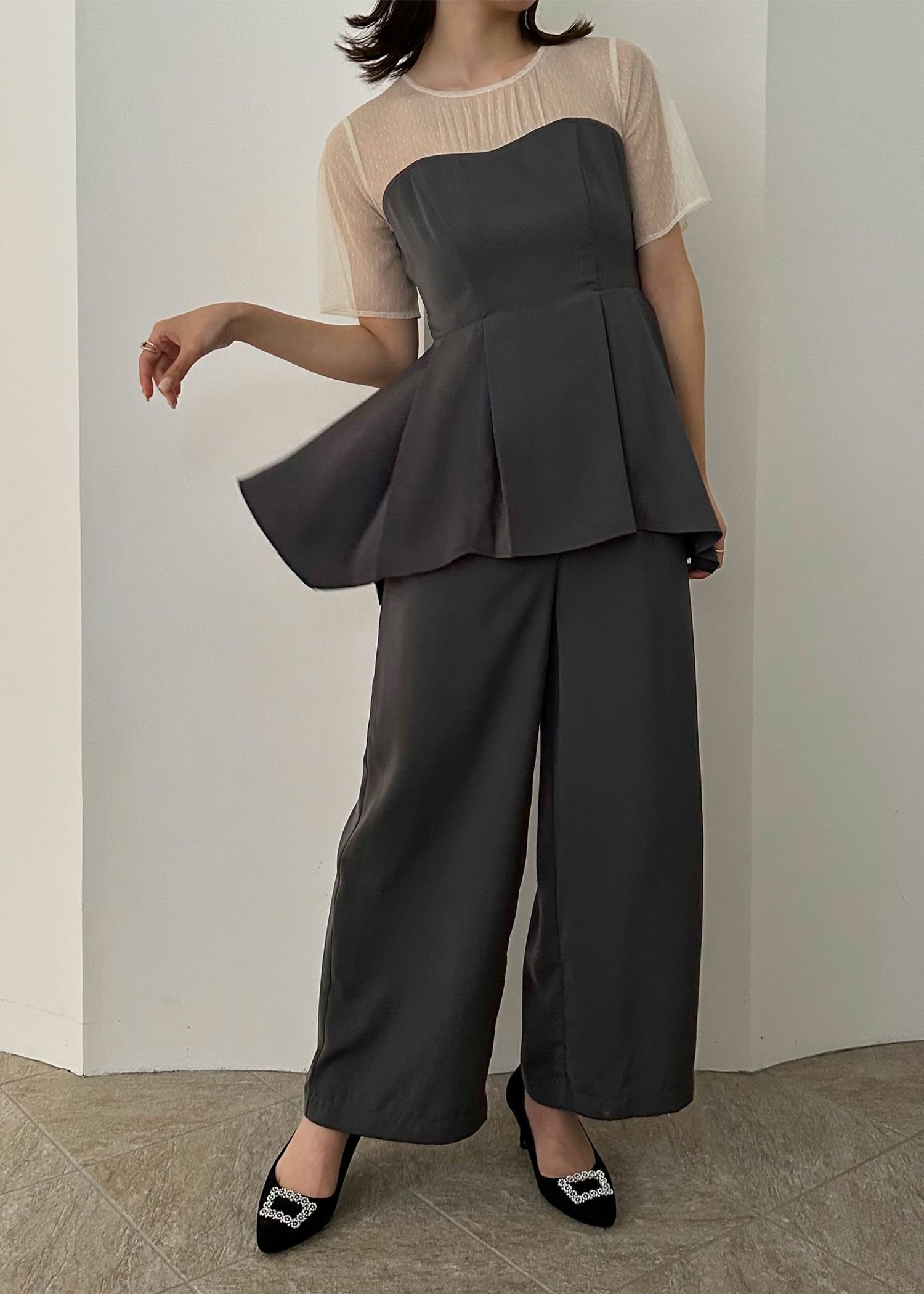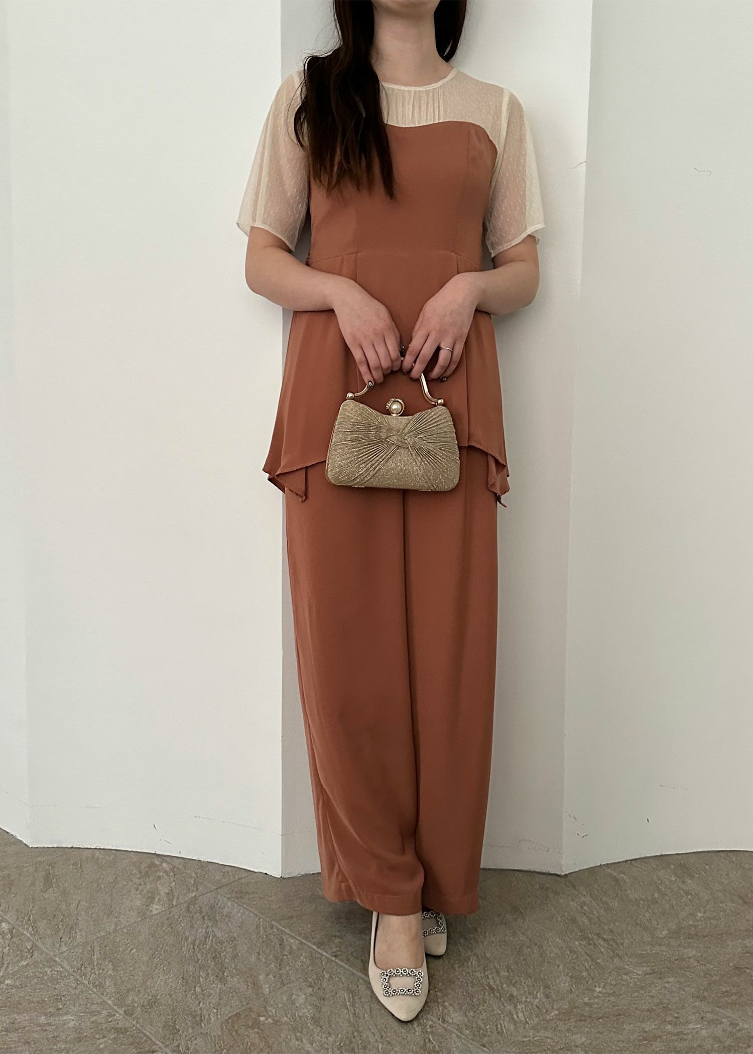 商品説明 ペプラムデザインが程よいフェミニンさを感じさせてくれるパンツドレス ペプラムデザインはウエスト周りの体形カバーにもなり、スタイルアップ効果があるのも嬉しいポイント。 さらに、ウエスト部分はリボンを後ろで結ぶデザインとなっており、 ウエストを引き締まって見せてくれる上、後ろ姿の可愛らしさもプラスしてくれます。 後ろ身頃部分にはゴムシャーリングを施し、着心地も楽ちん♪ デコルテや袖部分はシアーなチュール素材を使用することで、軽やかさと女性らしさをプラス。 本体部分には微光沢のとろみサテンを使用しており、上品でドレッシーな雰囲気に仕上げました。 クールな印象のパンツドレスに、フェミニンな要素を絶妙にプラスした、 カッコよさと可愛らしさのいいとこ取りのドレスです♪ パンツドレス初心者の方にもおすすめな1点です! ※ハンガー掛けの商品画像が実際の商品のお色味に近くなっております。 ※商品画像は、光の当たり具合やパソコンなどの閲覧環境により、 実際の色味と異なって見える場合がございます。予めご了承ください。 外国人モデル着用サイズ 172cm/Mサイズ 日本人モデル着用サイズ 160cm/158㎝ Mサイズ(オレンジ) 日本人モデル着用サイズ 166cm/165㎝ Mサイズ(チャコール※販売終了) 日本人モデル着用サイズ 160cm Mサイズ(ブラック※販売終了) 日本人モデル着用サイズ 158cm Mサイズ(ベージュ) おすすめのシーン 結婚式・披露宴・二次会・同窓会・謝恩会など 多様なシーンのコーディネートに使えます。 商品詳細 【備考】 ・デコルテ部分透け感あり ・その他透け感なし ・伸縮性なし ・後ろ身頃ゴムシャーリング部分伸縮性あり ・後ろ中心ファスナー 洗濯方法:クリーニング店にご相談ください。 ※その他お取り扱いに関しましては、商品に付属のアテンションタグをご覧ください。 原産国:中国 お問い合わせ品番:24914 着用モデル身長172cm 着丈肩幅バストウエストヒップ袖丈 M13635.58874--24 単位(cm) 着用モデル身長172cm モデルはすべてMサイズ着用 お問い合わせ品番:25214 着丈ガイド REVIEW レビュー