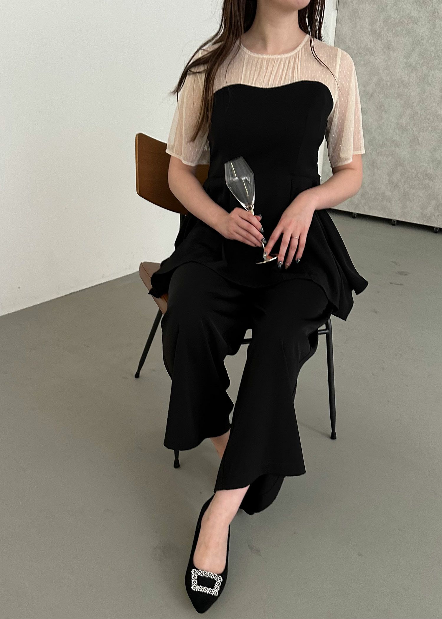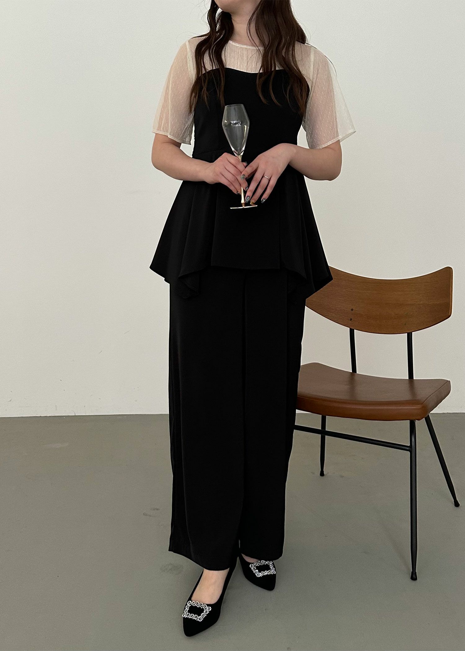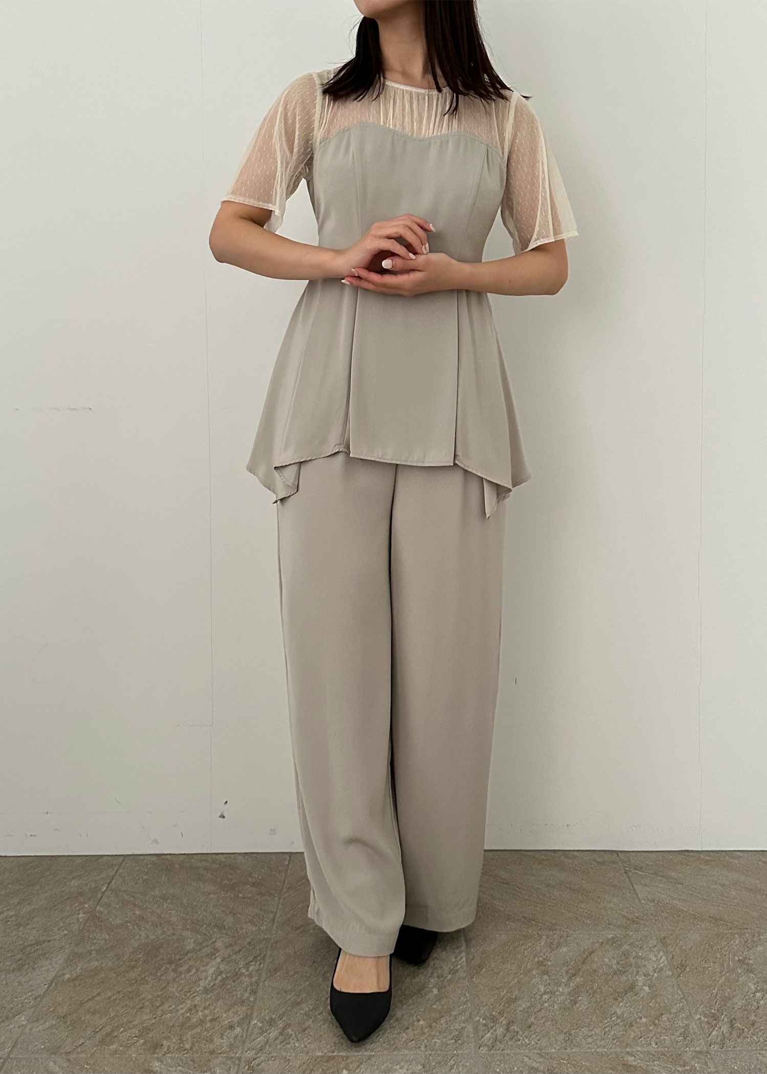 商品説明 ペプラムデザインが程よいフェミニンさを感じさせてくれるパンツドレス ペプラムデザインはウエスト周りの体形カバーにもなり、スタイルアップ効果があるのも嬉しいポイント。 さらに、ウエスト部分はリボンを後ろで結ぶデザインとなっており、 ウエストを引き締まって見せてくれる上、後ろ姿の可愛らしさもプラスしてくれます。 後ろ身頃部分にはゴムシャーリングを施し、着心地も楽ちん♪ デコルテや袖部分はシアーなチュール素材を使用することで、軽やかさと女性らしさをプラス。 本体部分には微光沢のとろみサテンを使用しており、上品でドレッシーな雰囲気に仕上げました。 クールな印象のパンツドレスに、フェミニンな要素を絶妙にプラスした、 カッコよさと可愛らしさのいいとこ取りのドレスです♪ パンツドレス初心者の方にもおすすめな1点です! ※ハンガー掛けの商品画像が実際の商品のお色味に近くなっております。 ※商品画像は、光の当たり具合やパソコンなどの閲覧環境により、 実際の色味と異なって見える場合がございます。予めご了承ください。 外国人モデル着用サイズ 172cm/Mサイズ 日本人モデル着用サイズ 160cm/158㎝ Mサイズ(オレンジ) 日本人モデル着用サイズ 166cm/165㎝ Mサイズ(チャコール※販売終了) 日本人モデル着用サイズ 160cm Mサイズ(ブラック※販売終了) 日本人モデル着用サイズ 158cm Mサイズ(ベージュ) おすすめのシーン 結婚式・披露宴・二次会・同窓会・謝恩会など 多様なシーンのコーディネートに使えます。 商品詳細 【備考】 ・デコルテ部分透け感あり ・その他透け感なし ・伸縮性なし ・後ろ身頃ゴムシャーリング部分伸縮性あり ・後ろ中心ファスナー 洗濯方法:クリーニング店にご相談ください。 ※その他お取り扱いに関しましては、商品に付属のアテンションタグをご覧ください。 原産国:中国 お問い合わせ品番:24914 着用モデル身長172cm 着丈肩幅バストウエストヒップ袖丈 M13635.58874--24 単位(cm) 着用モデル身長172cm モデルはすべてMサイズ着用 お問い合わせ品番:25214 着丈ガイド REVIEW レビュー