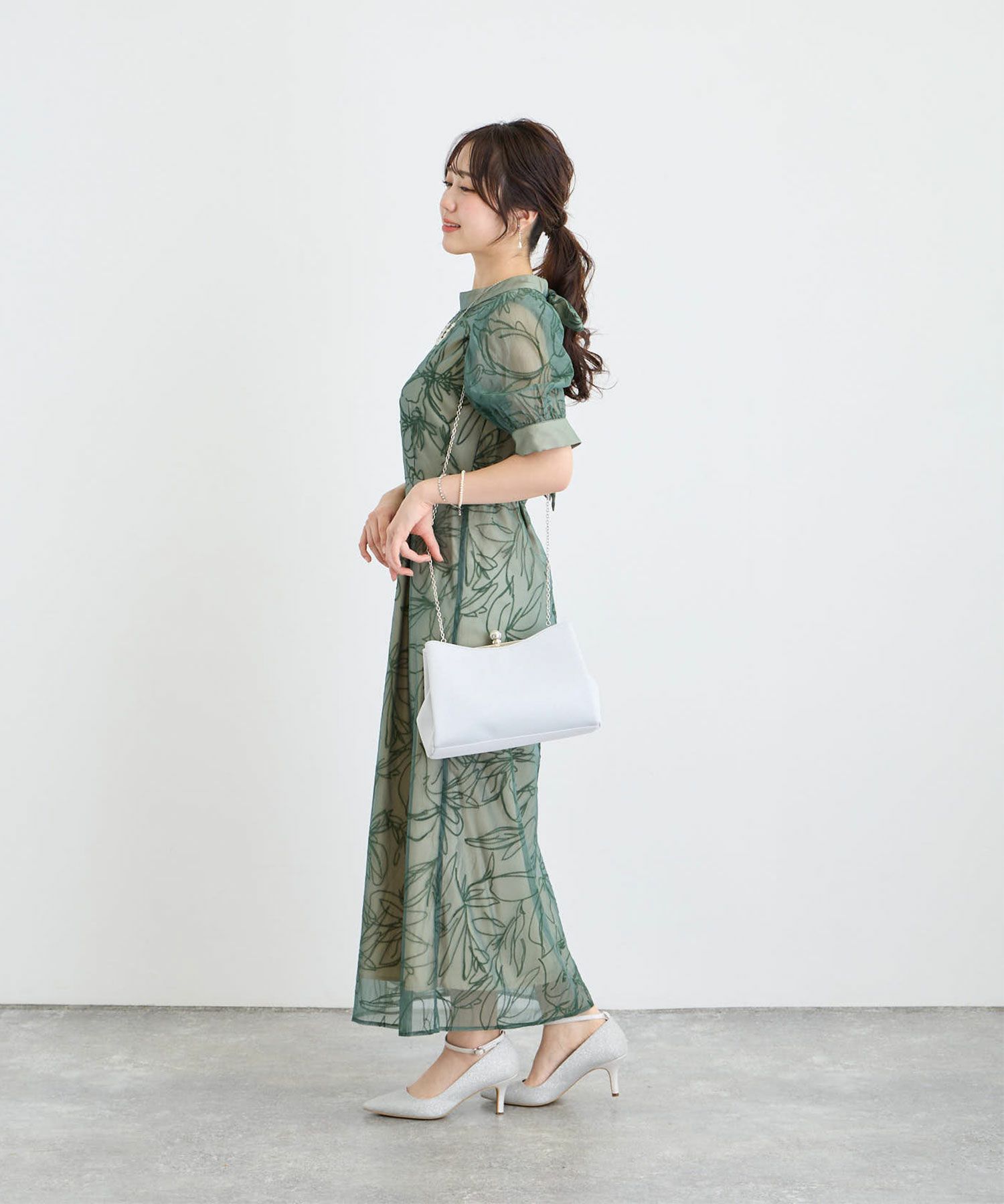 生地には、人気のボウタイボレロセットドレス(商品番号:82658)と共通のフロッキー生地を使用。