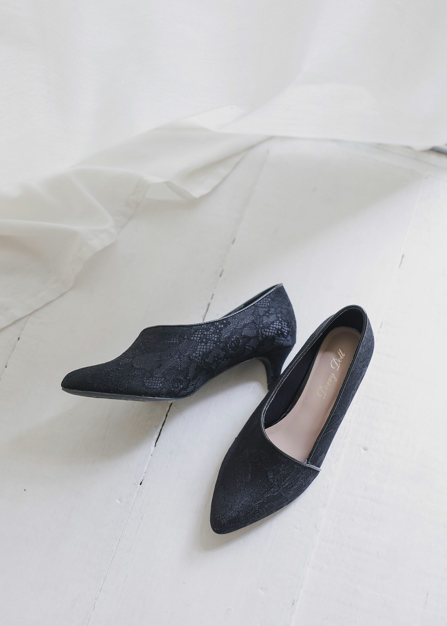 レースの透け感が高級感を漂わせるポインテッドトゥパンプス。