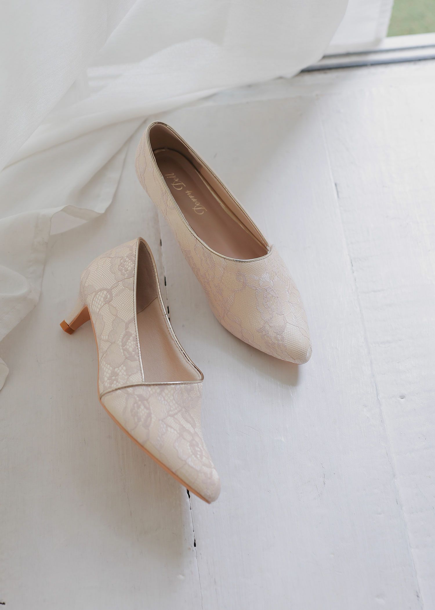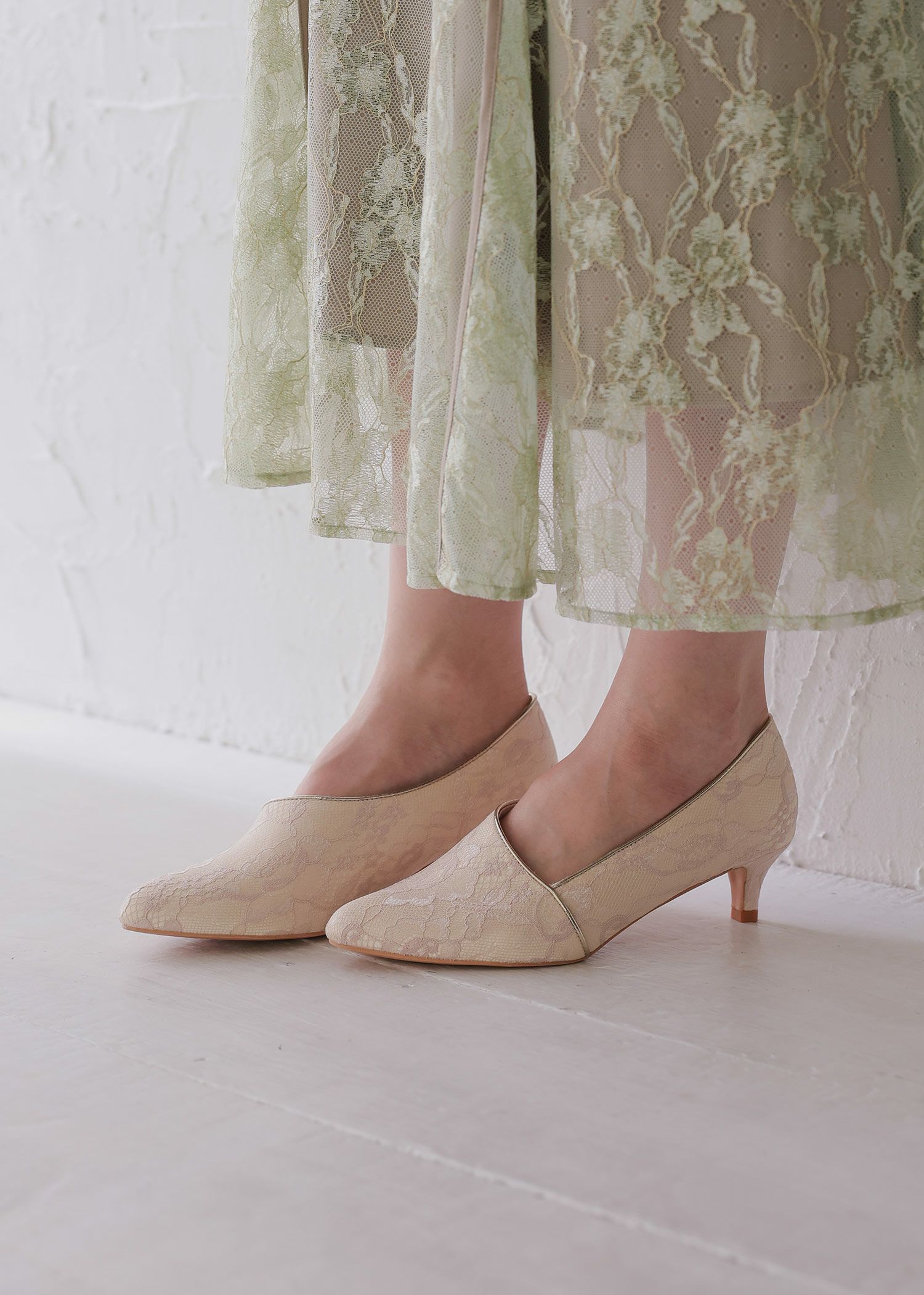 レースの透け感が高級感を漂わせるポインテッドトゥパンプス。