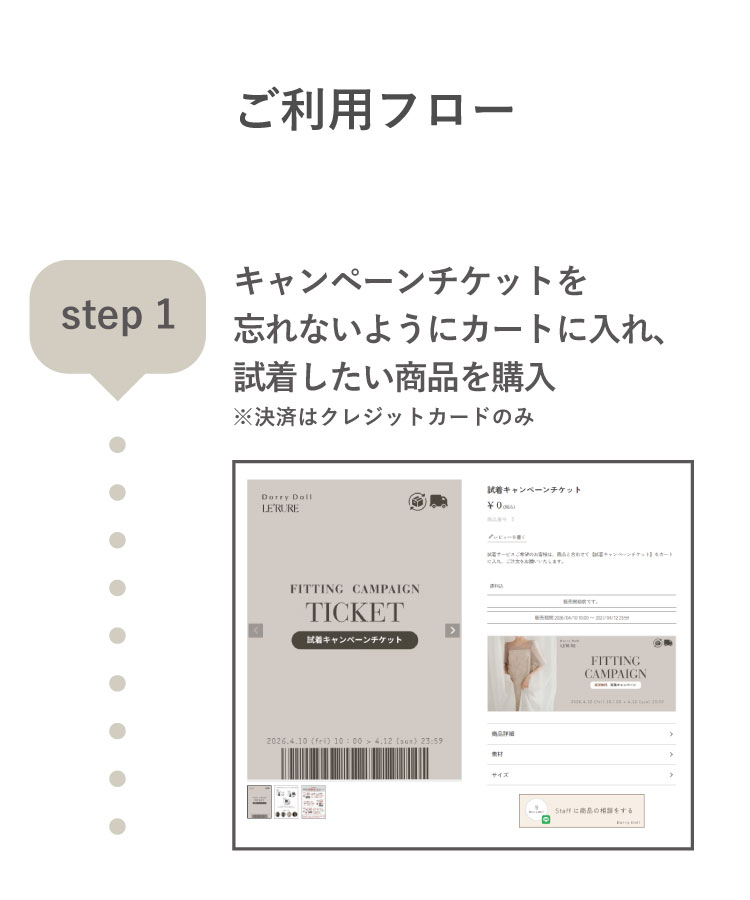 キャンペーンをご利用いただける商品数は最大5点までとなっております。対象アイテムであれば組み合わせも自由です。もちろん、5点以下でもご試着可能です。