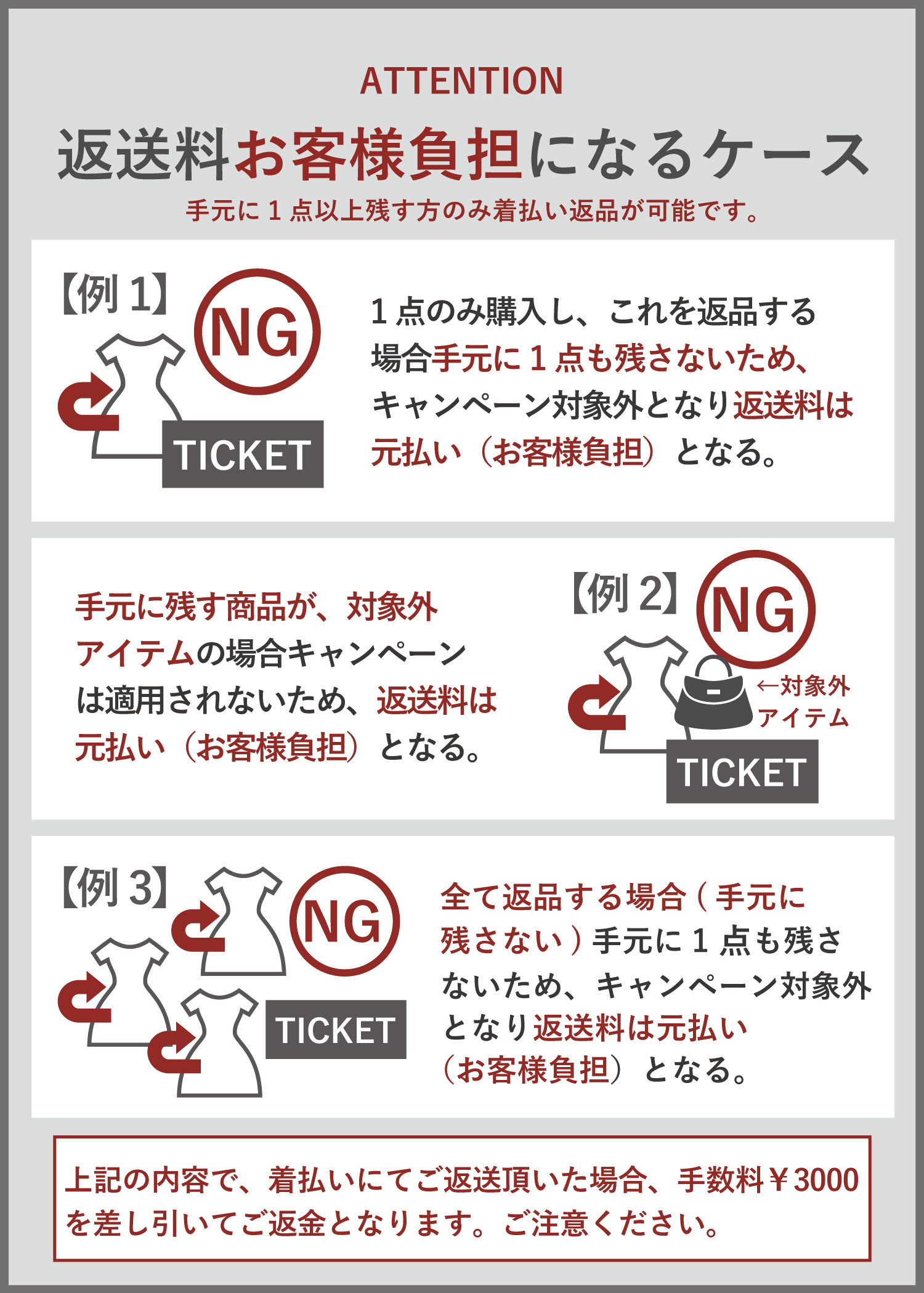 対象外商品も一緒に購入が可能ですが、対象外商品を返品する場合、送料はお客様負担となります。また、対象外商品を手元に残し、試着キャンペーン対象商品を全て返品の場合も送料はお客様ご負担となります。