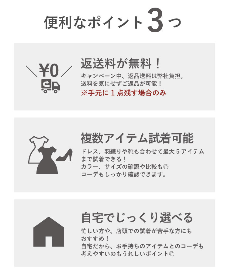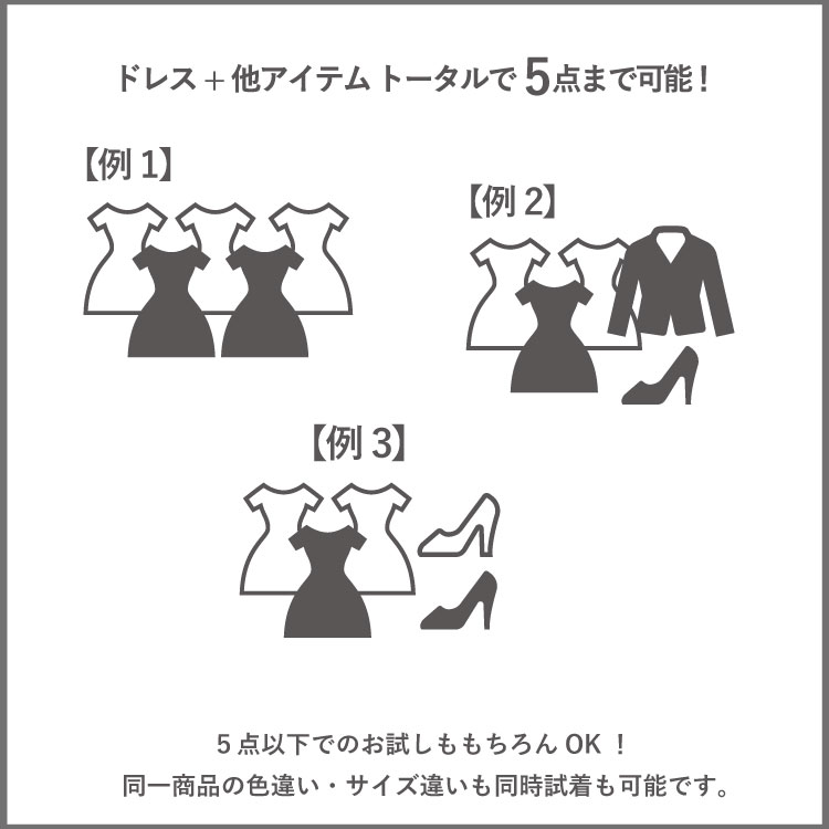 キャンペーンをご利用いただける商品数は最大5点までとなっております。対象アイテムであれば組み合わせも自由です。もちろん、5点以下でもご試着可能です。