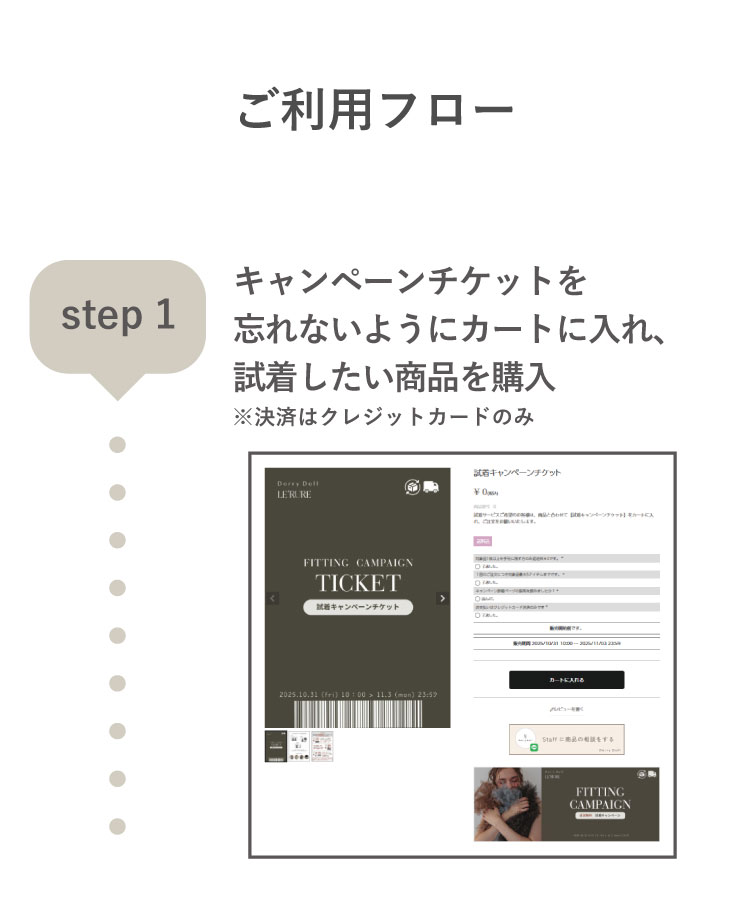 クーポン対象外の商品でも試着キャンペーンのご利用が可能です。ただし、「返品・交換対象外」の商品、「試着キャンペーン対象外」と記載のある商品は、試着キャンペーンをご利用いただけません。